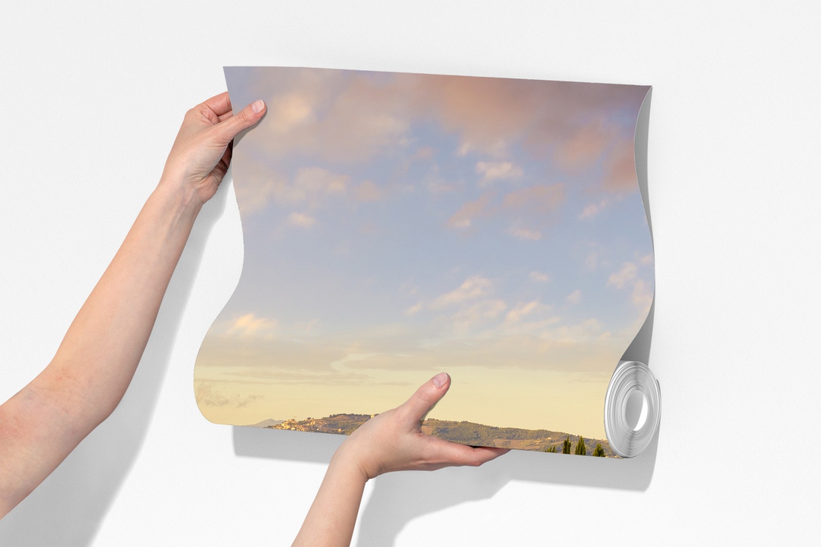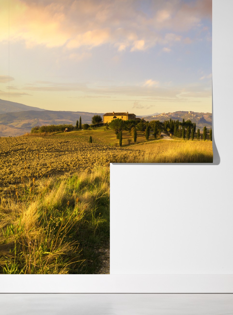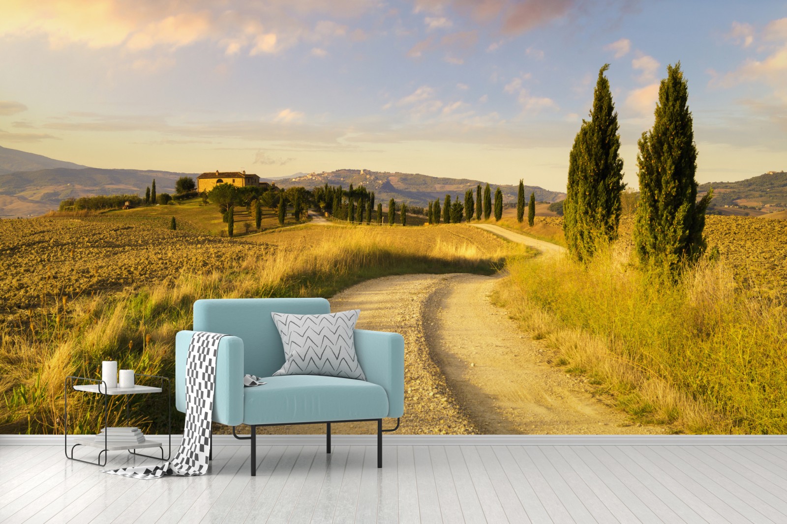 Wprowadź ciepłą, słoneczną atmosferę na ścianę dzięki tej krętej drodze otoczonej wysokimi cyprysami i złocistymi polami.
