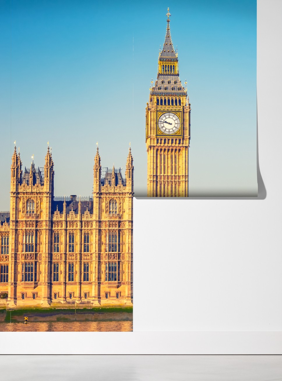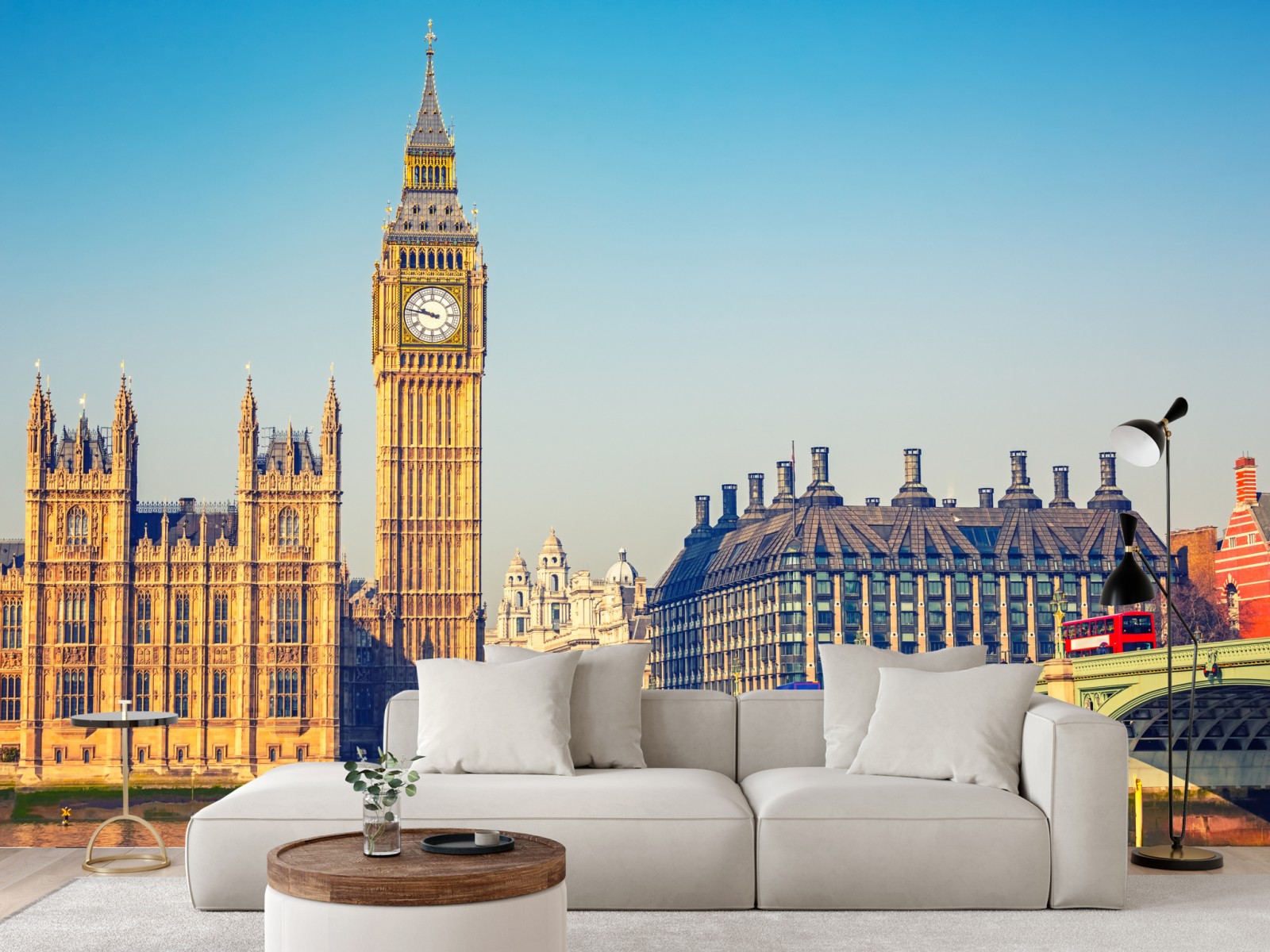 Odkryj ponadczasowy urok Londynu z Big Benem i mostem Westminster uchwycone w ciepłych barwach, idealne do dekoracji ściany.