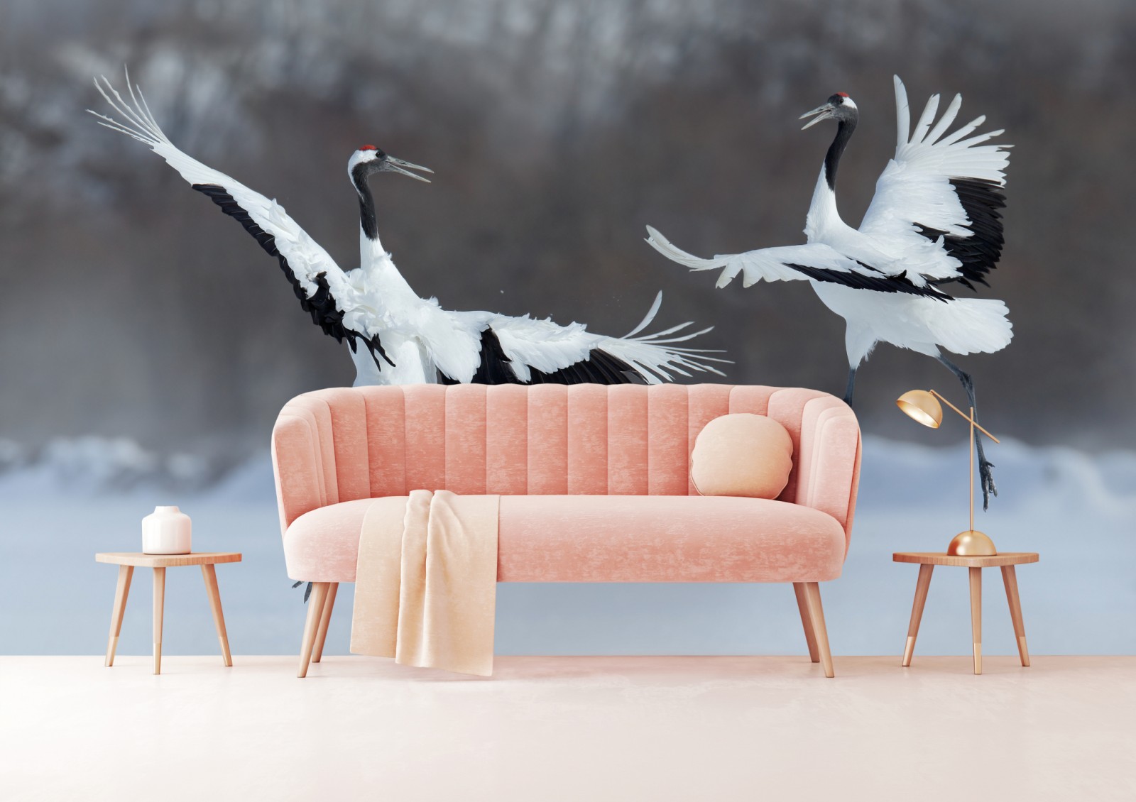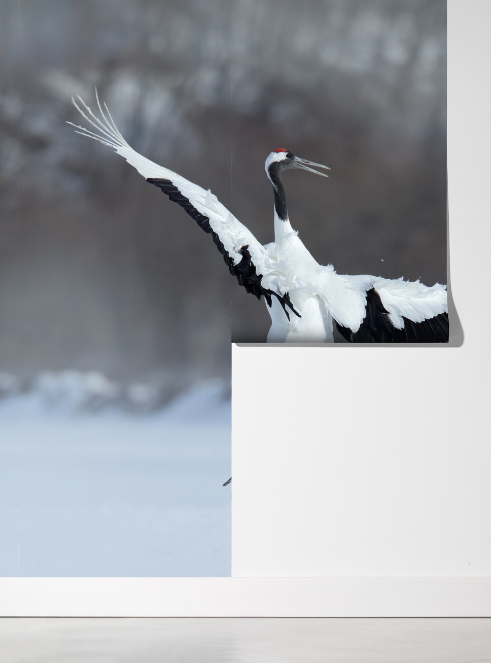 Poczuj elegancję tańczących żurawi koroniastych na śnieżnym tle Hokkaido, idealne do wprowadzenia spokoju i stylu do wnętrza.