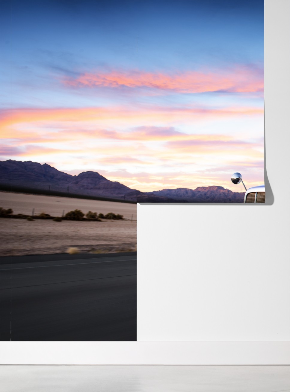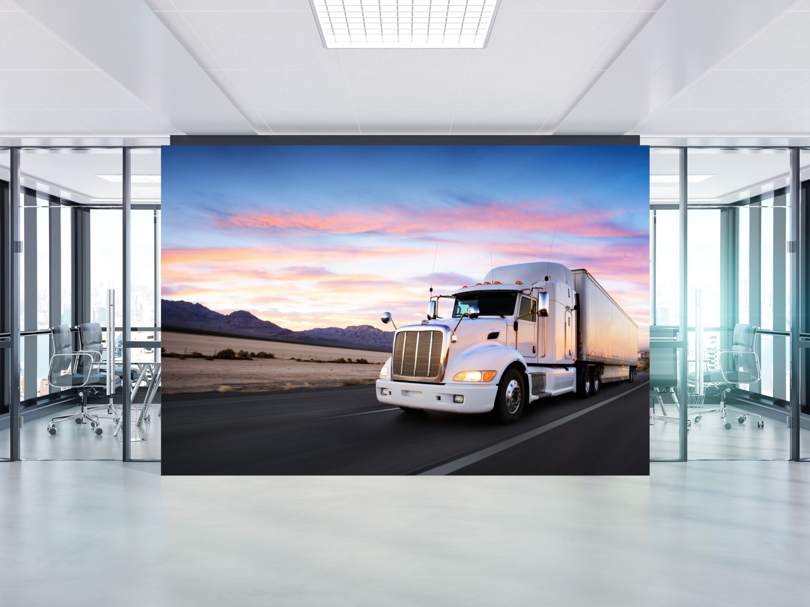 Dodaj dynamiki do wnętrza dzięki temu plakatowi z ciężarówką na tle zachodu słońca.