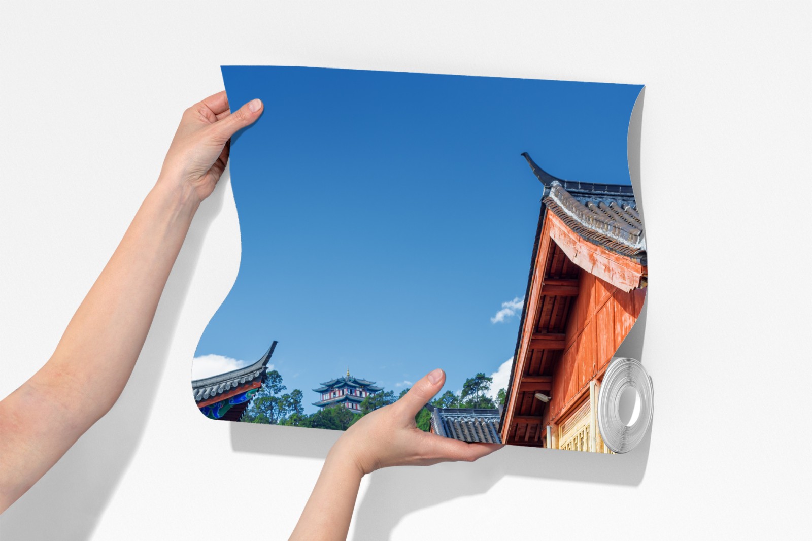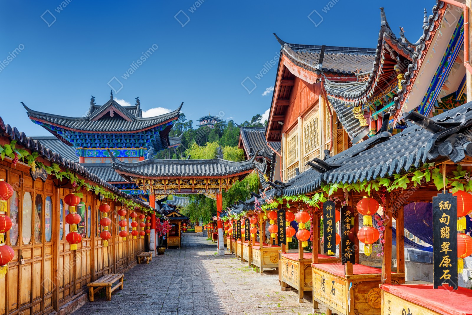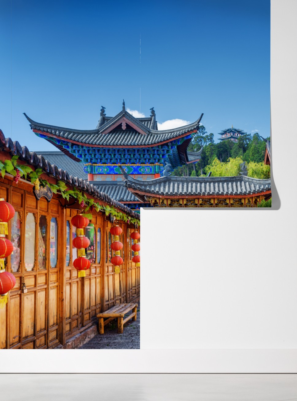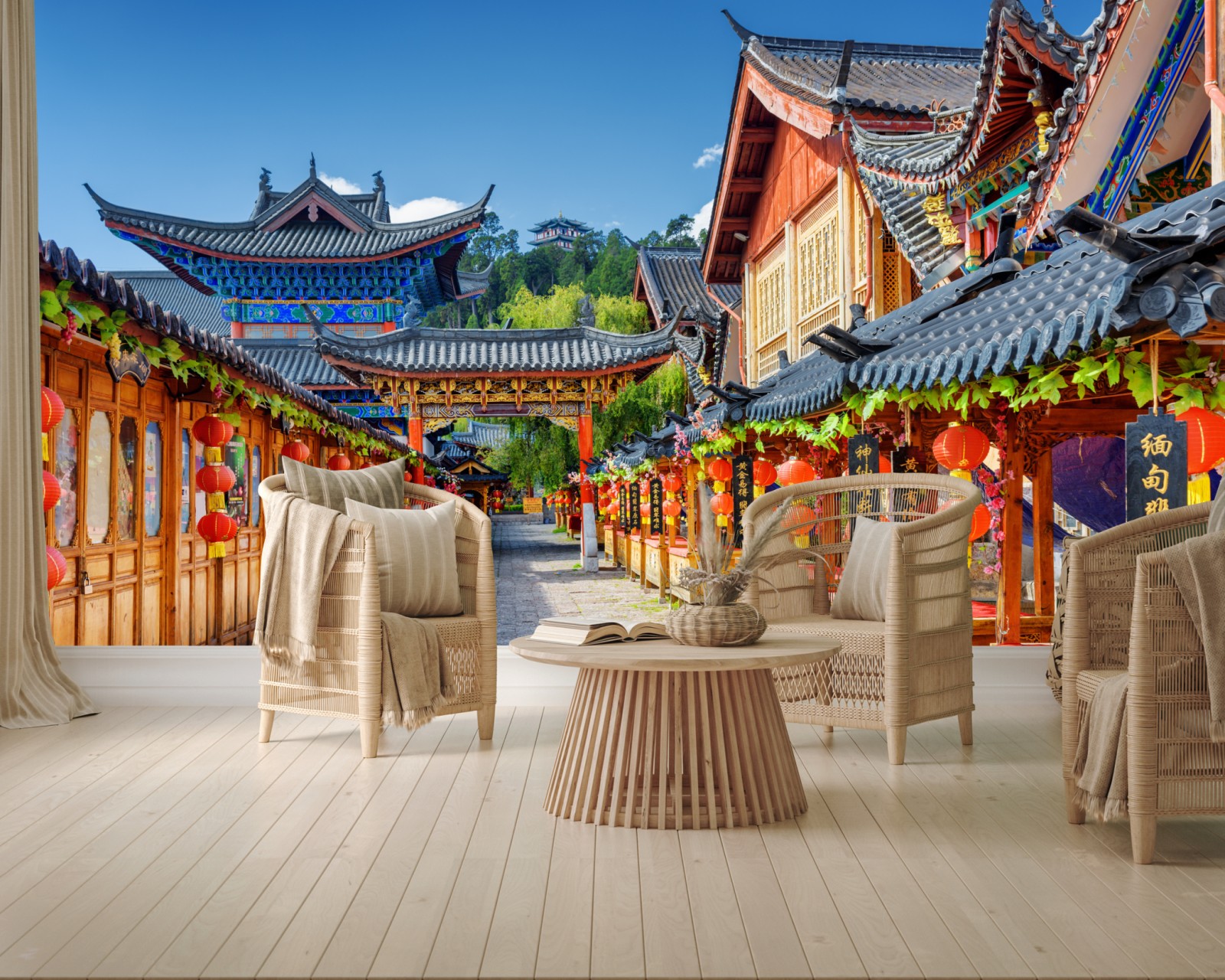 Ożyw swoje wnętrze widokiem z Lijiang: zabytkowa ulica z czerwonymi lampionami i tradycyjną architekturą.