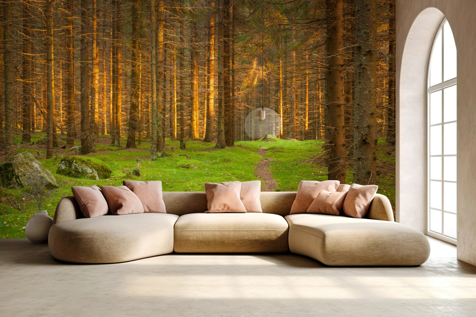Fototapeta Złote światło lesie sosnowym porośniętym mchem