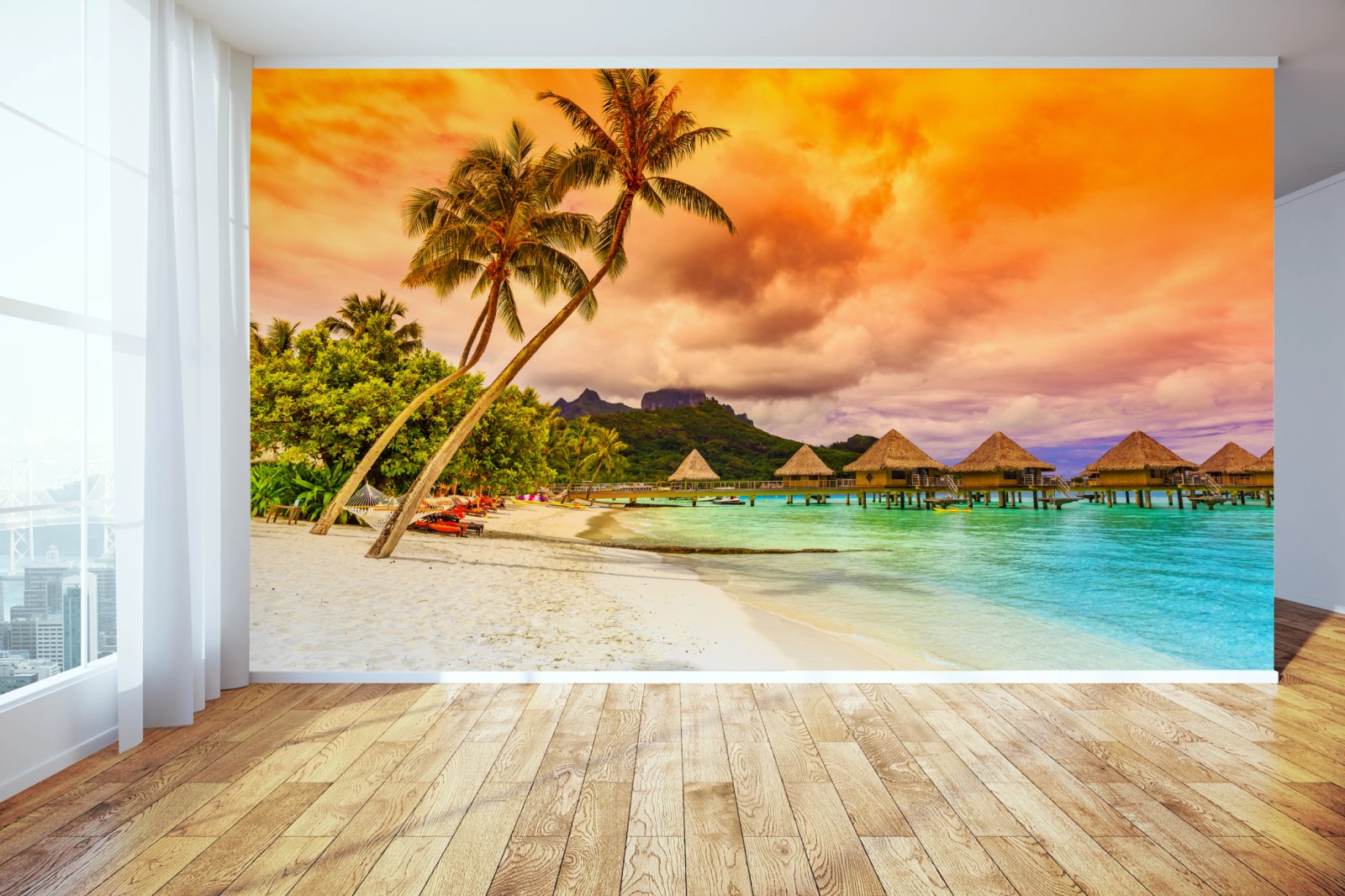 Fototapeta Zachód słońca w Bora Bora nad bungalowami na wodzie