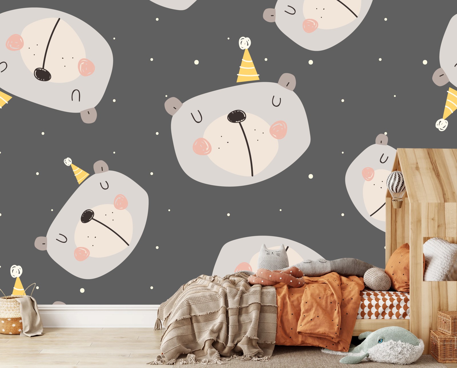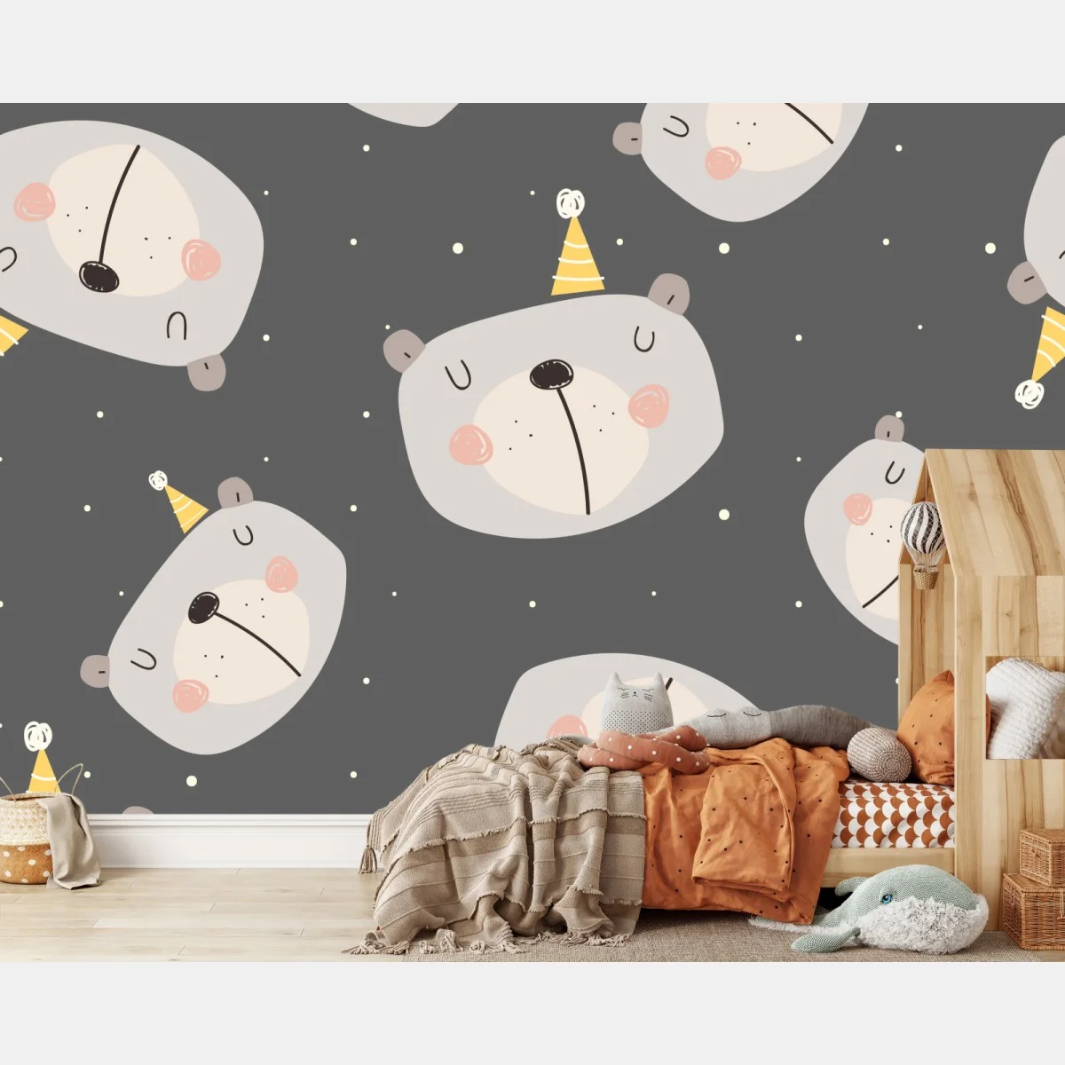 - ilustracja, zwierzęta, pokój dziecięcy, wzór bez szwu, tapeta dziecięca, pastelowe kolory, wzór powtarzalny, uroczy miś, śpiący miś, czapeczka imprezowa