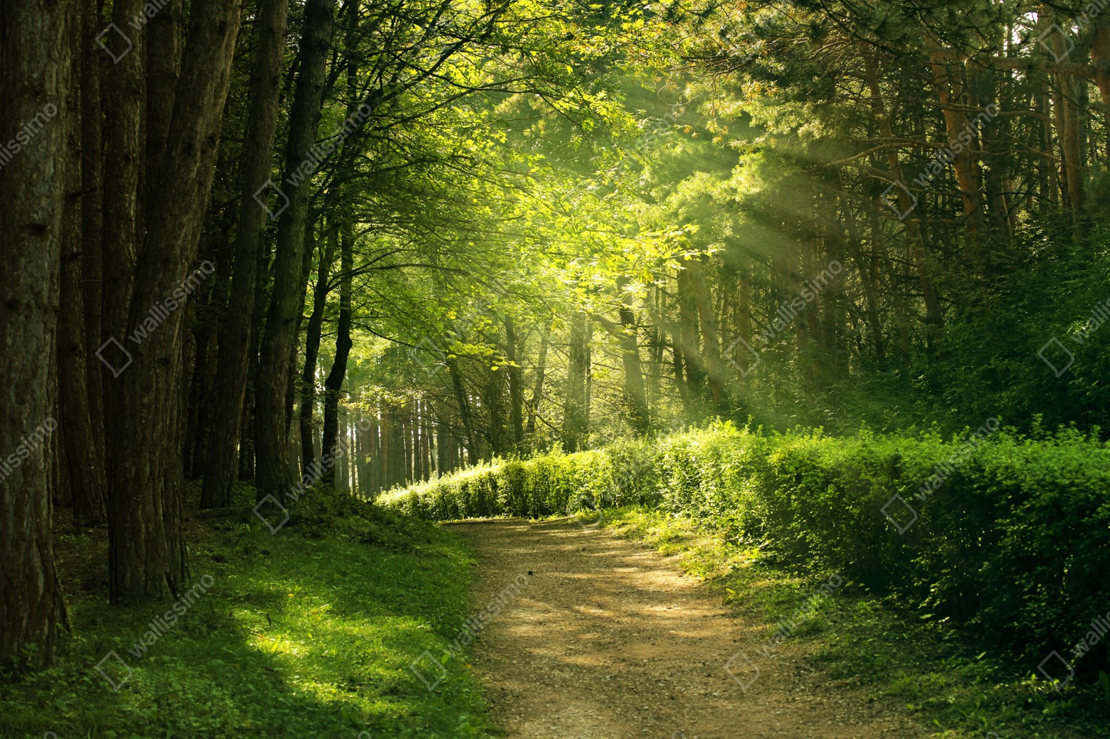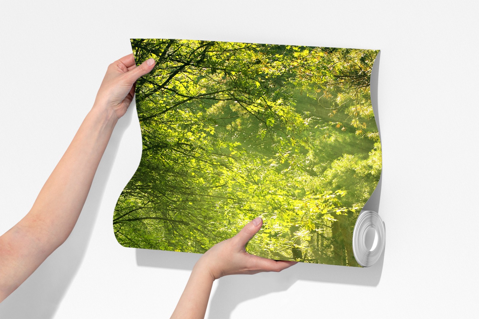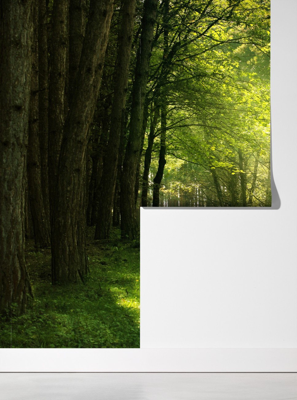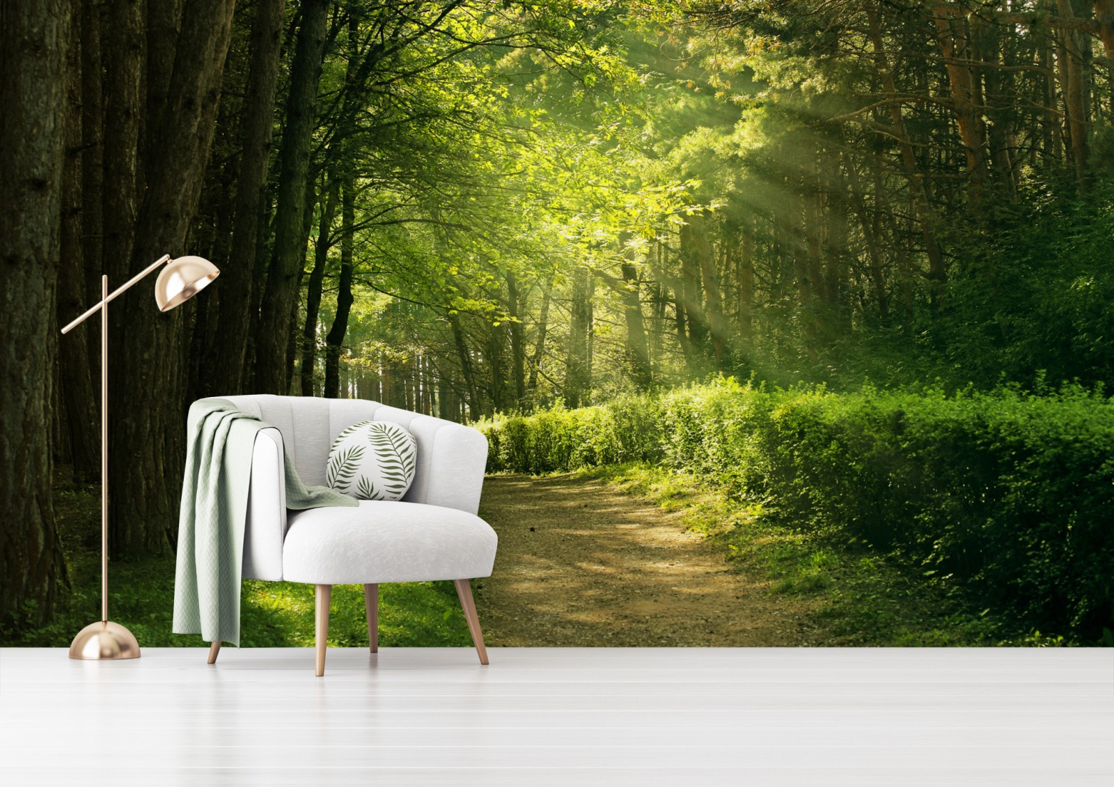 Wprowadź do wnętrza uspokajającą atmosferę zielonego lasu dzięki tej scenerii z leśną ścieżką o słonecznych promieniach.
