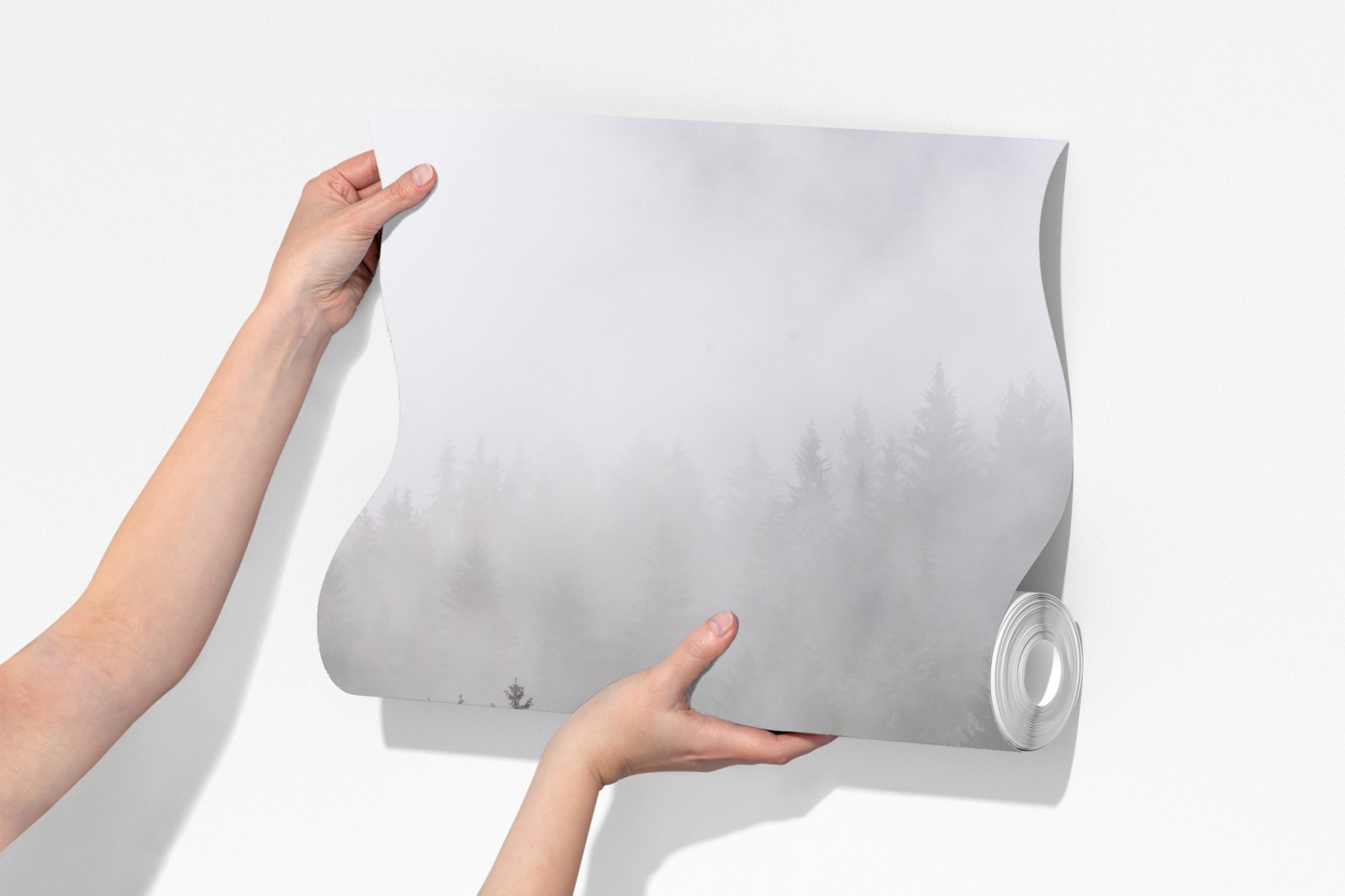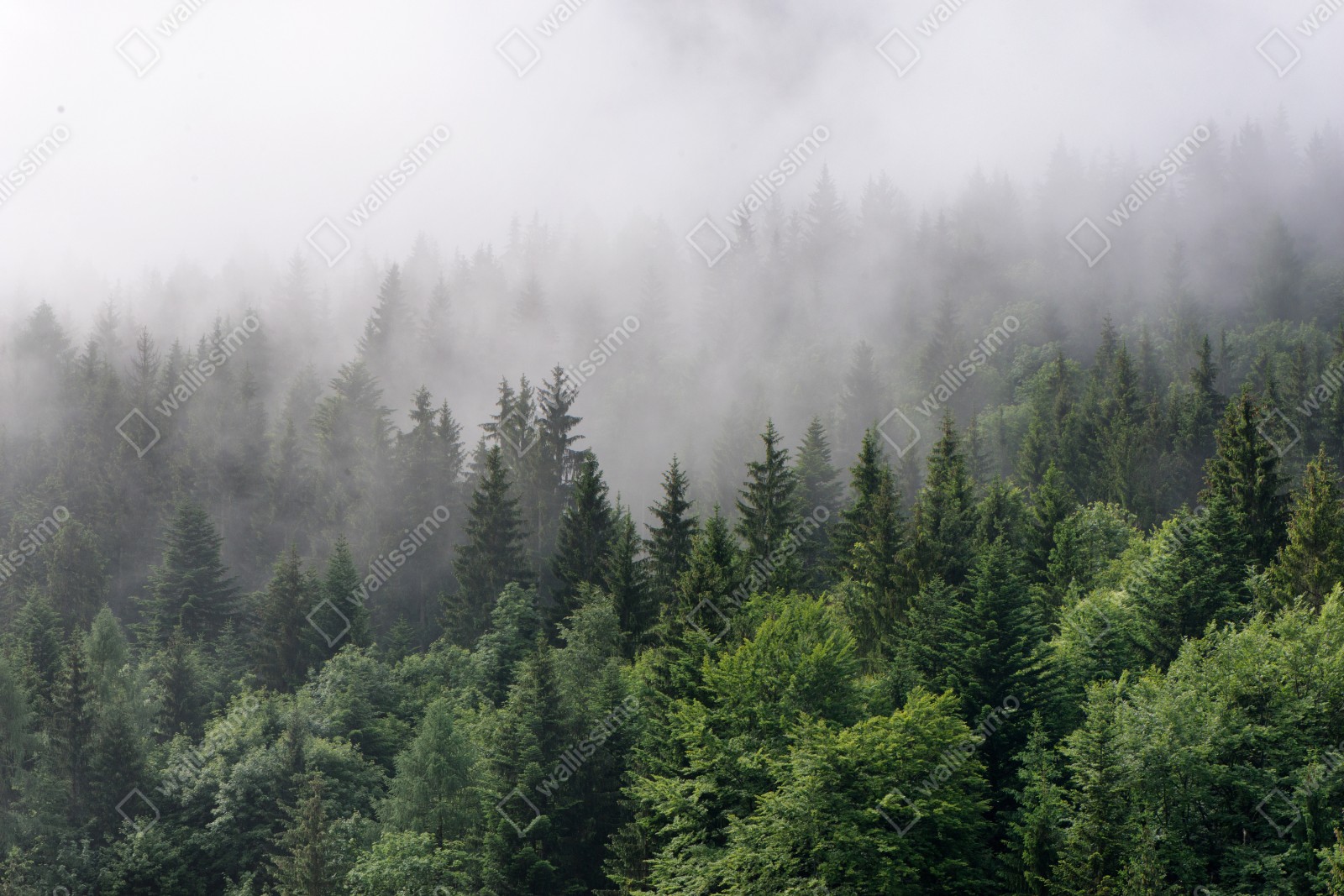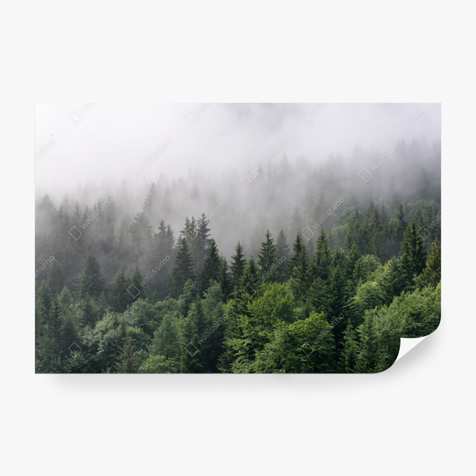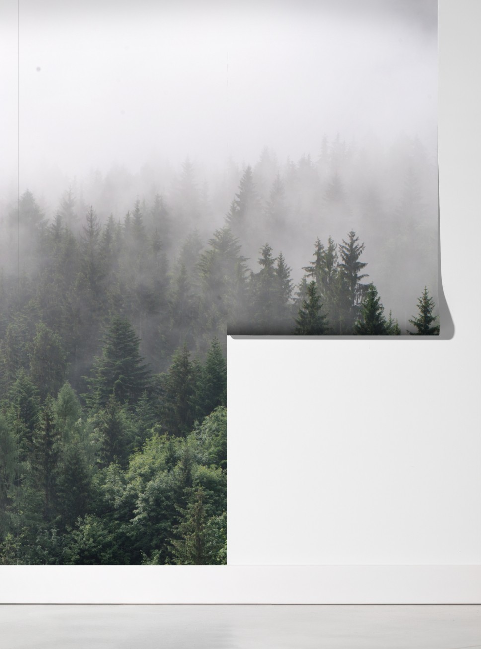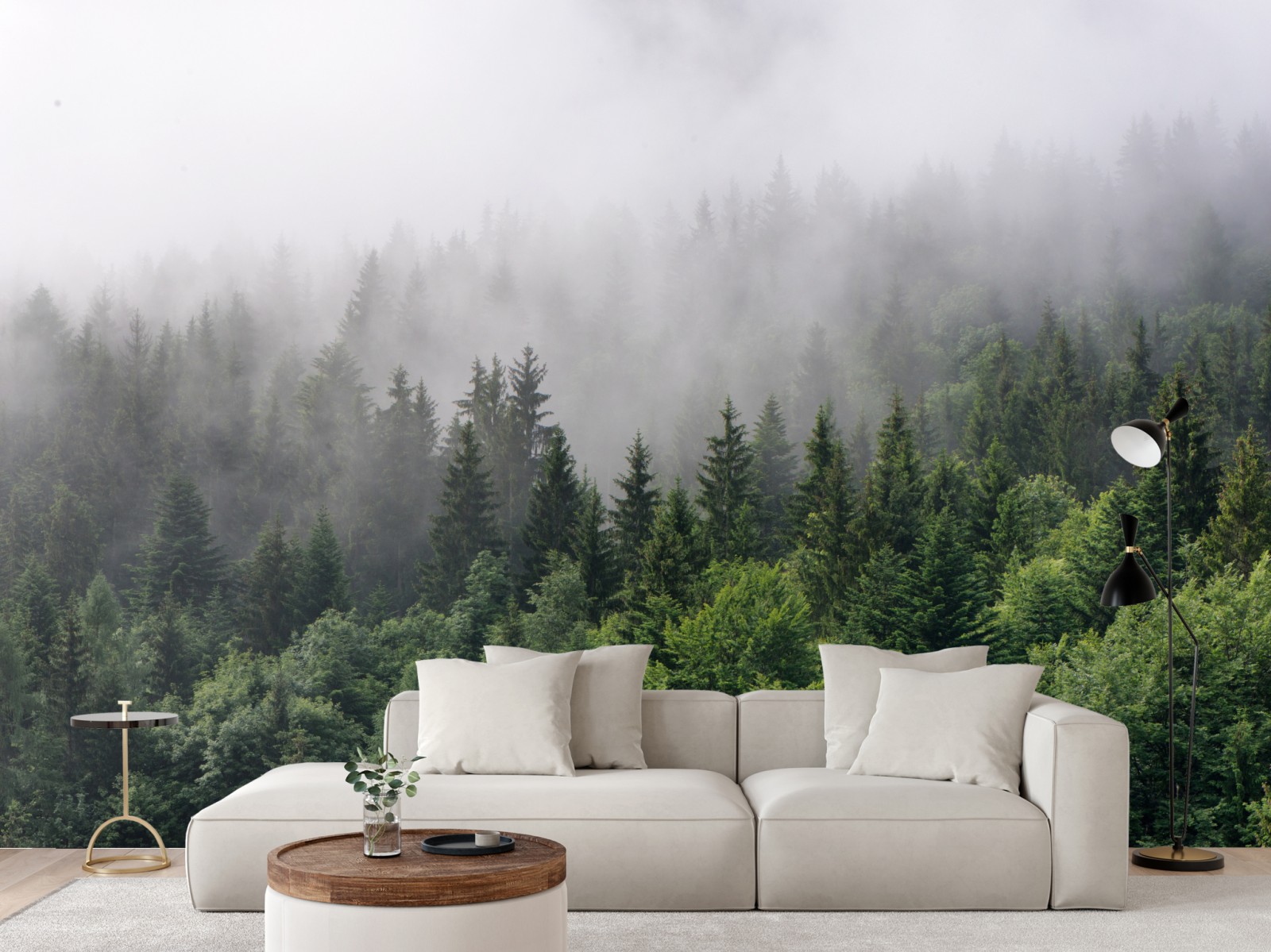 Wprowadź spokój i naturalne piękno do wnętrza dzięki tej mglistej panoramie lasu iglastego, idealnej do stworzenia kojącej atmosfery.