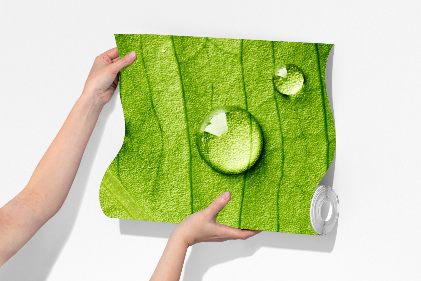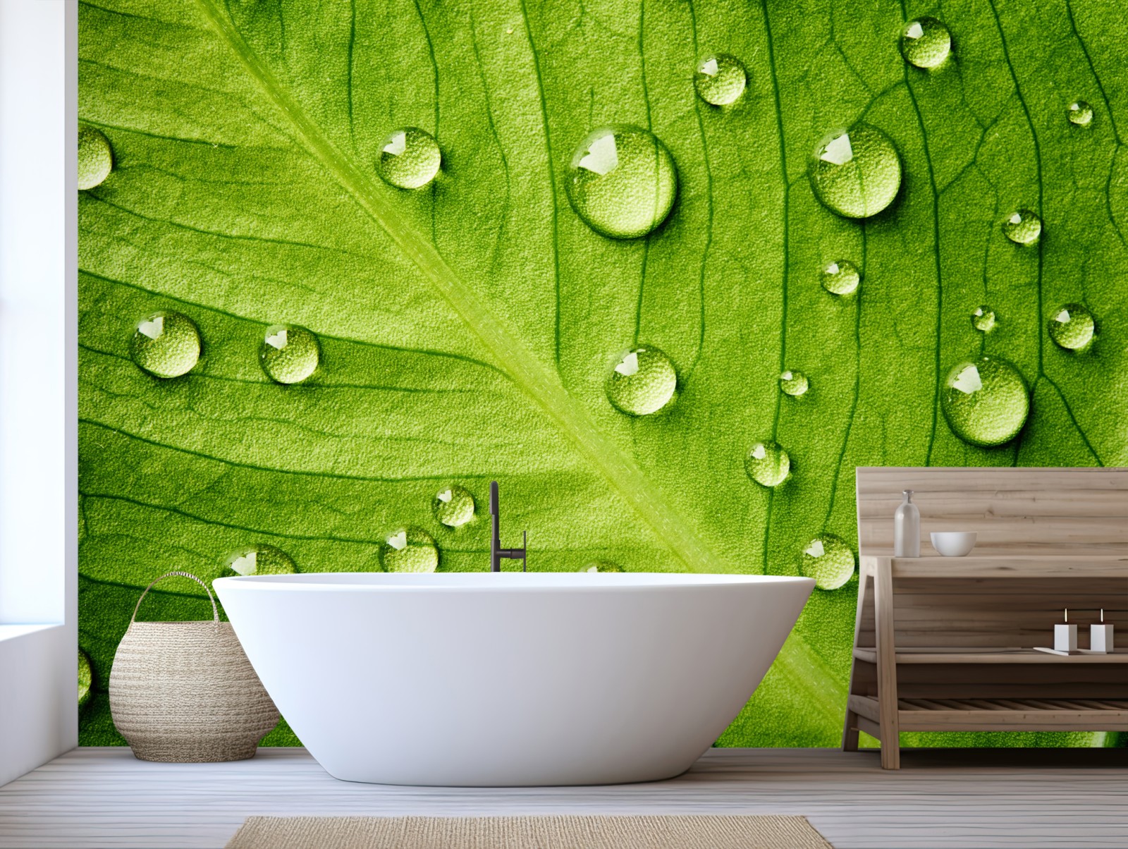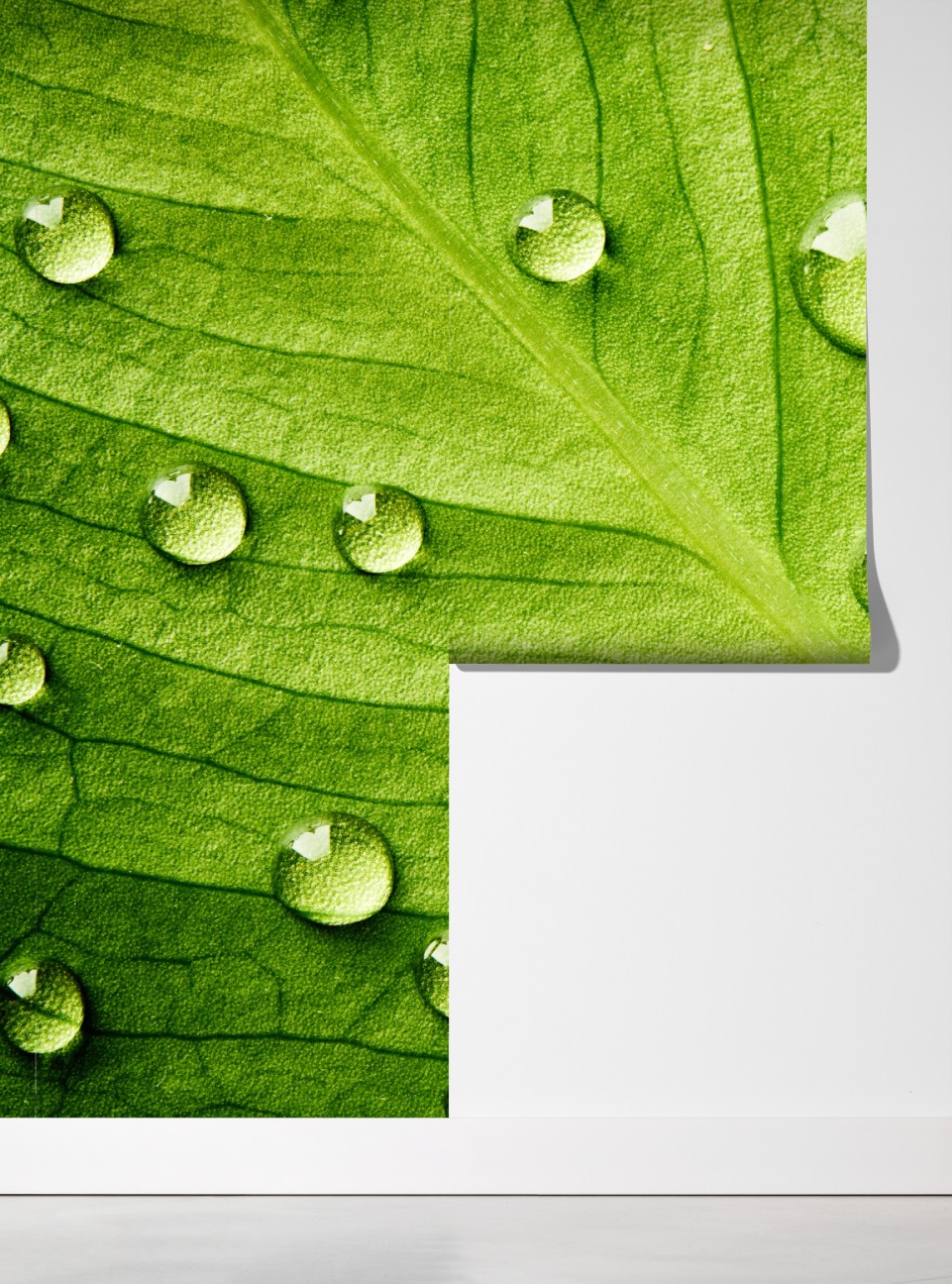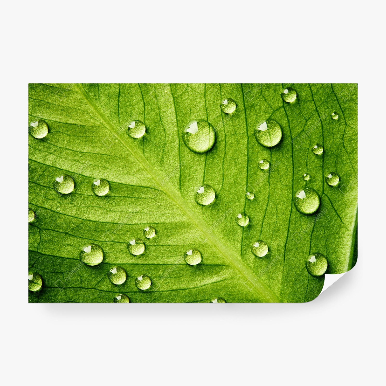 Wprowadź uspokajające piękno natury do swojego wnętrza dzięki zbliżeniu na żywy zielony liść ozdobiony kroplami wody.