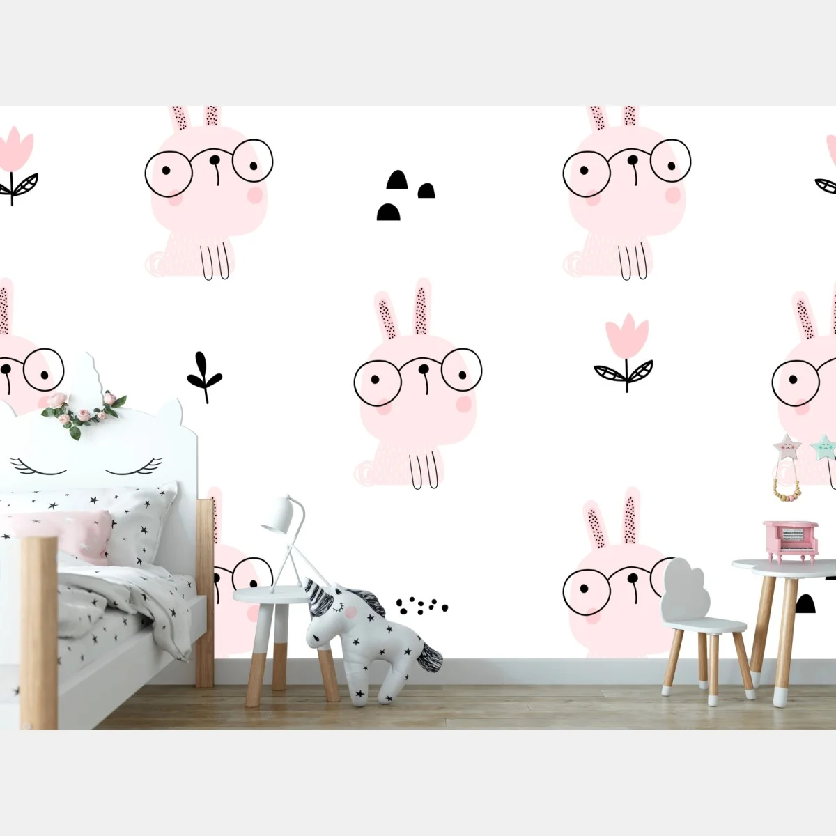 - wzór bezszwowy, tapeta dziecięca, dekoracja pokoju dziecięcego, powtarzalny wzór, pastelowy wzór, słodki króliczek, różowy królik, królik w okularach, kreskówkowe zwierzę, kwiatowe akcenty