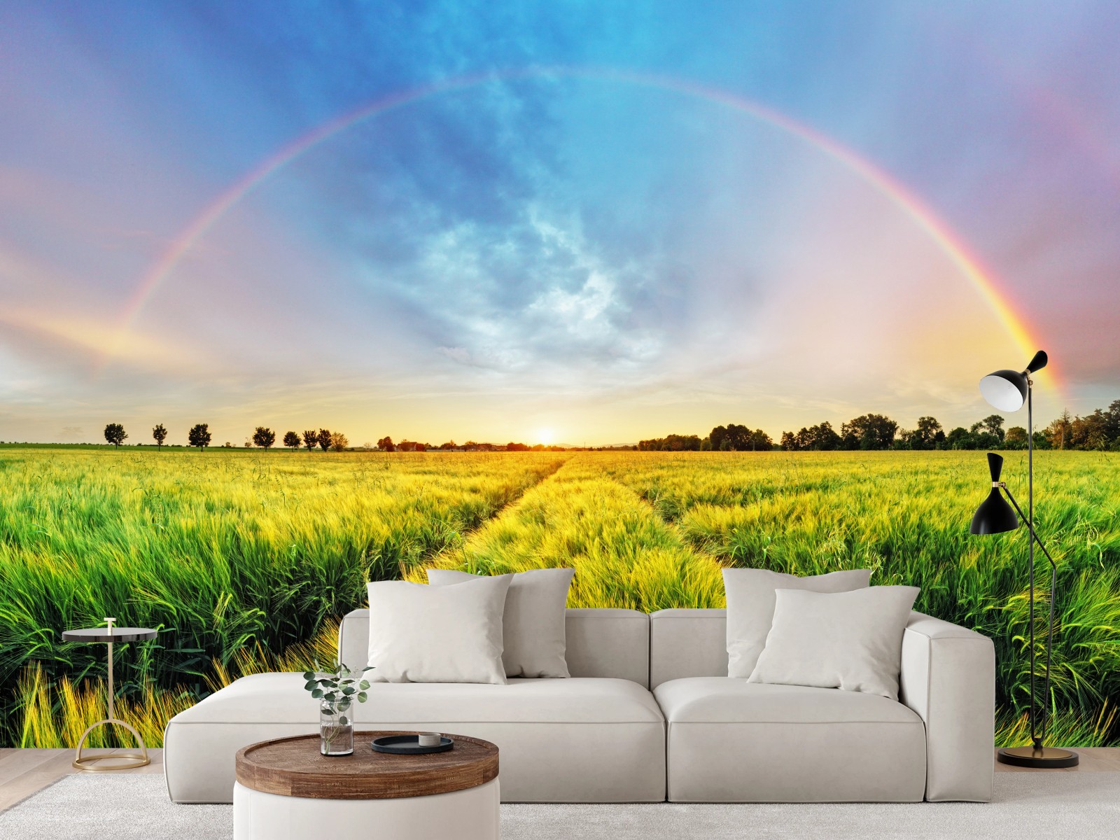 Fototapeta Tęcza nad złotym polem pszenicy o zachodzie słońca