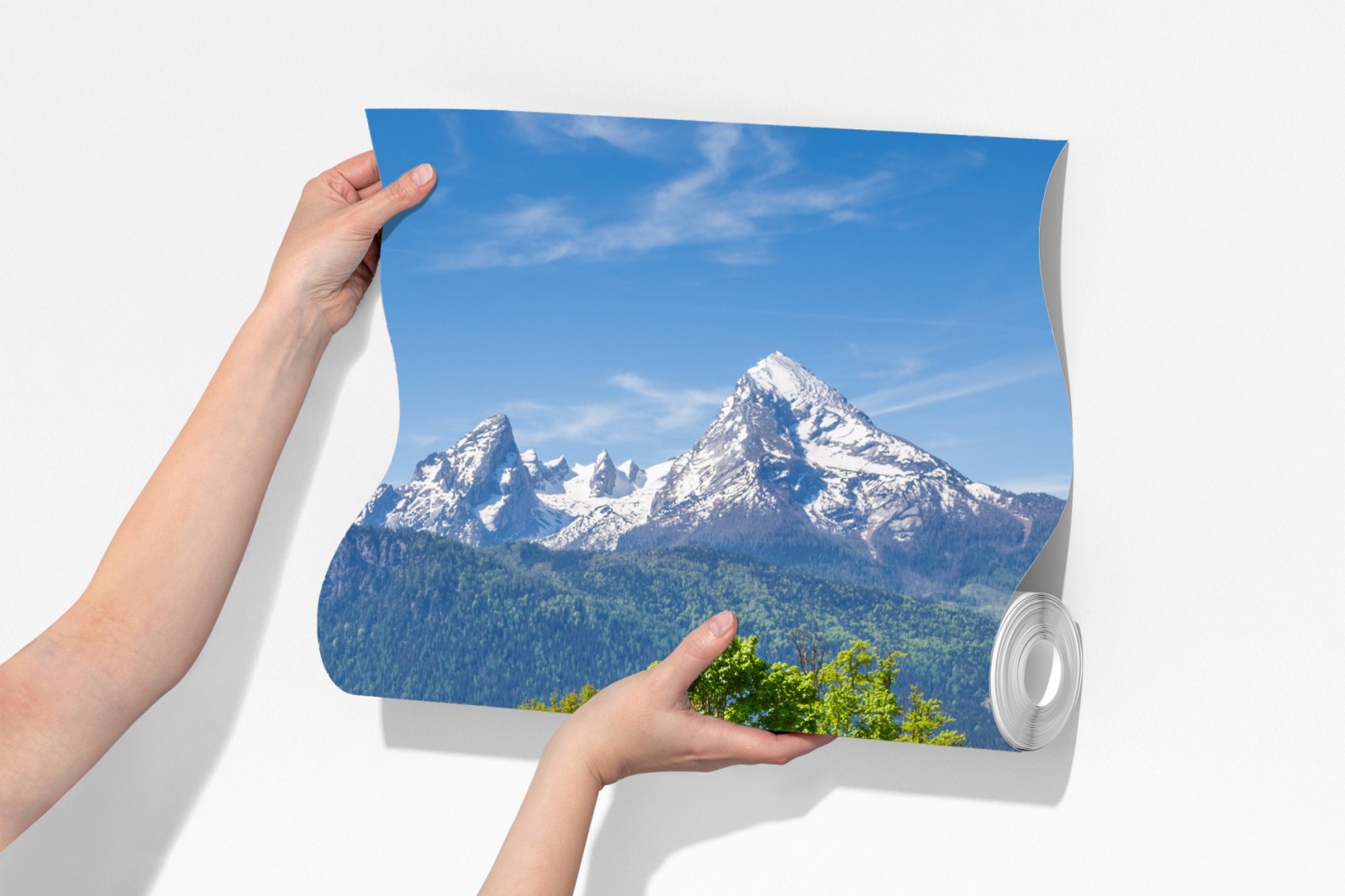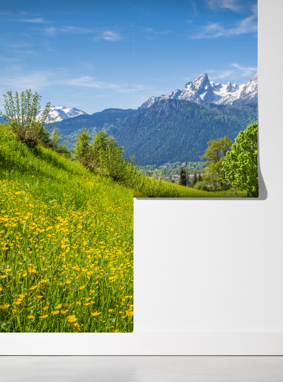 Wprowadź spokojną alpejską scenerię do swojego wnętrza dzięki tej żywej wiosennej łące i majestatycznym ośnieżonym szczytom, które wprowadzają spokój i świeżość.