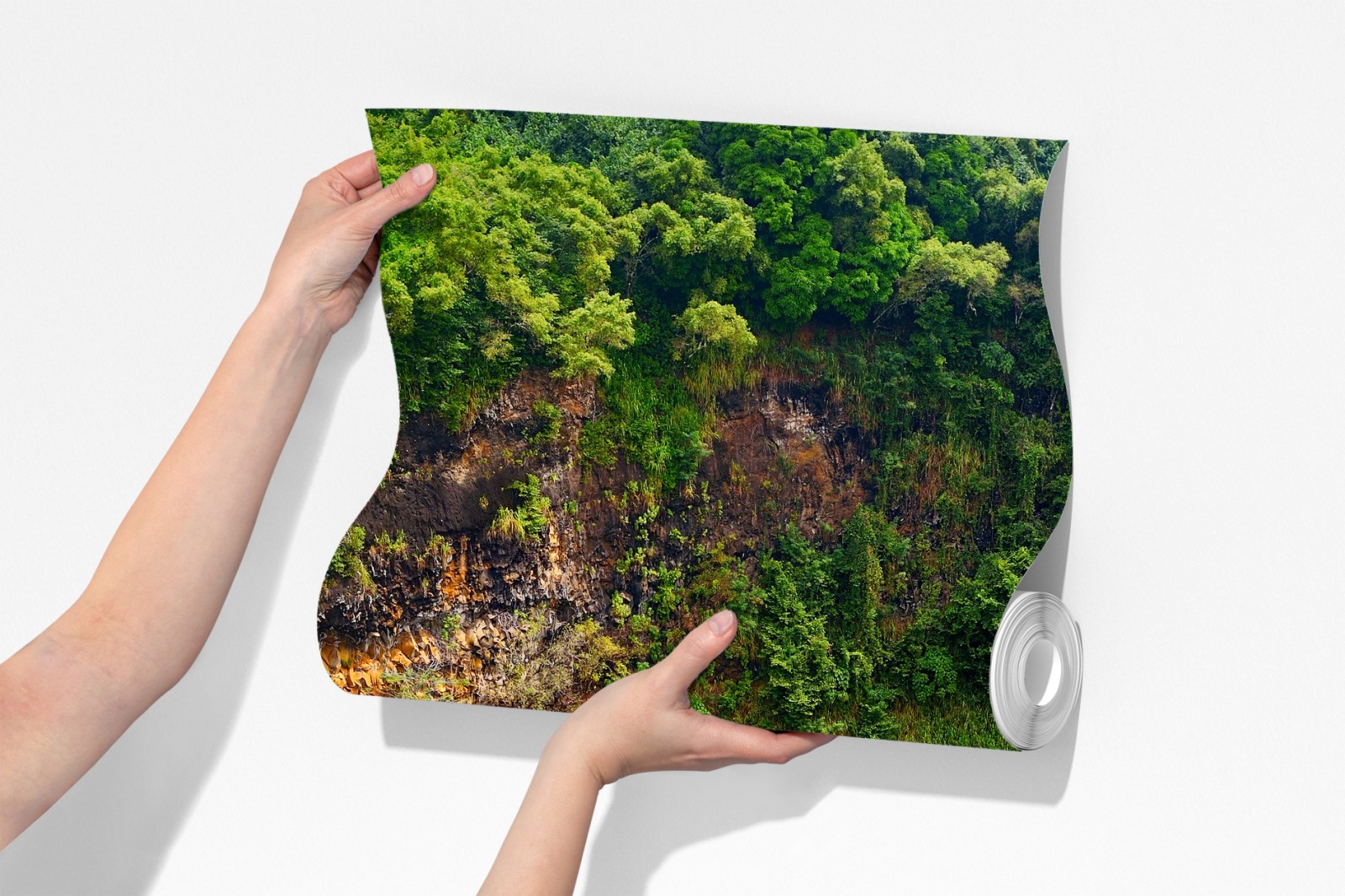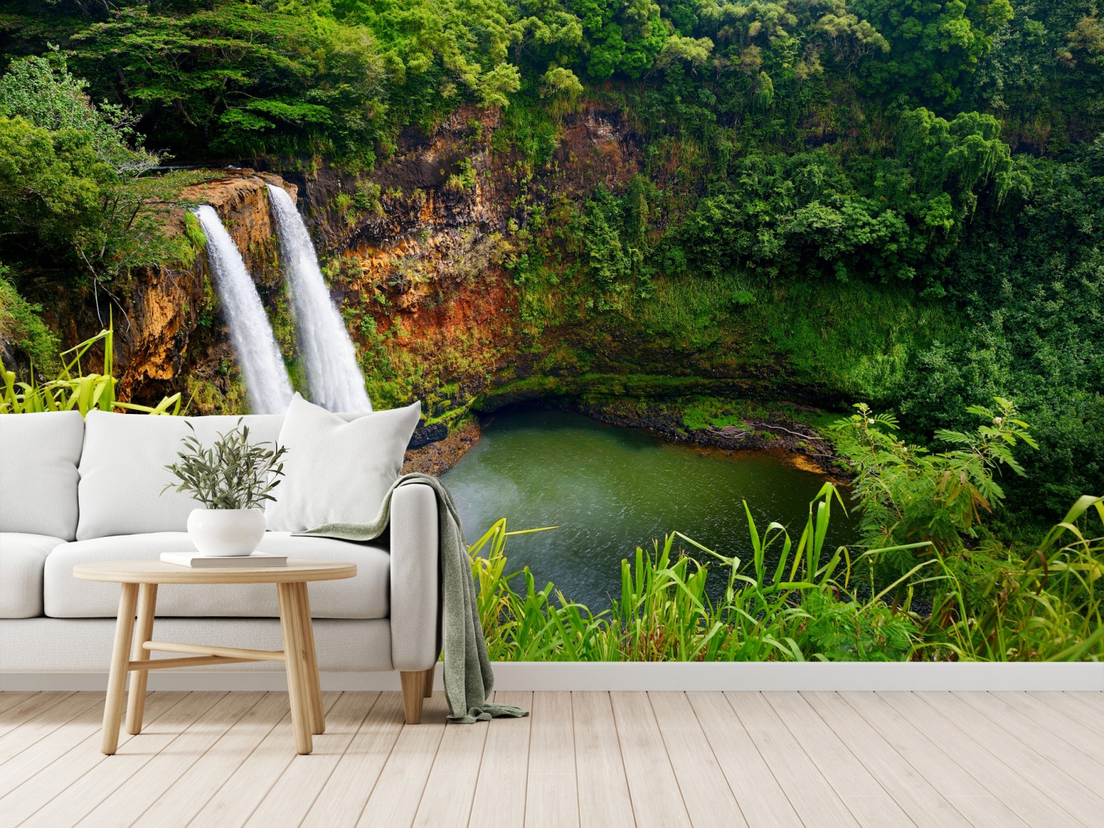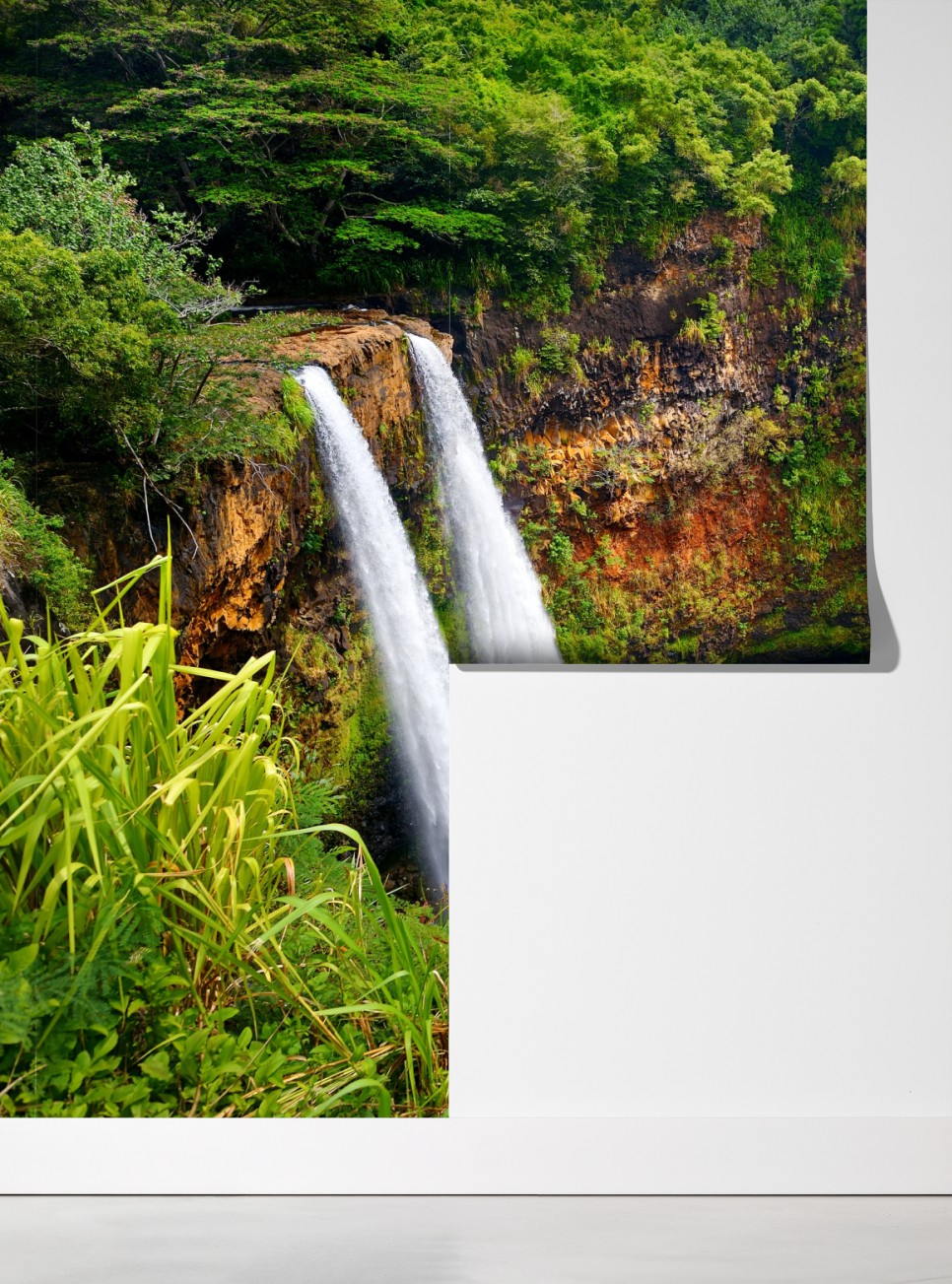 Wprowadź do wnętrza uspokajającą tropikalną energię dzięki żywemu widokowi podwójnego wodospadu otoczonego bujną roślinnością.