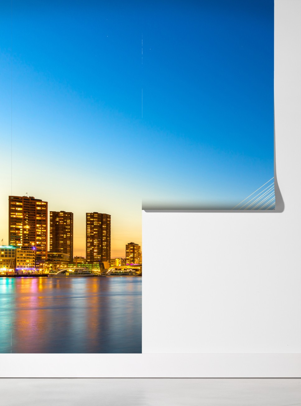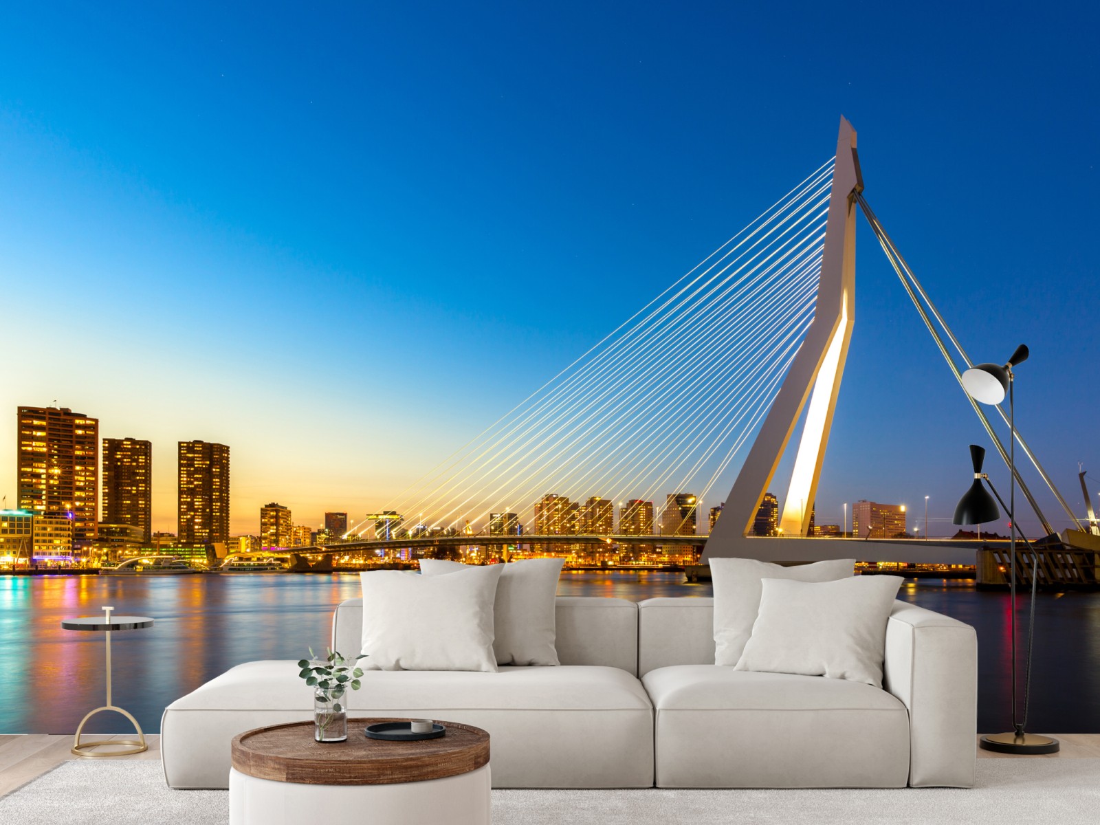 Poczuj nowoczesną elegancję panoramy Rotterdamu dzięki żywemu widokowi Mostu Erazma odbijającemu się w rzece.
