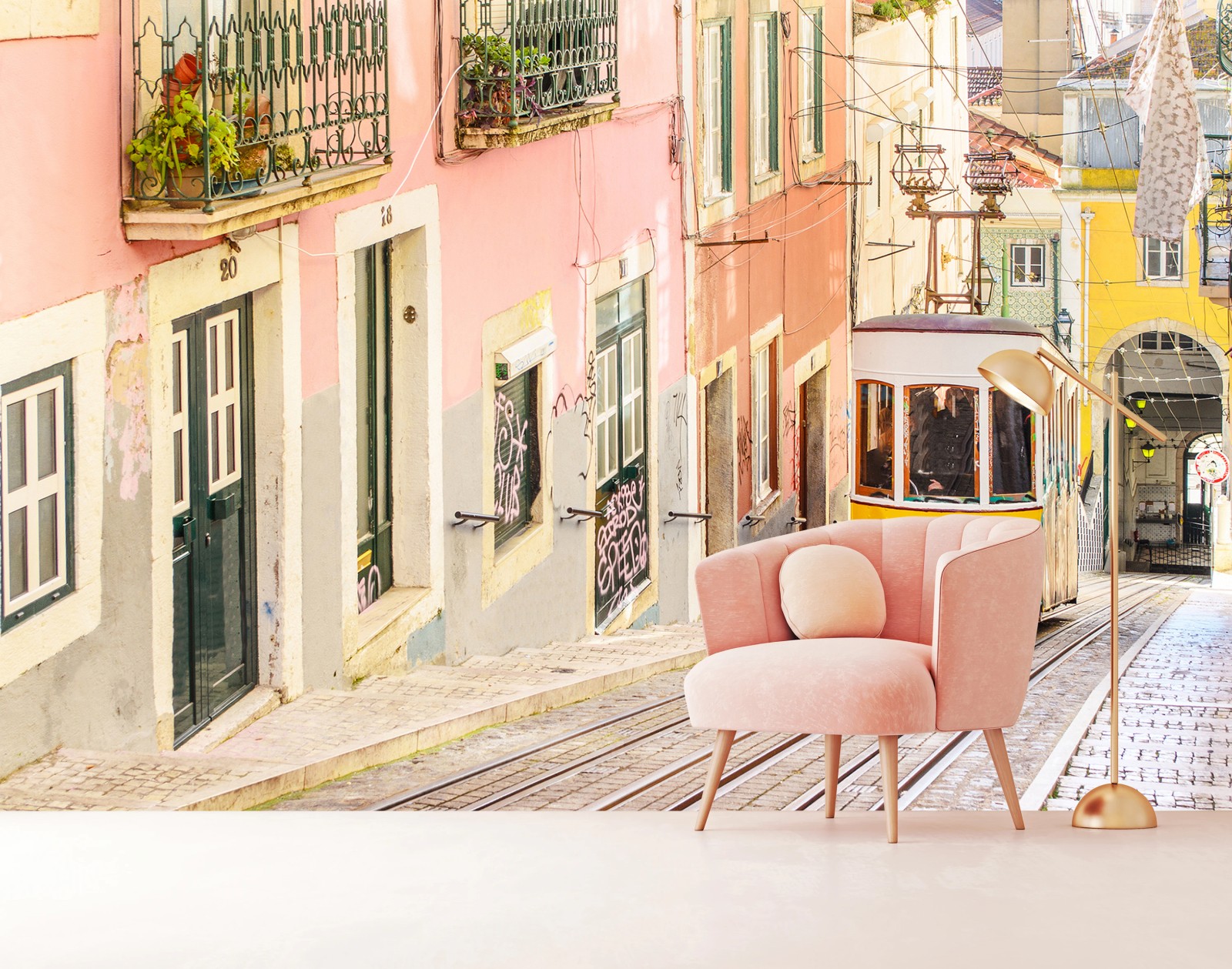 Fototapeta Słoneczny tramwaj na pastelowej ulicy w Lizbonie