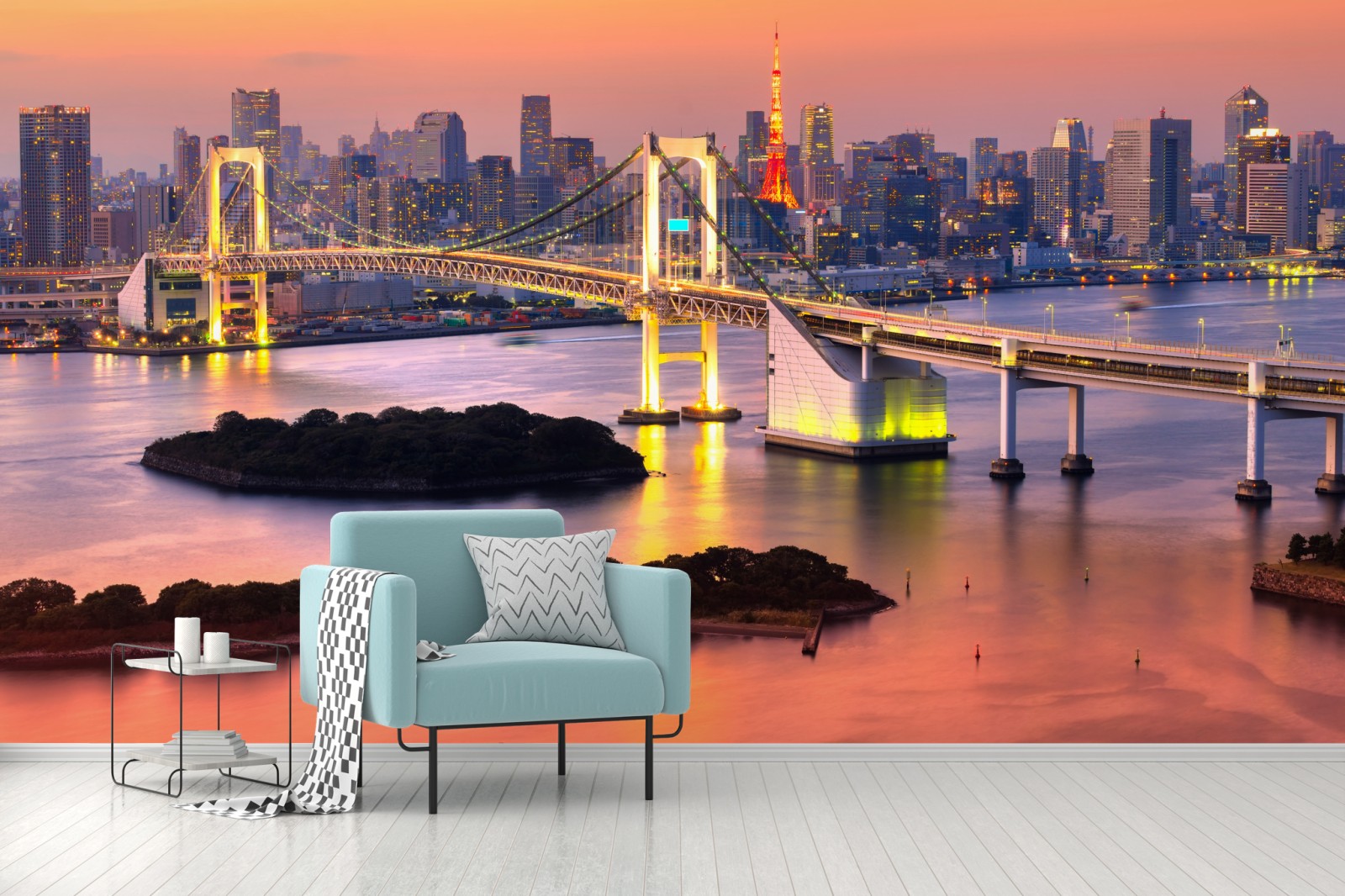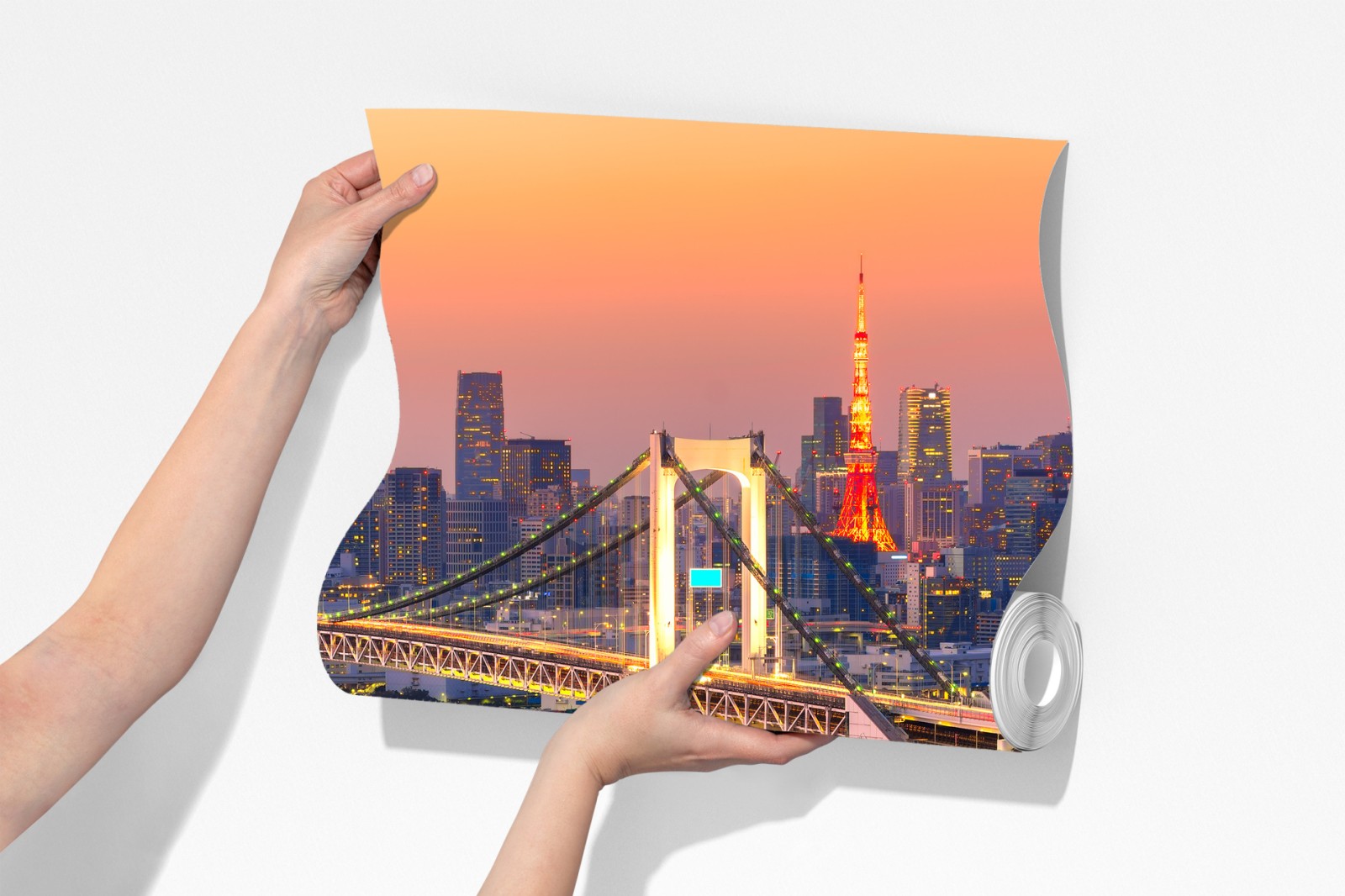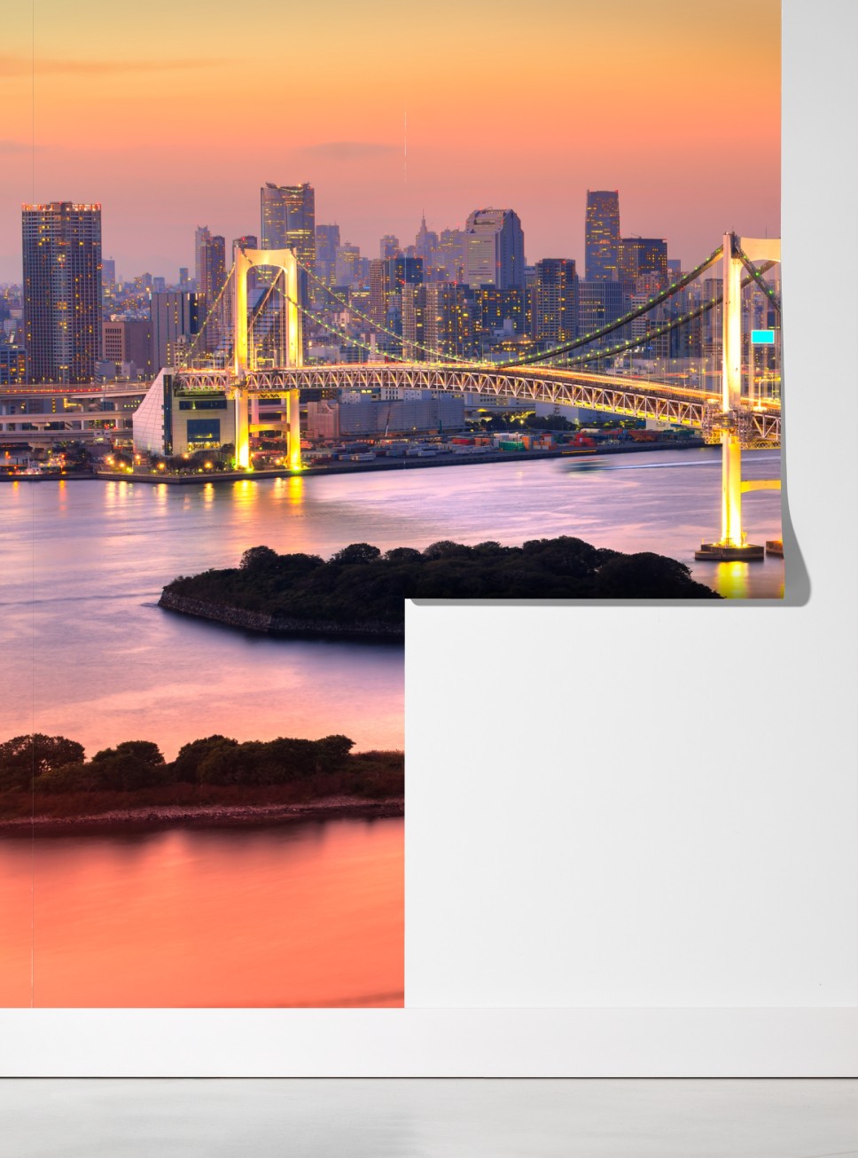 Poczuj tętniący blask panoramy Tokio o zmierzchu z widocznym Tęczowym Mostem i Wieżą Tokio odbijającymi się w wodzie.