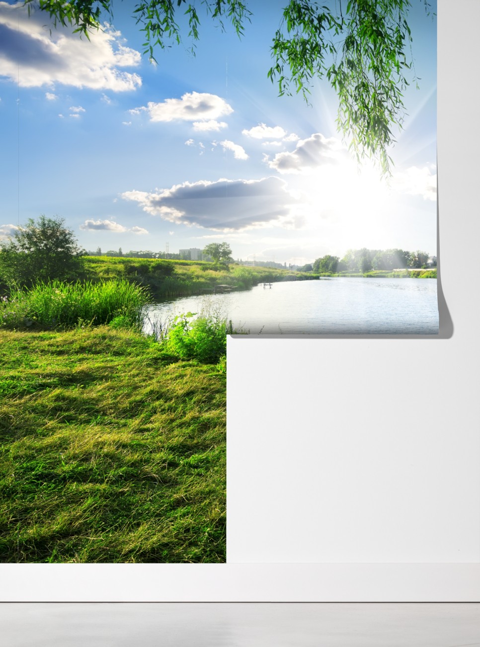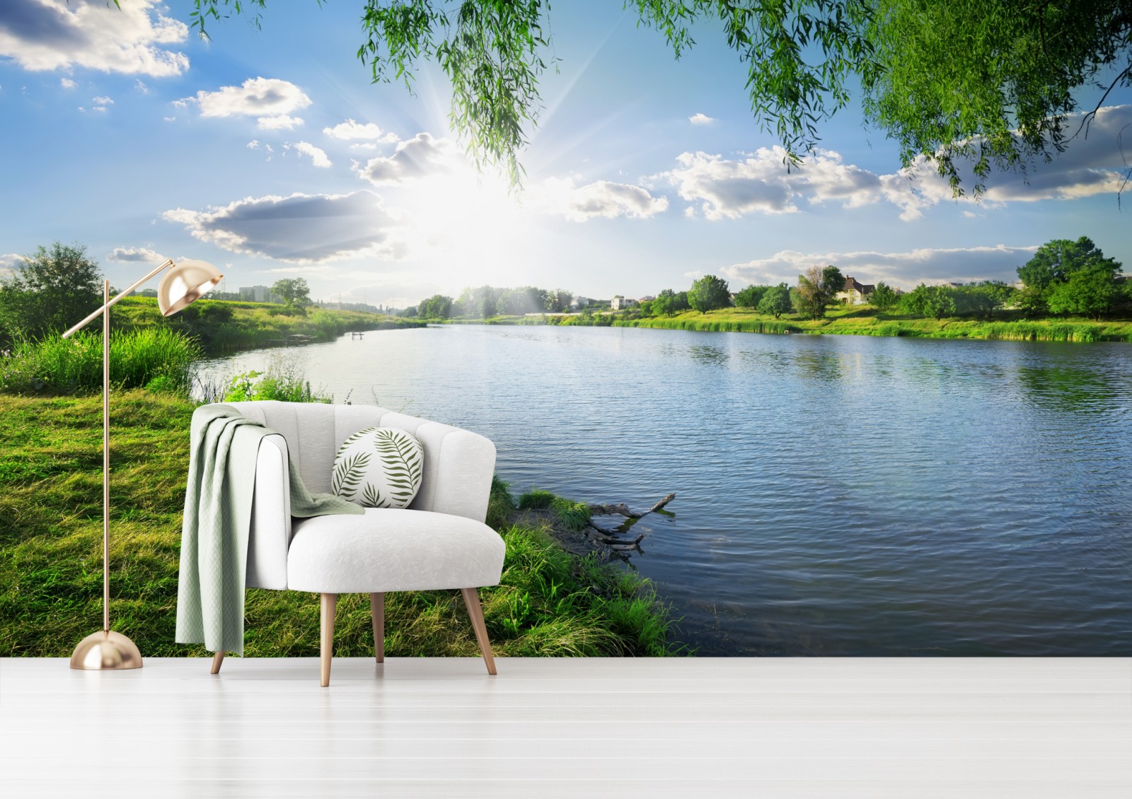 Dodaj spokoju i naturalnego piękna do wnętrza dzięki temu nasłonecznionemu krajobrazowi nad rzeką z lśniącą wodą i zielenią.