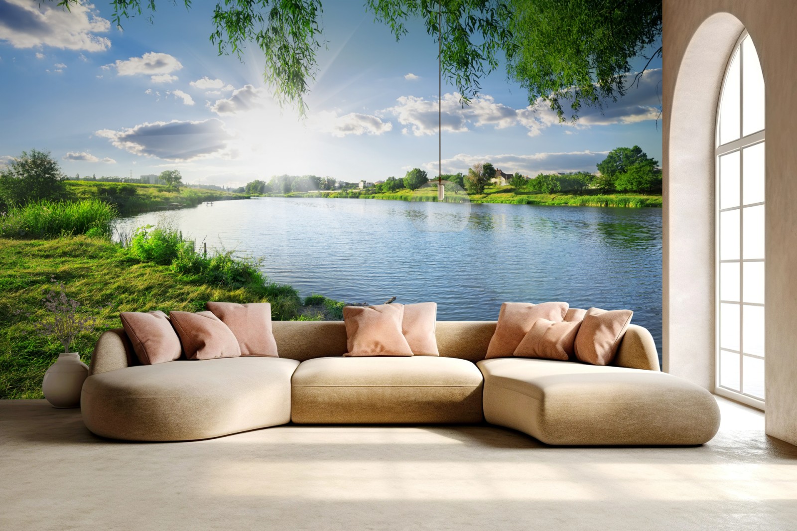 Fototapeta Nasłoneczniony brzeg rzeki z bujną zielenią
