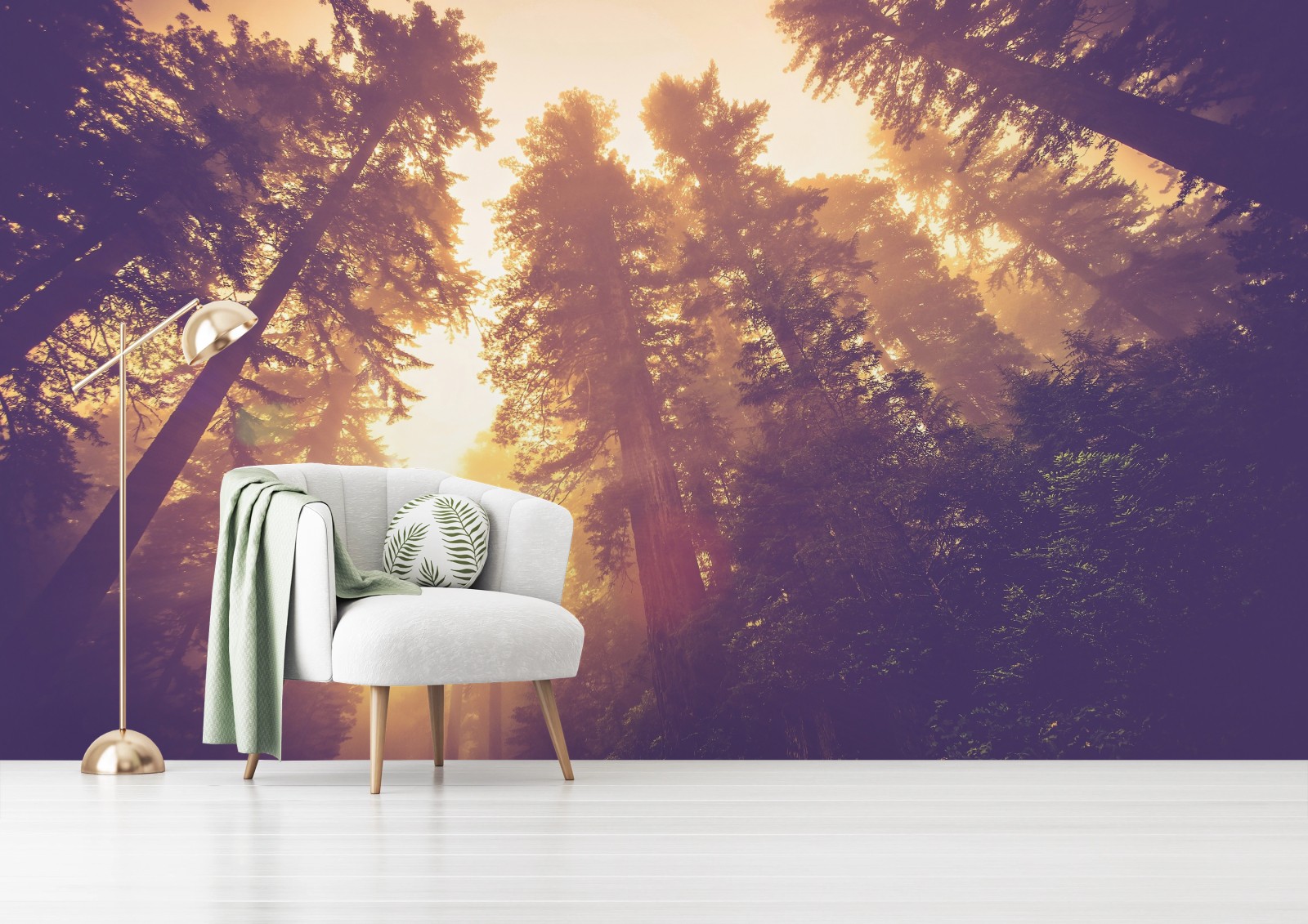 Fototapeta Mglisty las sekwojowy w złotych vintage tonacjach