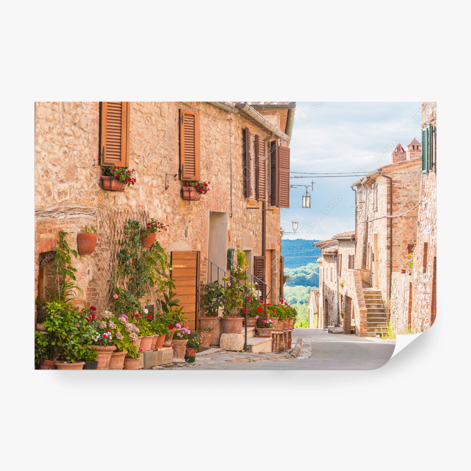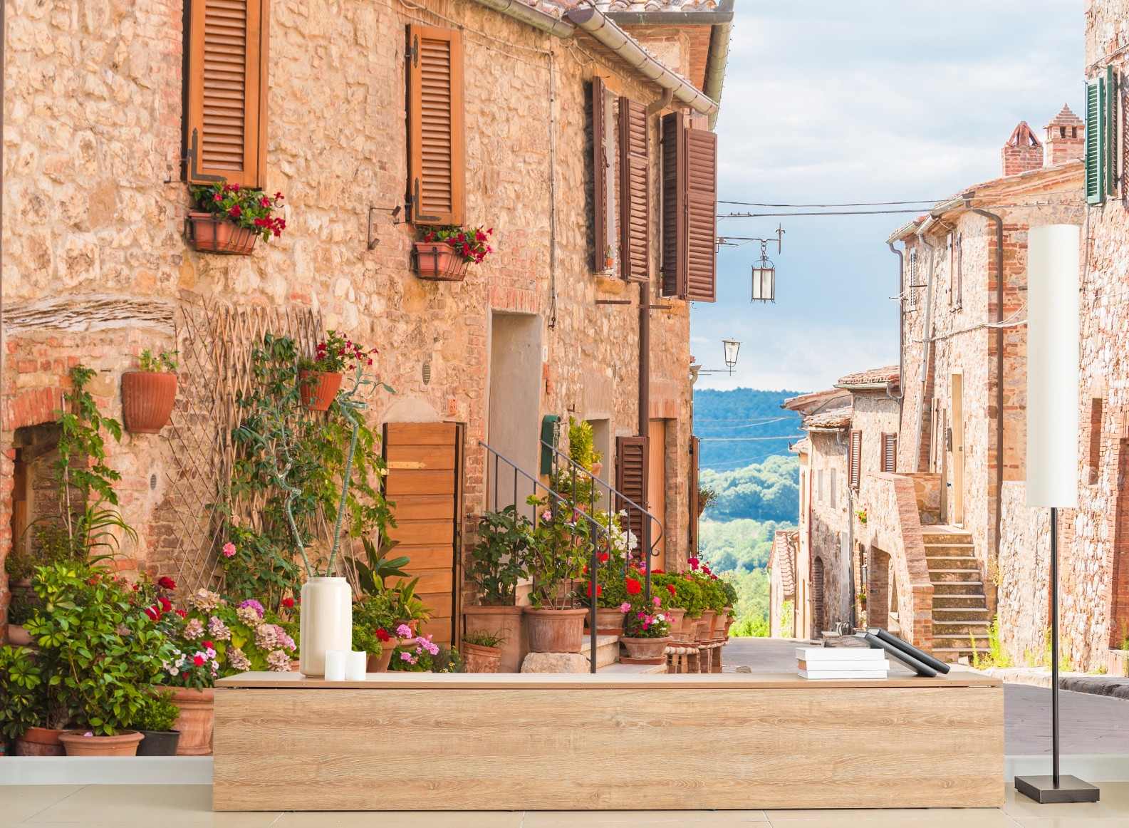 Fototapeta Średniowieczna ulica w Toskanii z doniczkami z kwiatami