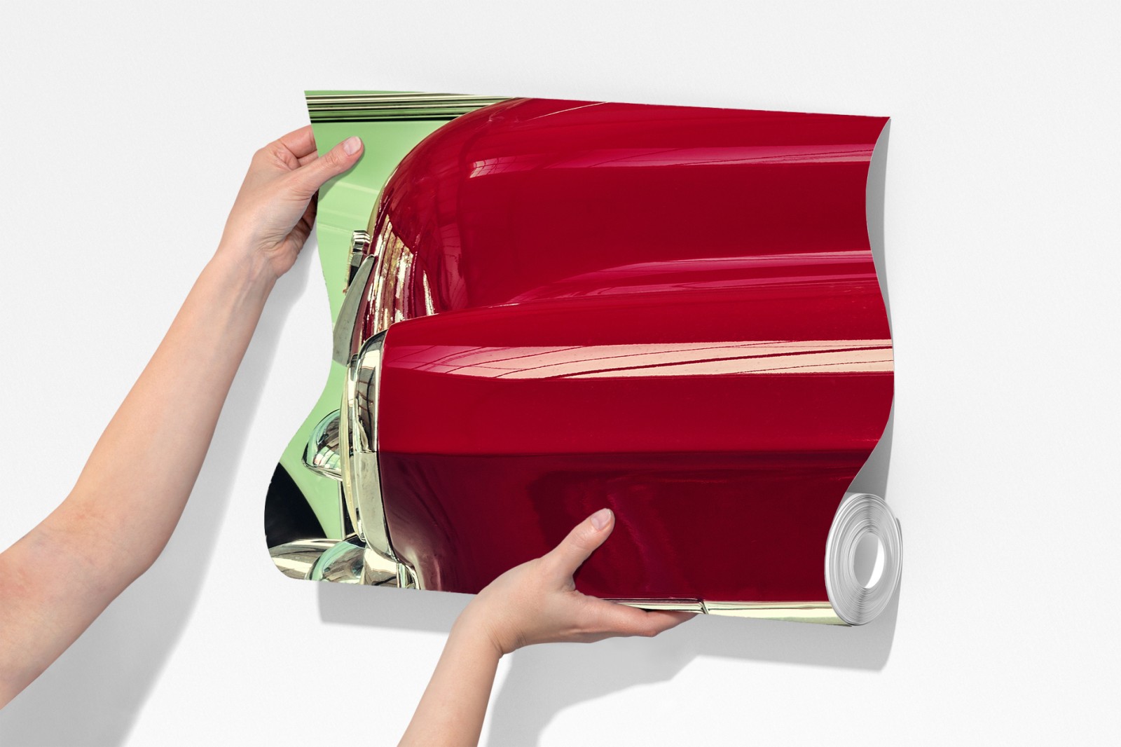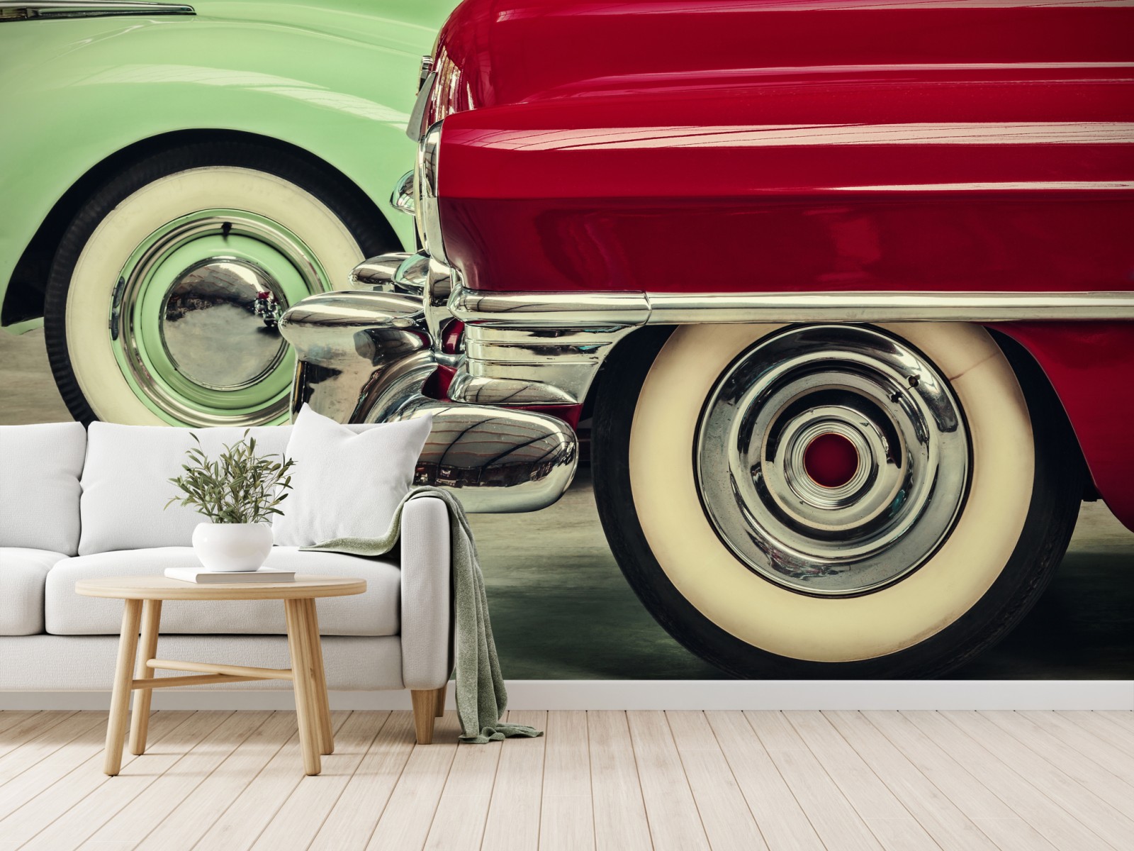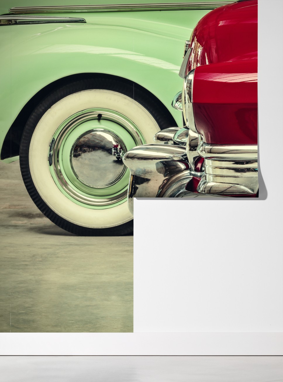 Dodaj retro motoryzacyjny akcent do wnętrza dzięki zbliżeniu klasycznych samochodów z błyszczącym chromem i białymi oponami.