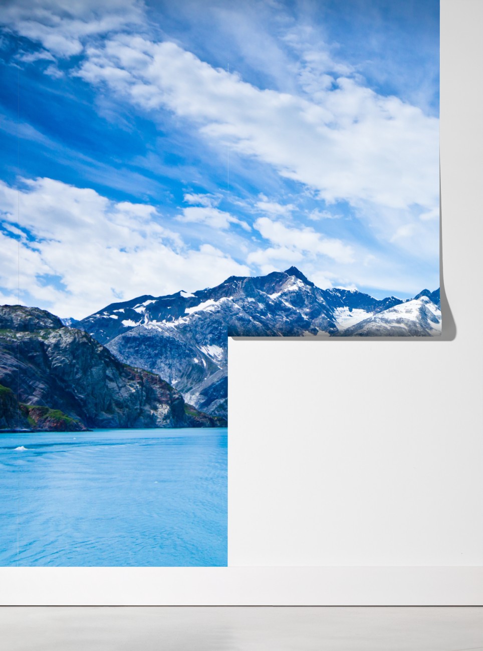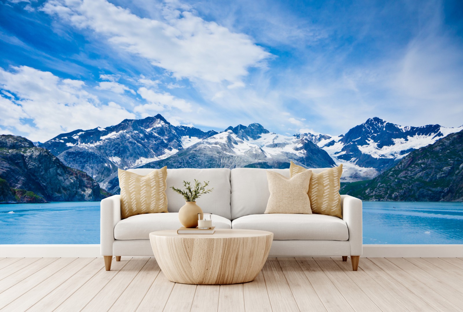 Wprowadź spokojne piękno Glacier Bay do swojego wnętrza dzięki temu żywemu panoramicznemu obrazowi ośnieżonych gór i turkusowych wód.