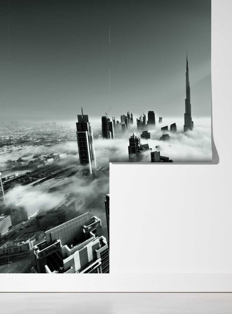 Odkryj dramatyczną mglistą panoramę Dubaju w ponadczasowej skali szarości, efektowny akcent do nowoczesnych wnętrz.