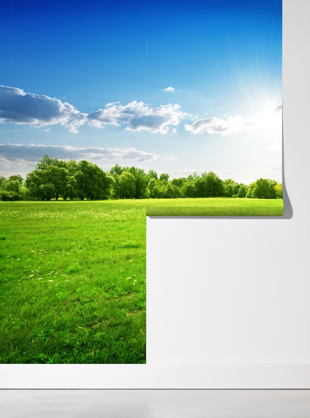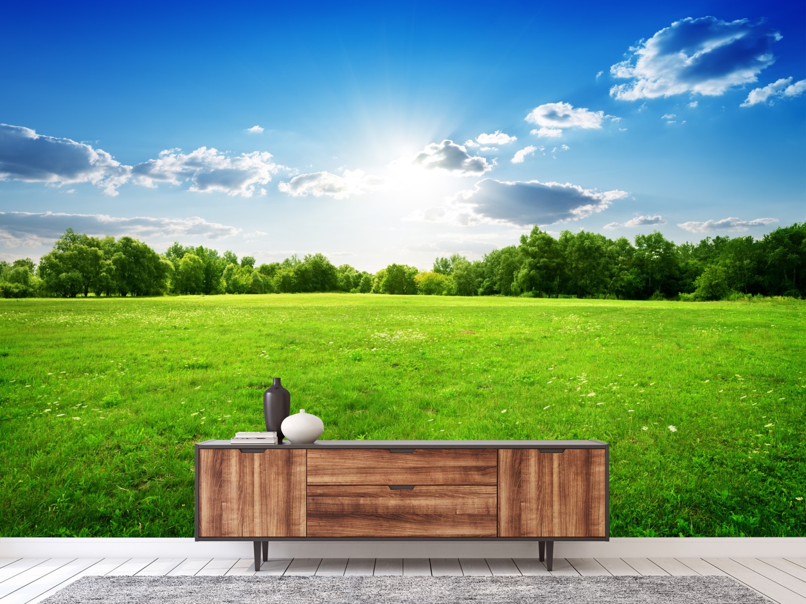 Wprowadź do wnętrza uspokajającą naturę dzięki temu obrazowi słonecznej zielonej łąki, ukazującemu bujną trawę, odległe drzewa i czyste niebo.