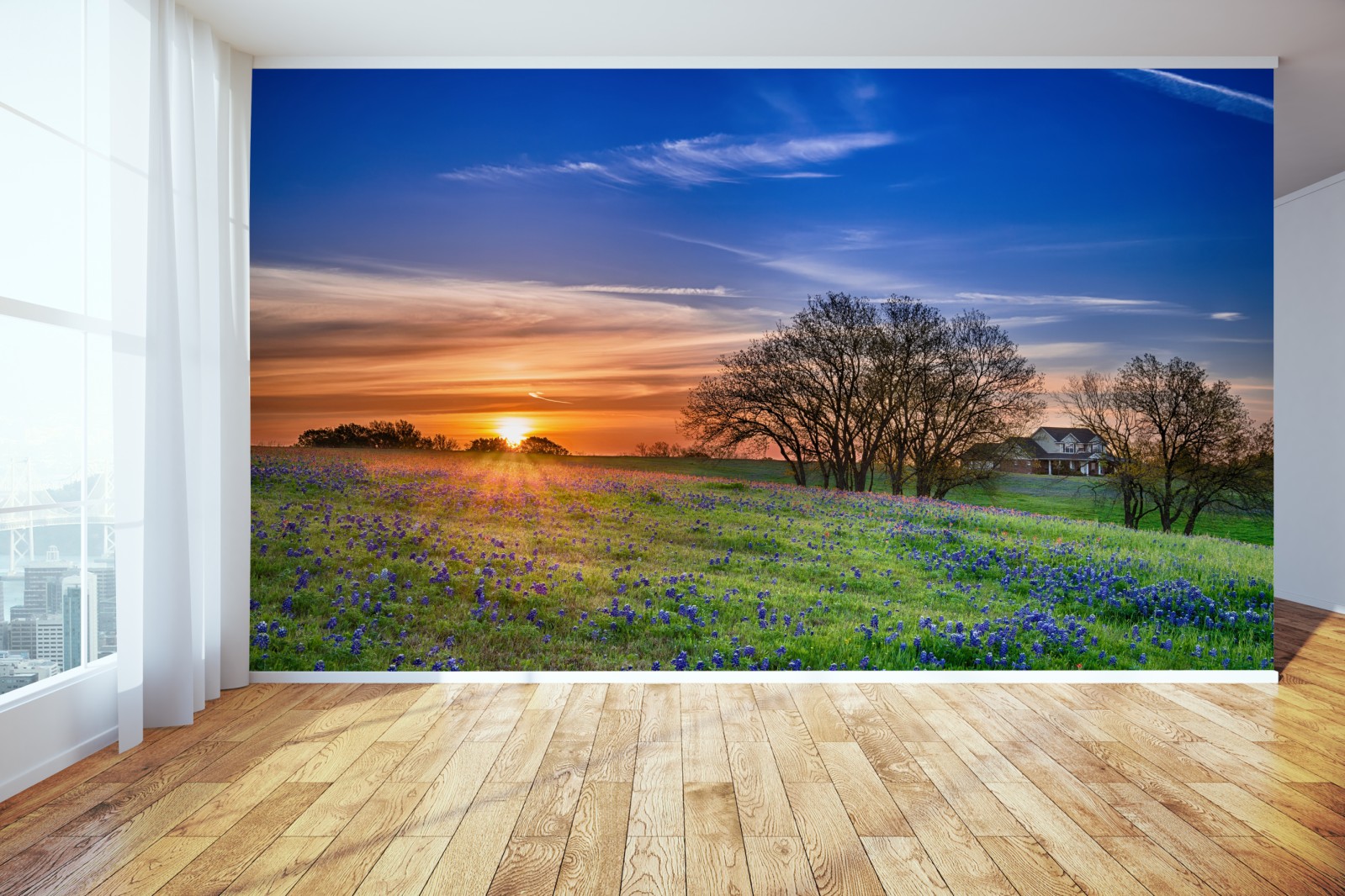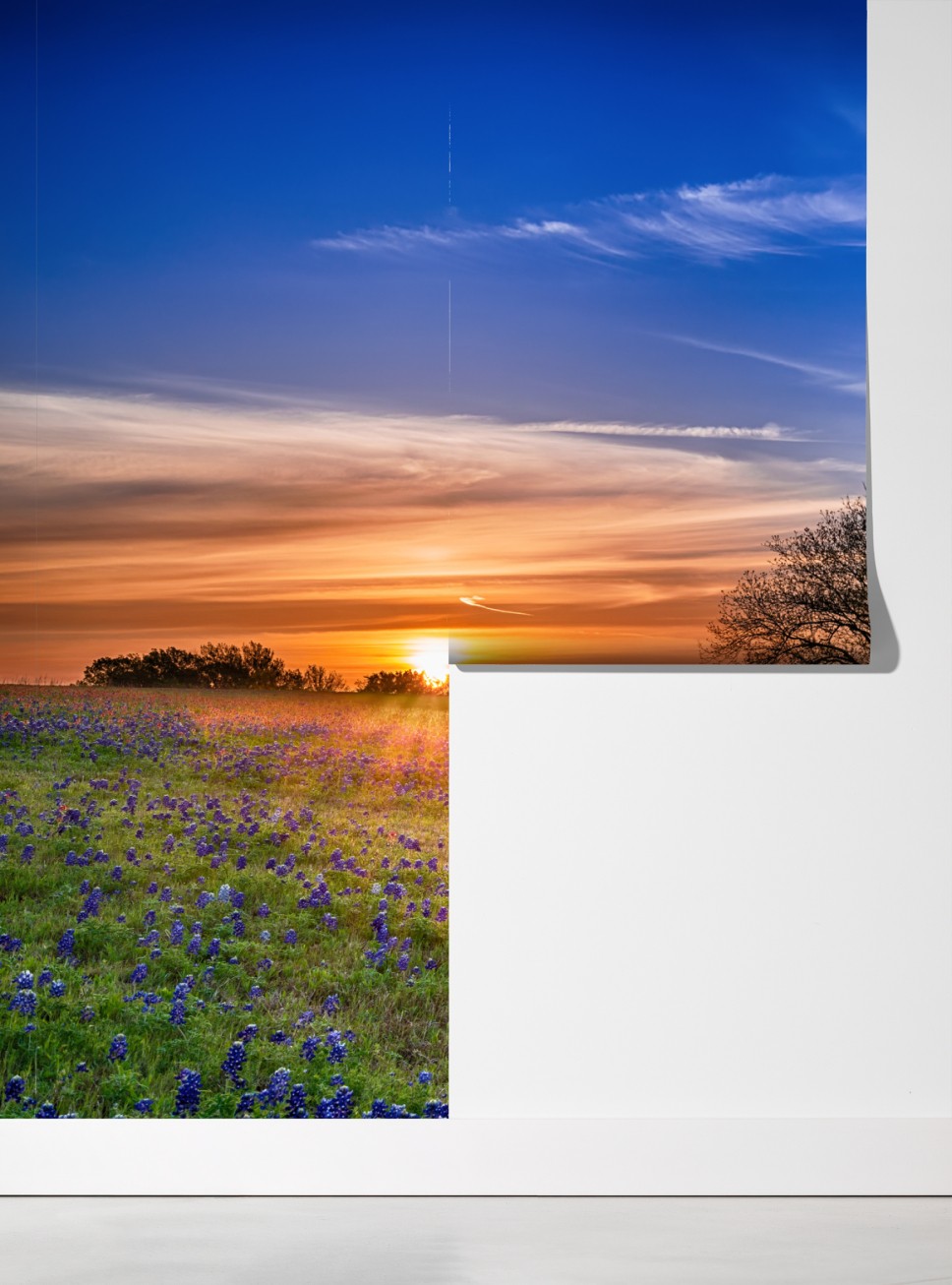 Wprowadź do wnętrza spokój łąki bluebonnetów ze wschodem słońca i żywymi kolorami.
