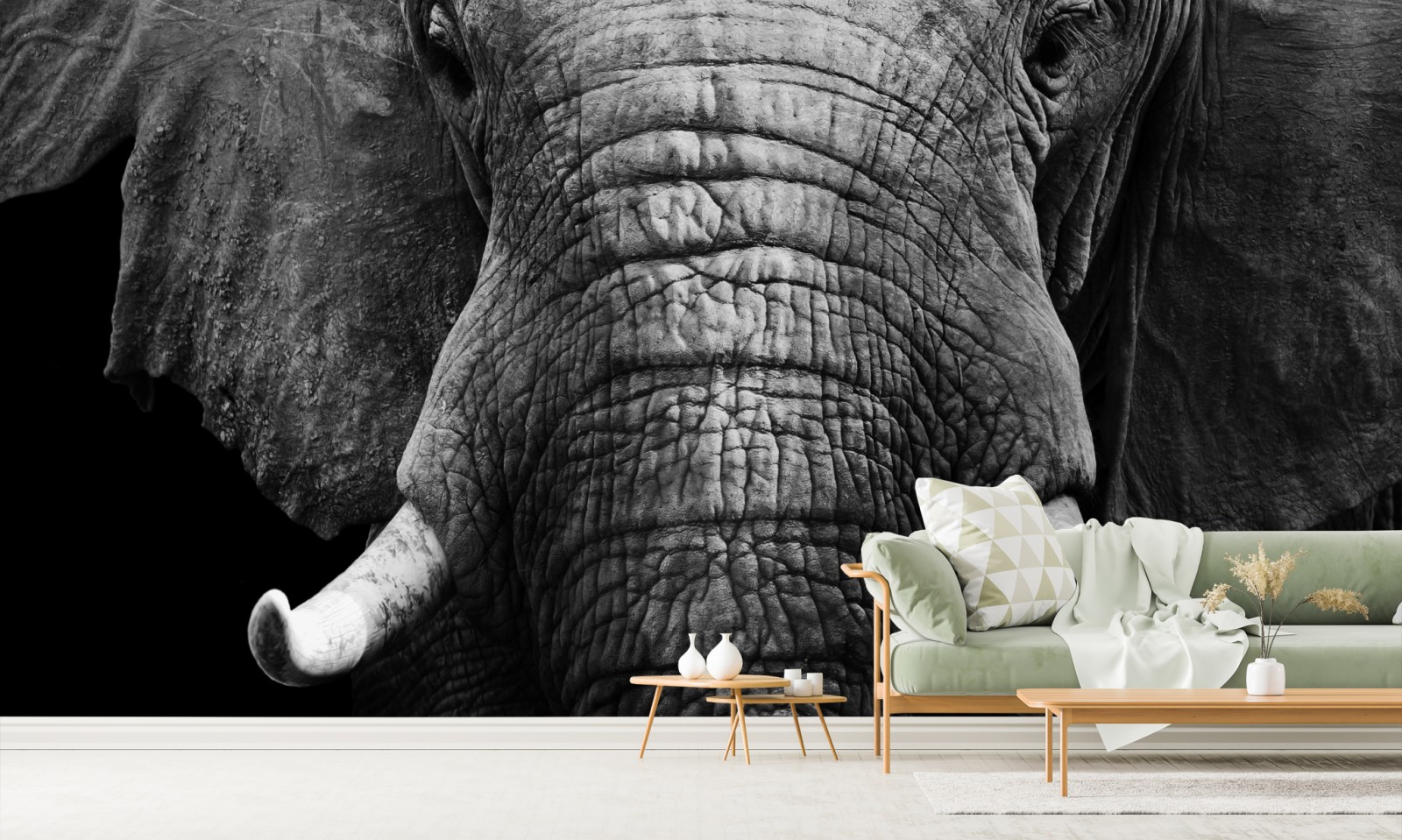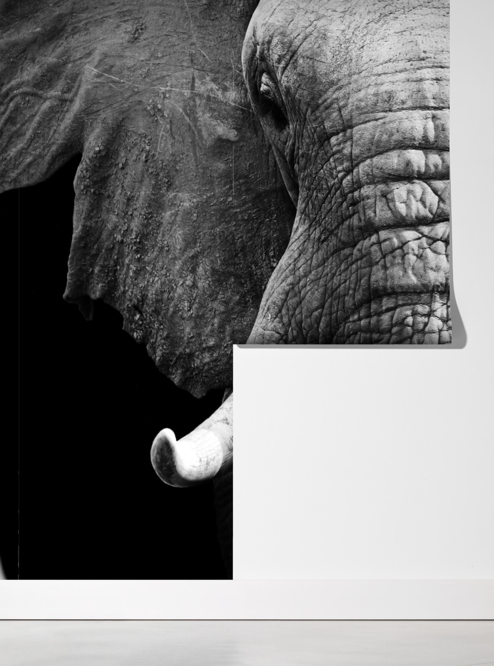 Wprowadź surowe piękno dzikiej przyrody do wnętrza dzięki temu wyrazistemu czarno-białemu portretowi słonia, idealnemu do minimalistycznych przestrzeni.