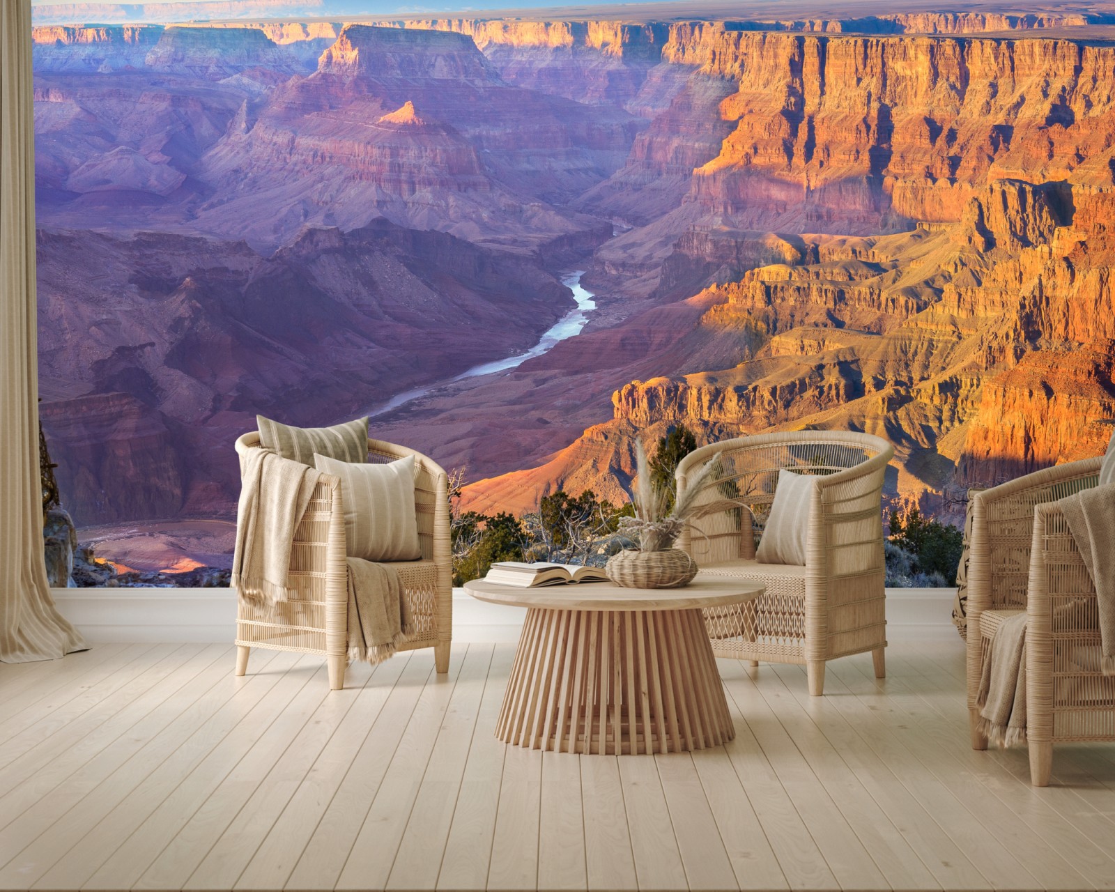 Poczuj majestat Wielkiego Kanionu o zmierzchu z rozświetlonymi klifami i wijącą się Rzeką Kolorado.