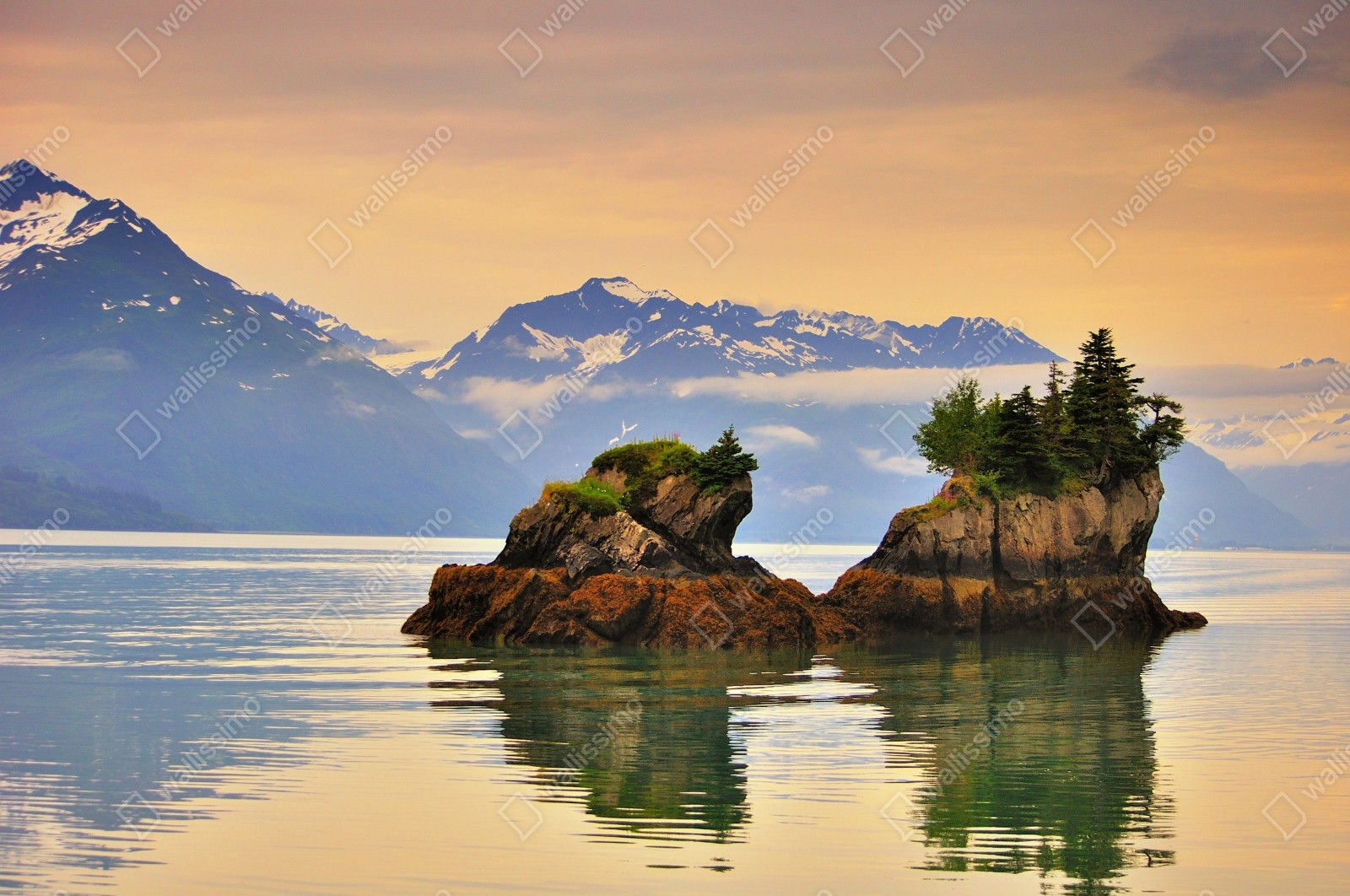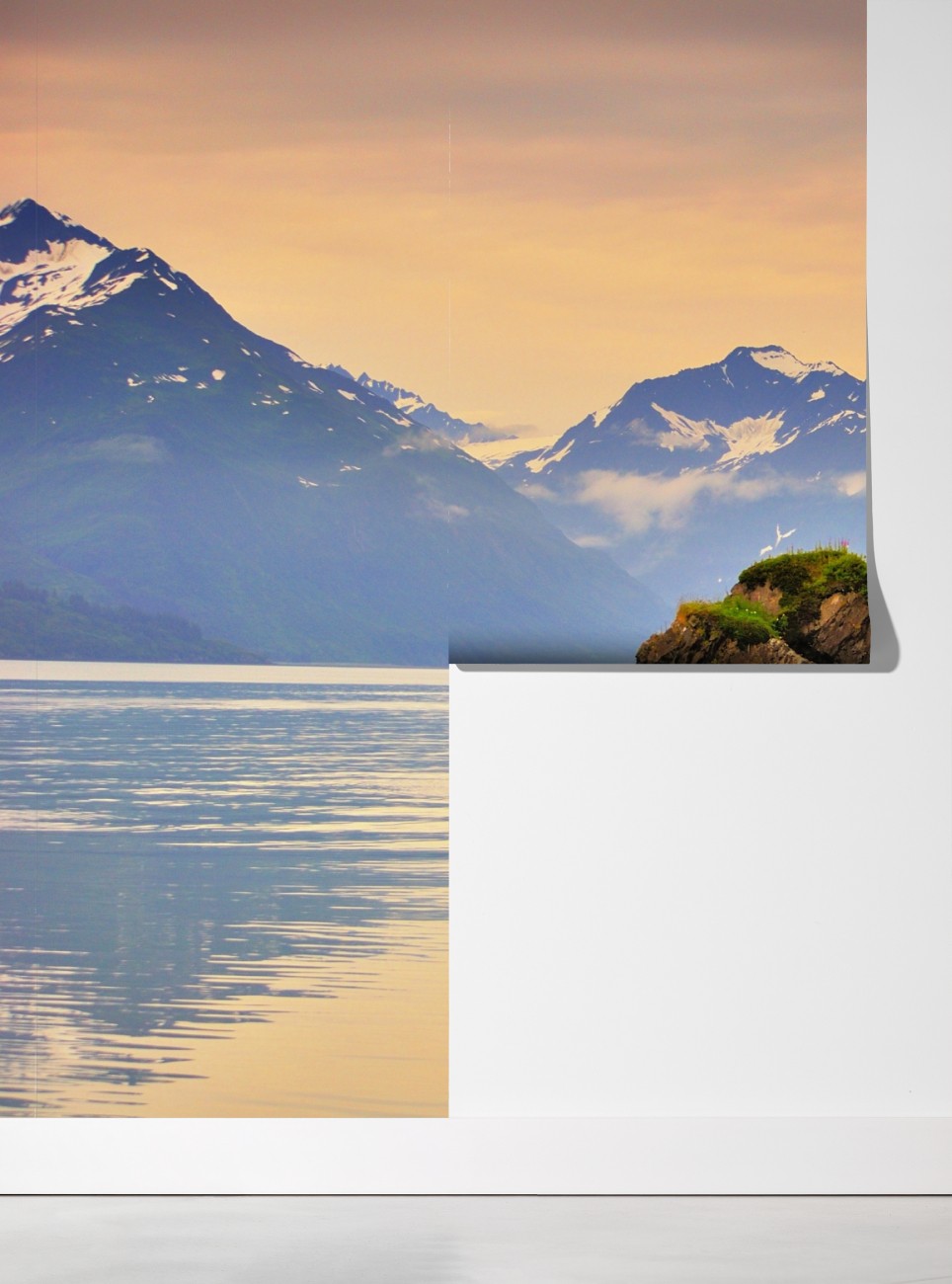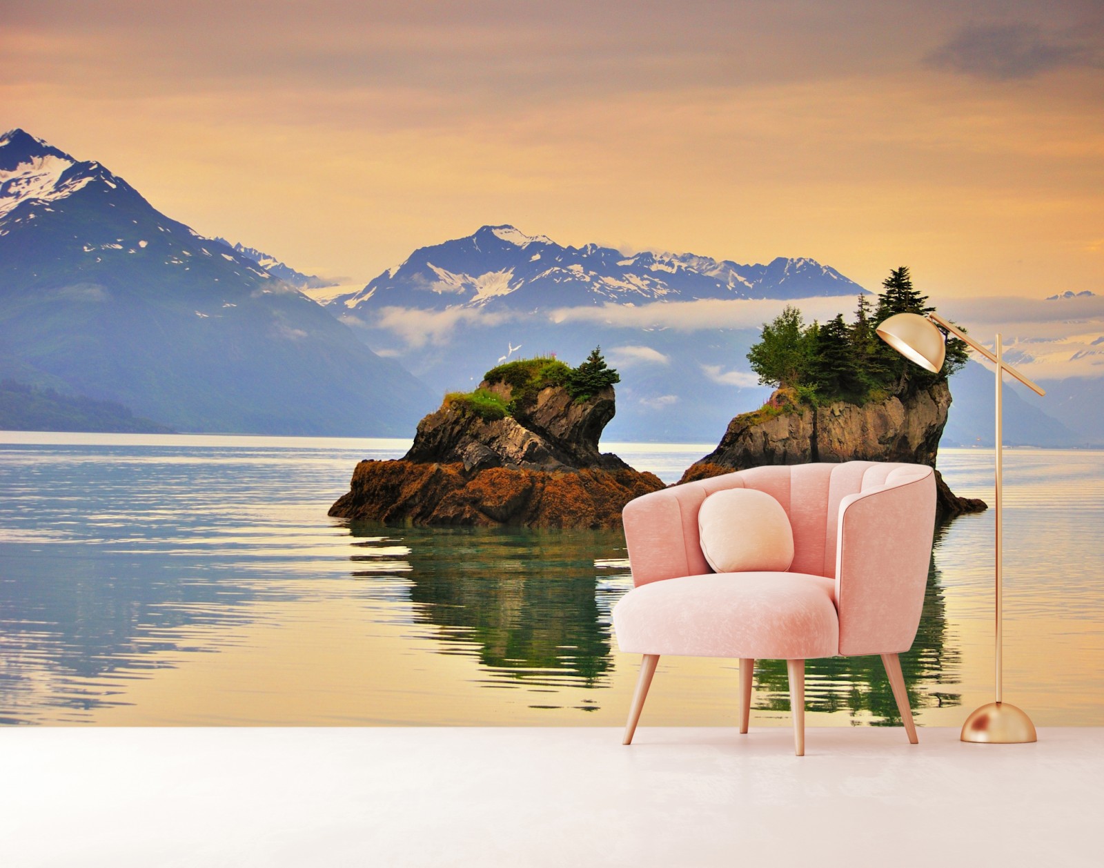 Poczuj spokój dzięki temu pejzażowi z wysepkami, spokojną taflą wody i ośnieżonymi górami w tle — idealny akcent inspirowany naturą do każdego wnętrza.