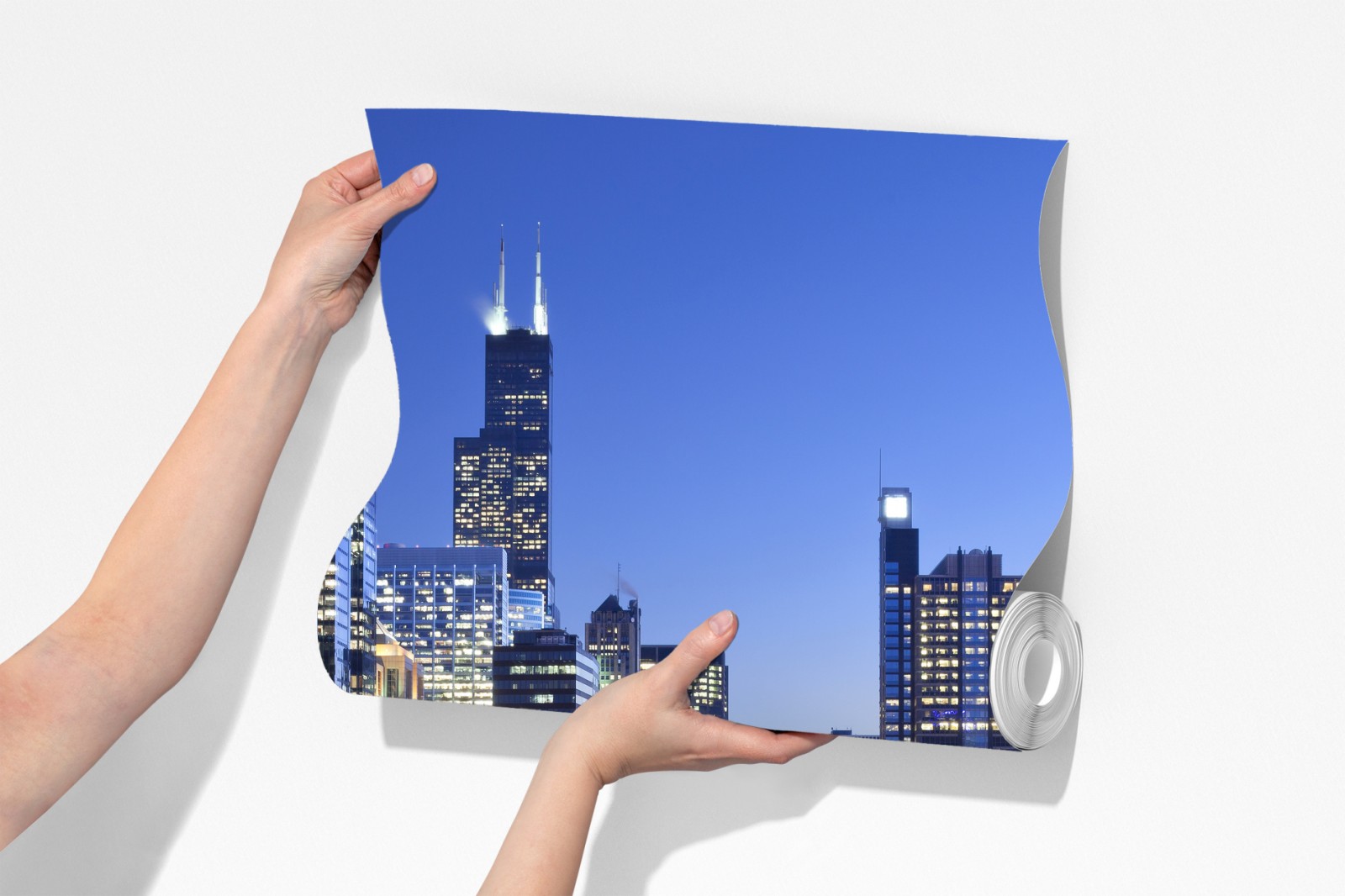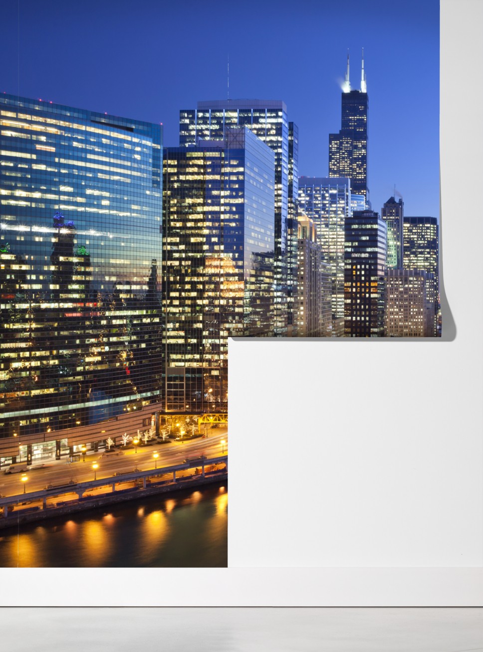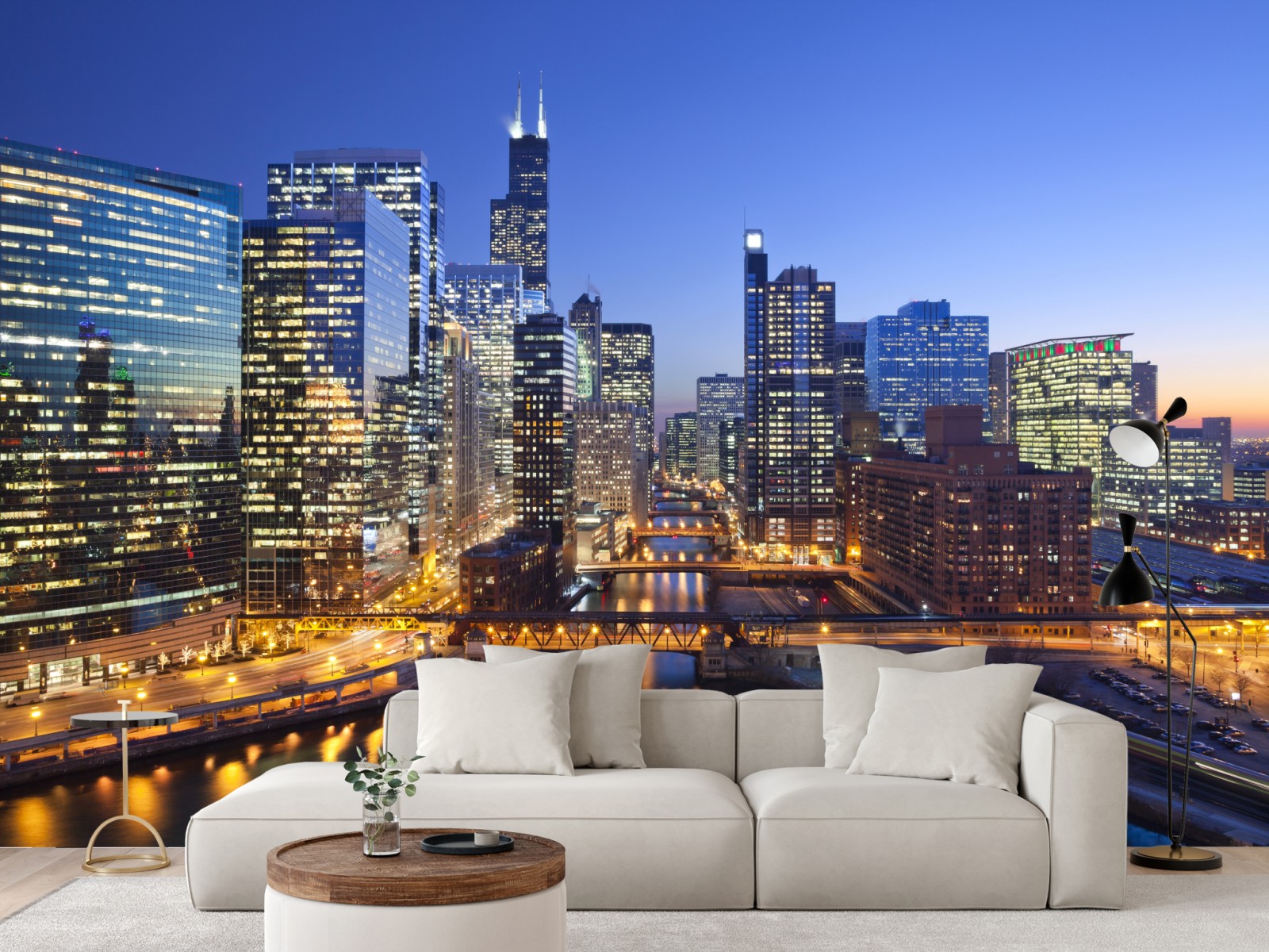 Wprowadź miejską atmosferę do wnętrza dzięki temu widokowi na panoramę Chicago o zmierzchu, migoczące światła i odbicia w wodzie tworzą nowoczesny akcent.
