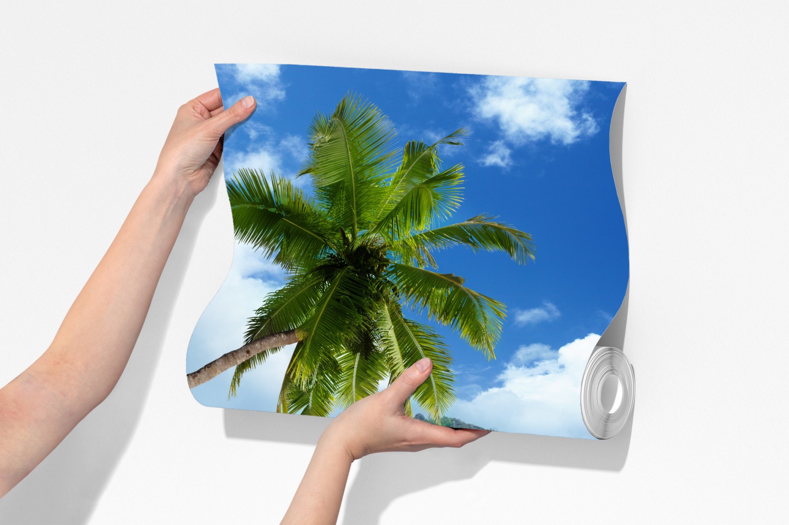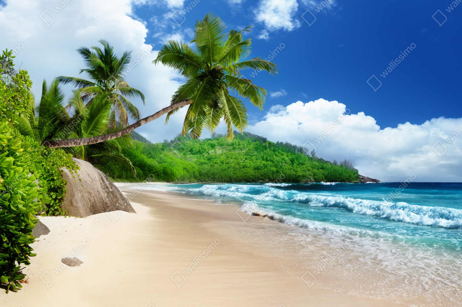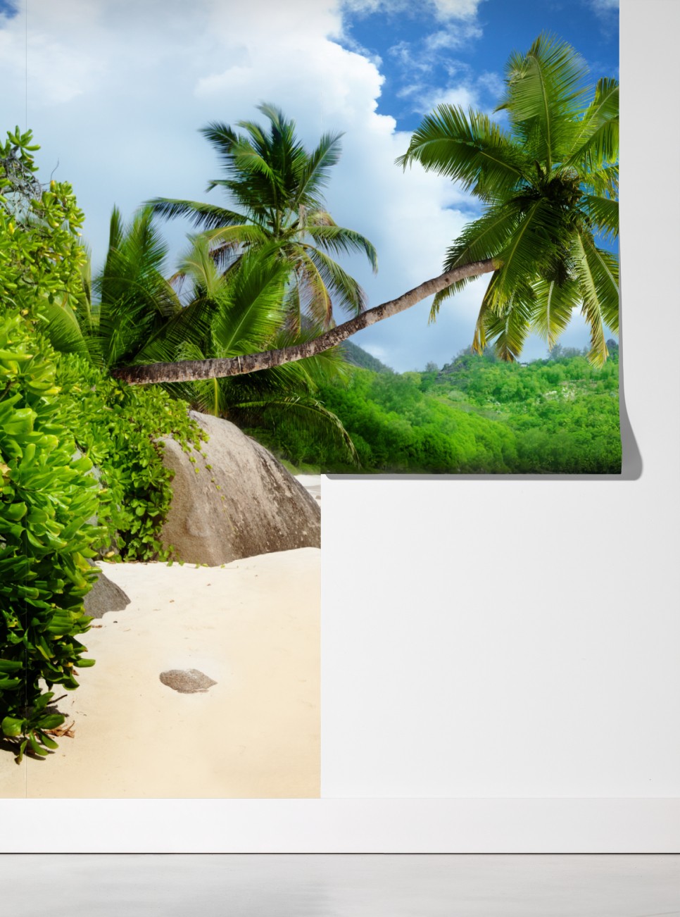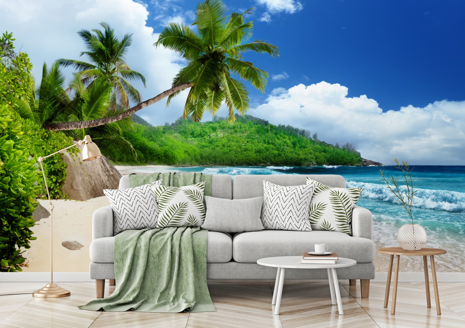 Wprowadź nadmorski spokój do wnętrza dzięki tej żywej tropikalnej scenie z plaży na Mahe, Seszele, z kołyszącymi się palmami, turkusowymi falami i słonecznym piaskiem.