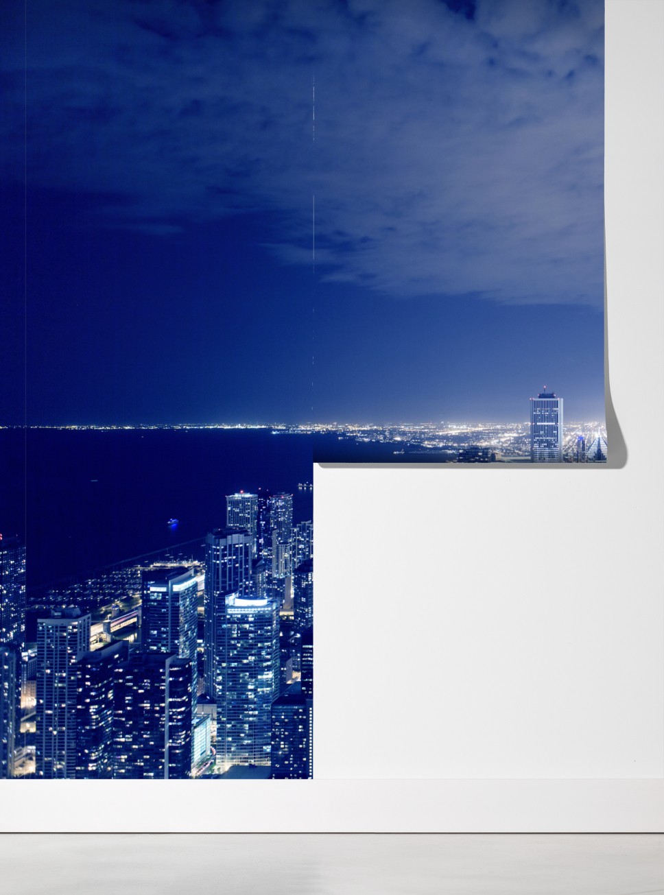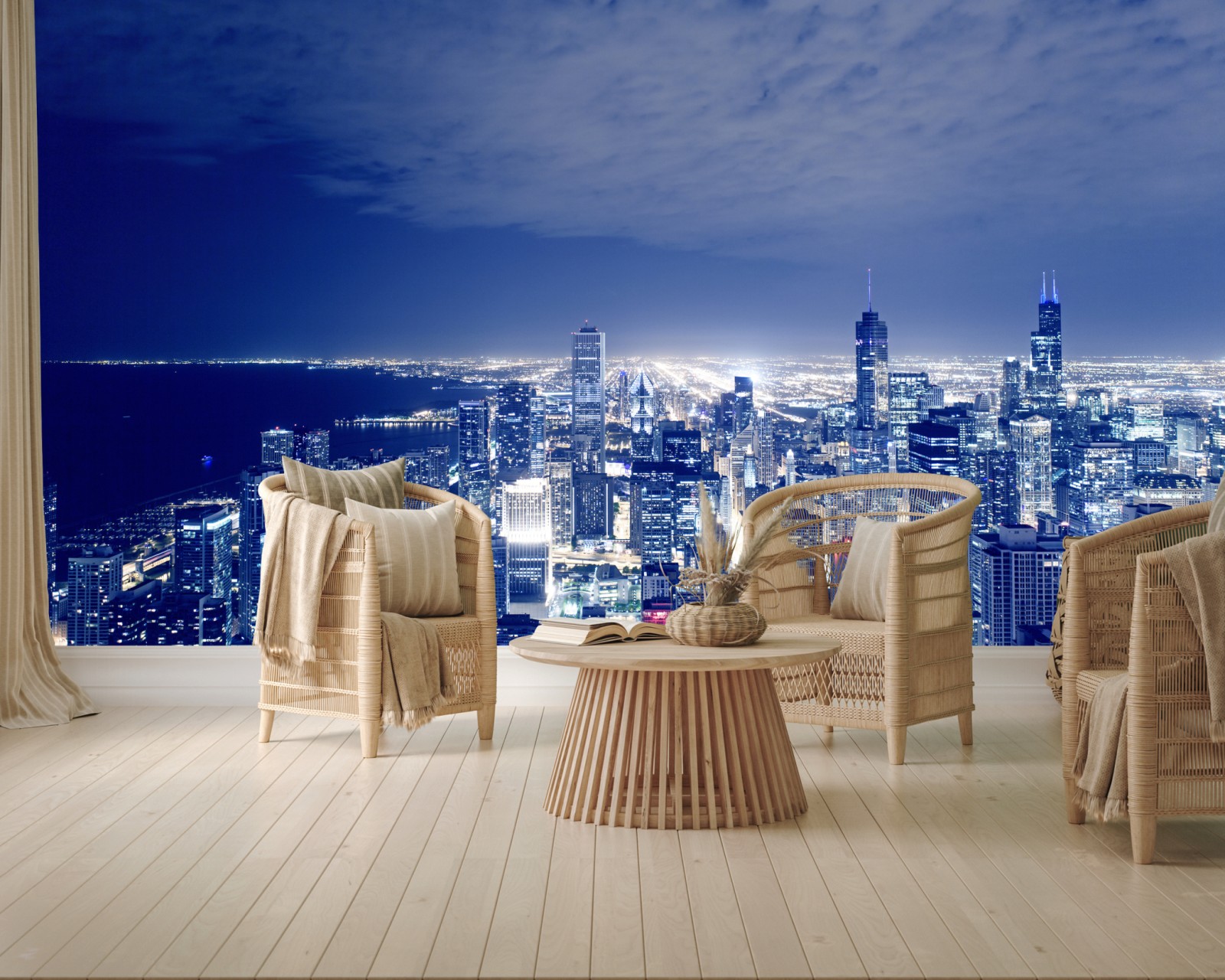 Zmień aranżację wnętrza dzięki oszałamiającemu nocnemu widokowi na oświetlony skyline Chicago, idealny do nowoczesnych wnętrz.