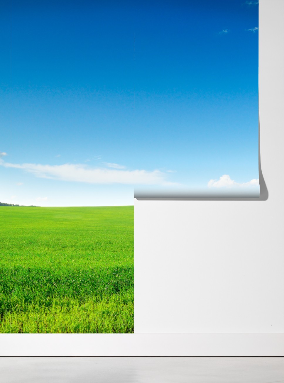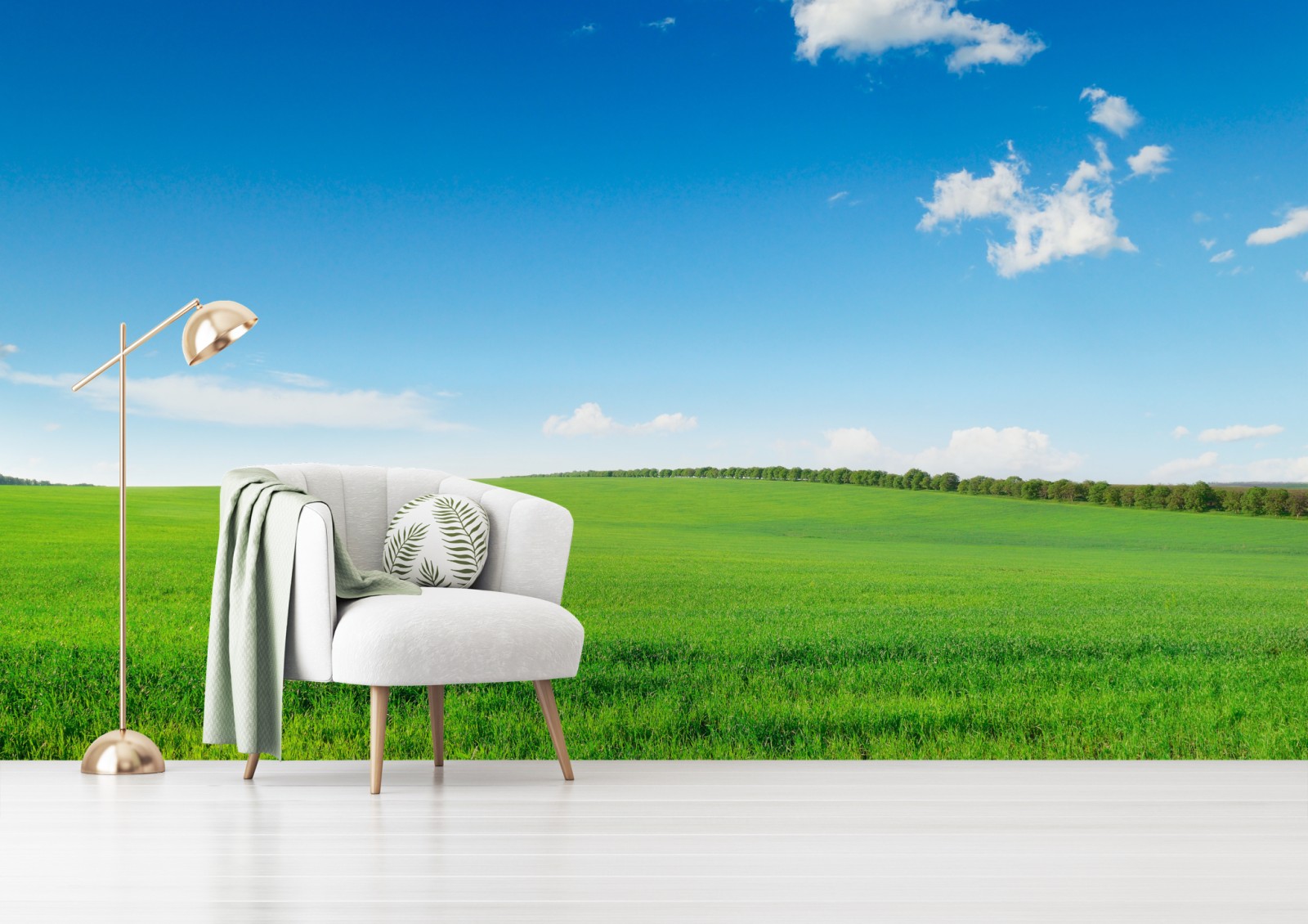 Wprowadź do wnętrza spokój i naturalne piękno dzięki tej żywej zielonej łące i czystemu niebu.