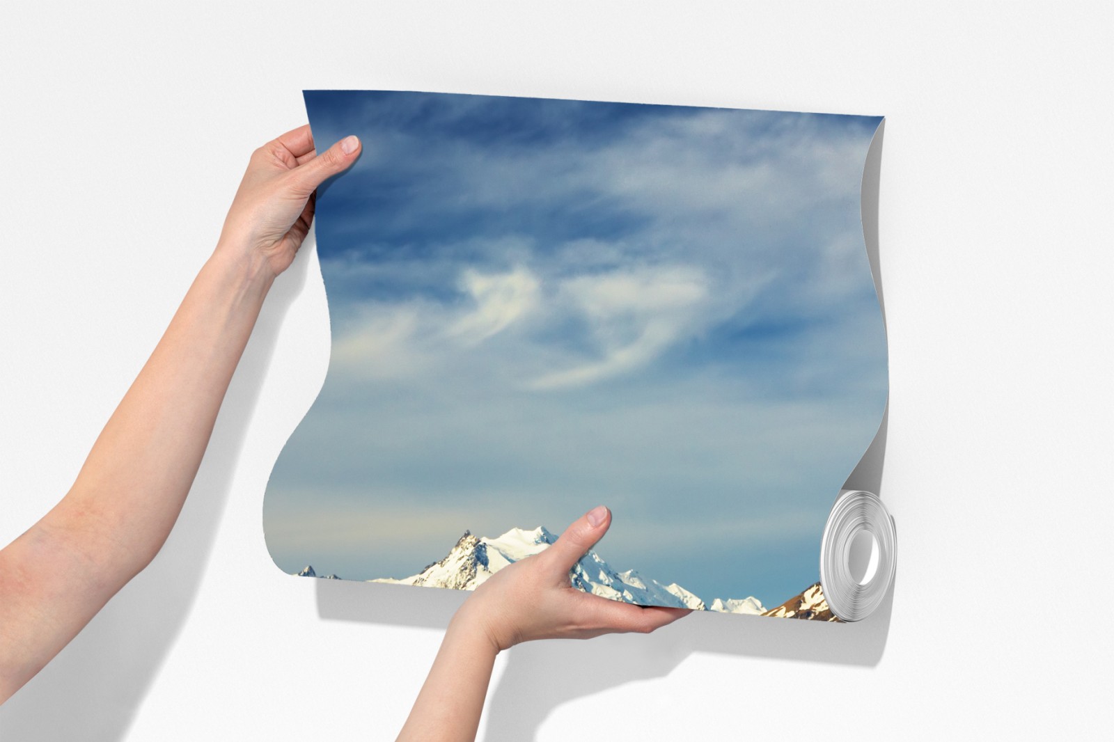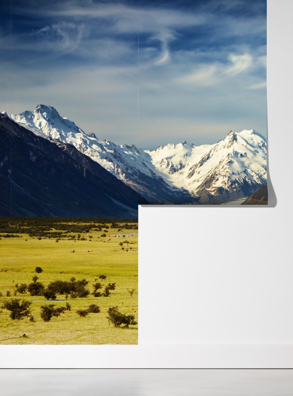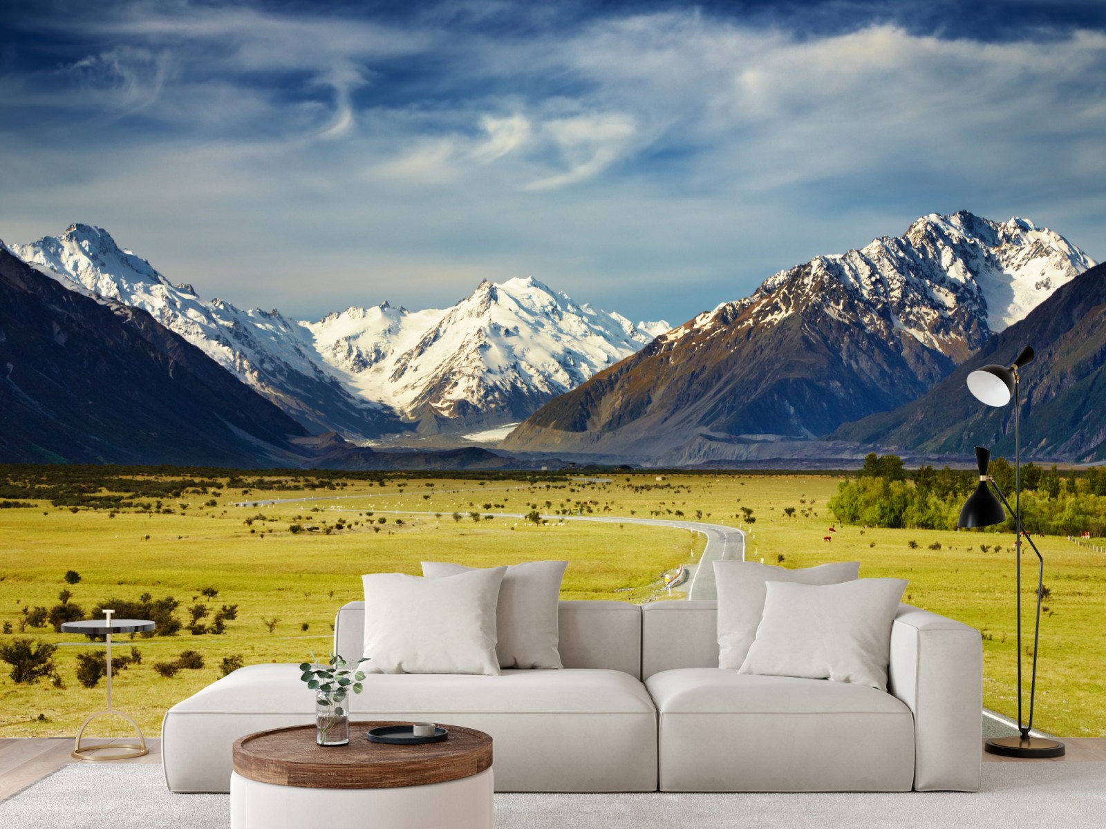 Wprowadź surowe piękno Alp Południowych do wnętrza dzięki temu dramatycznemu pejzażowi z wijącą się drogą i ośnieżonymi szczytami.