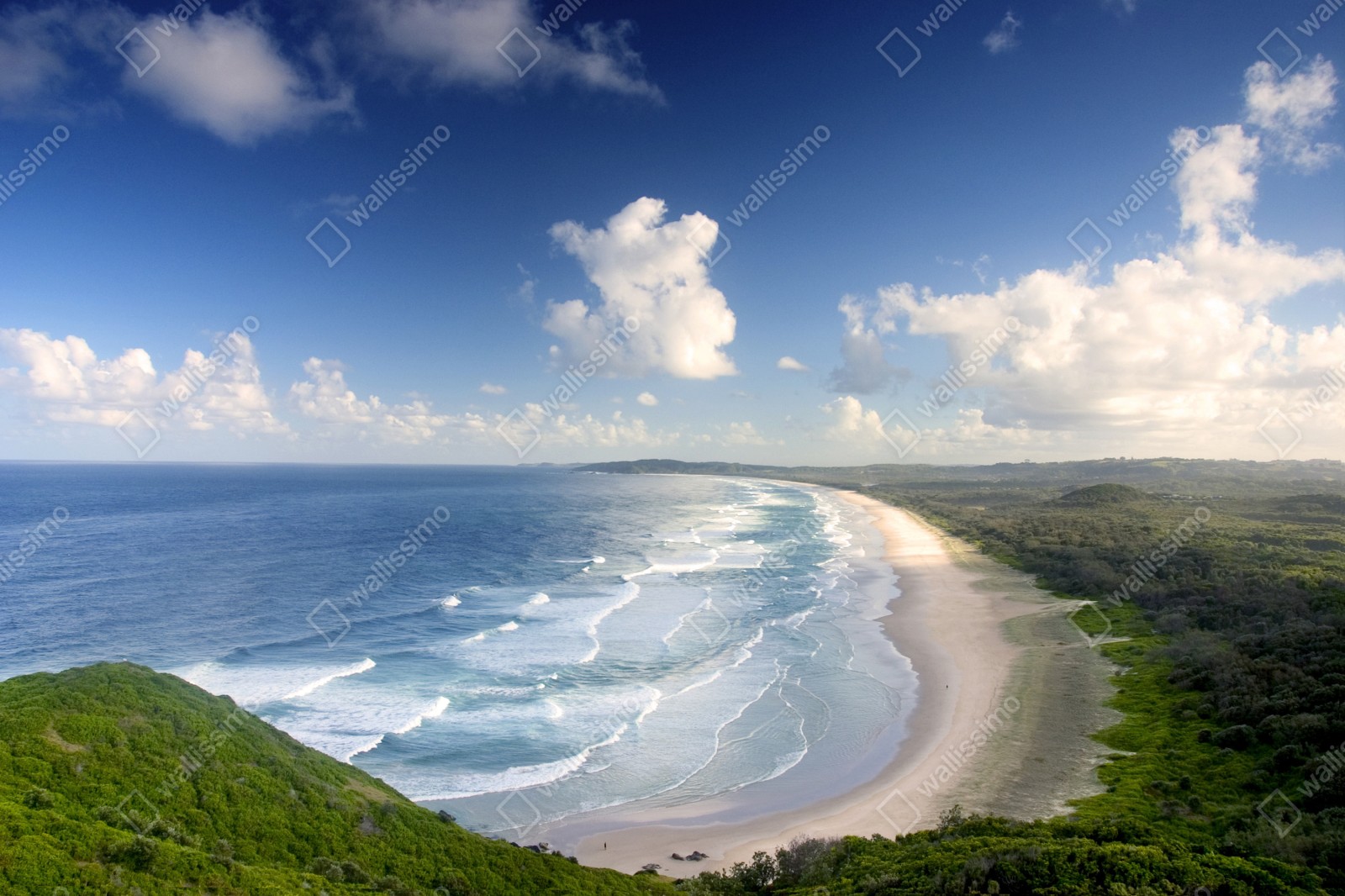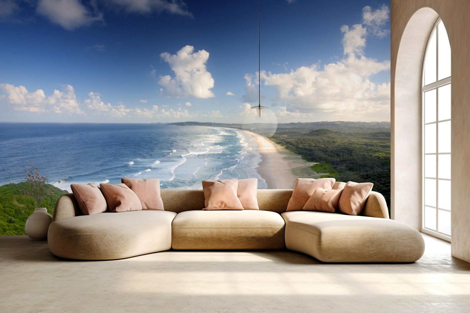 Wprowadź spokojną przestrzeń Byron Bay do swojego wnętrza dzięki tej szerokiej panoramie wybrzeża, idealnej jako relaksujący element dekoracyjny.