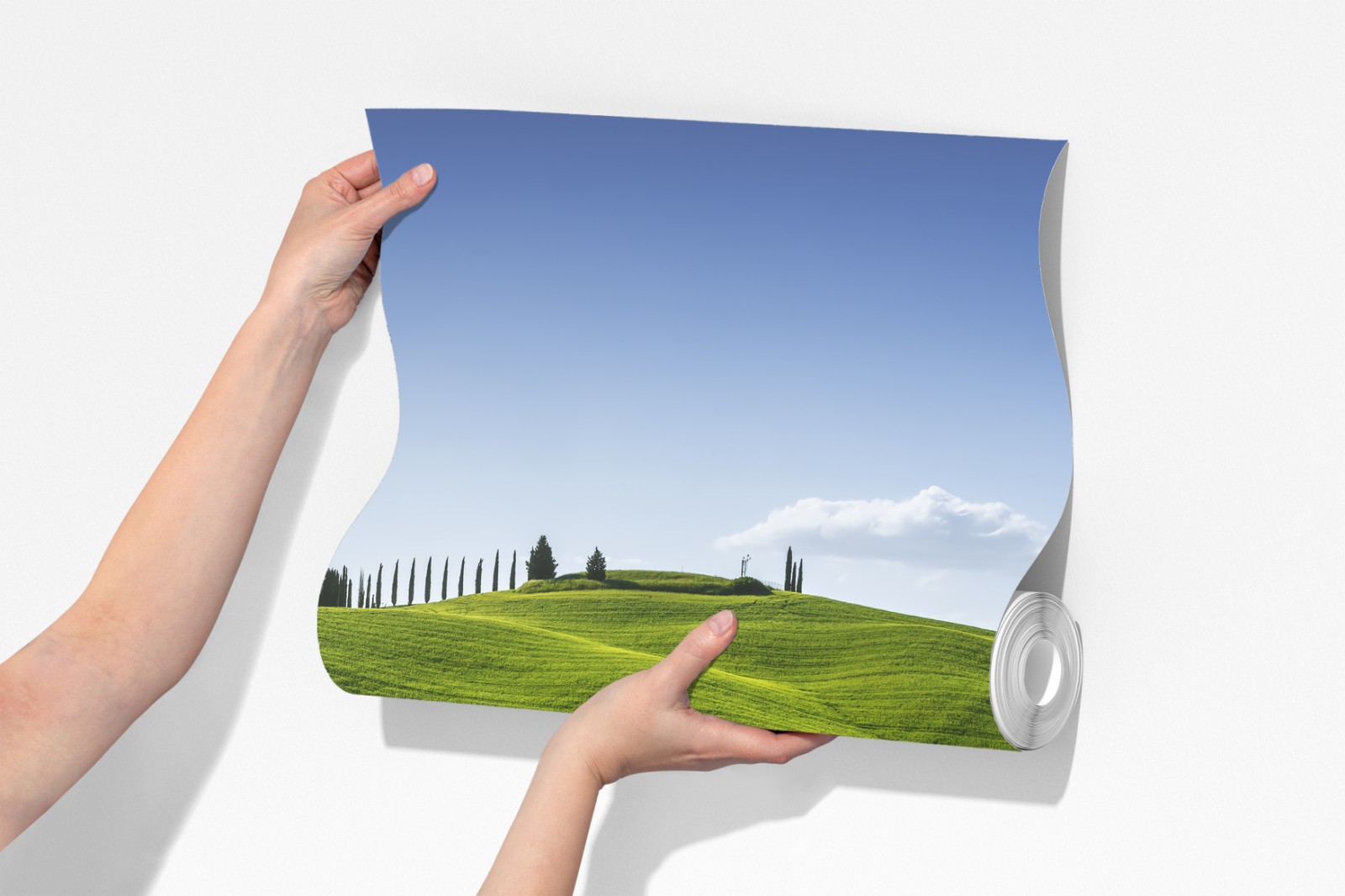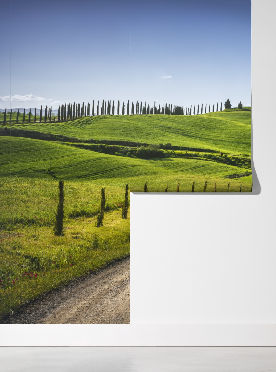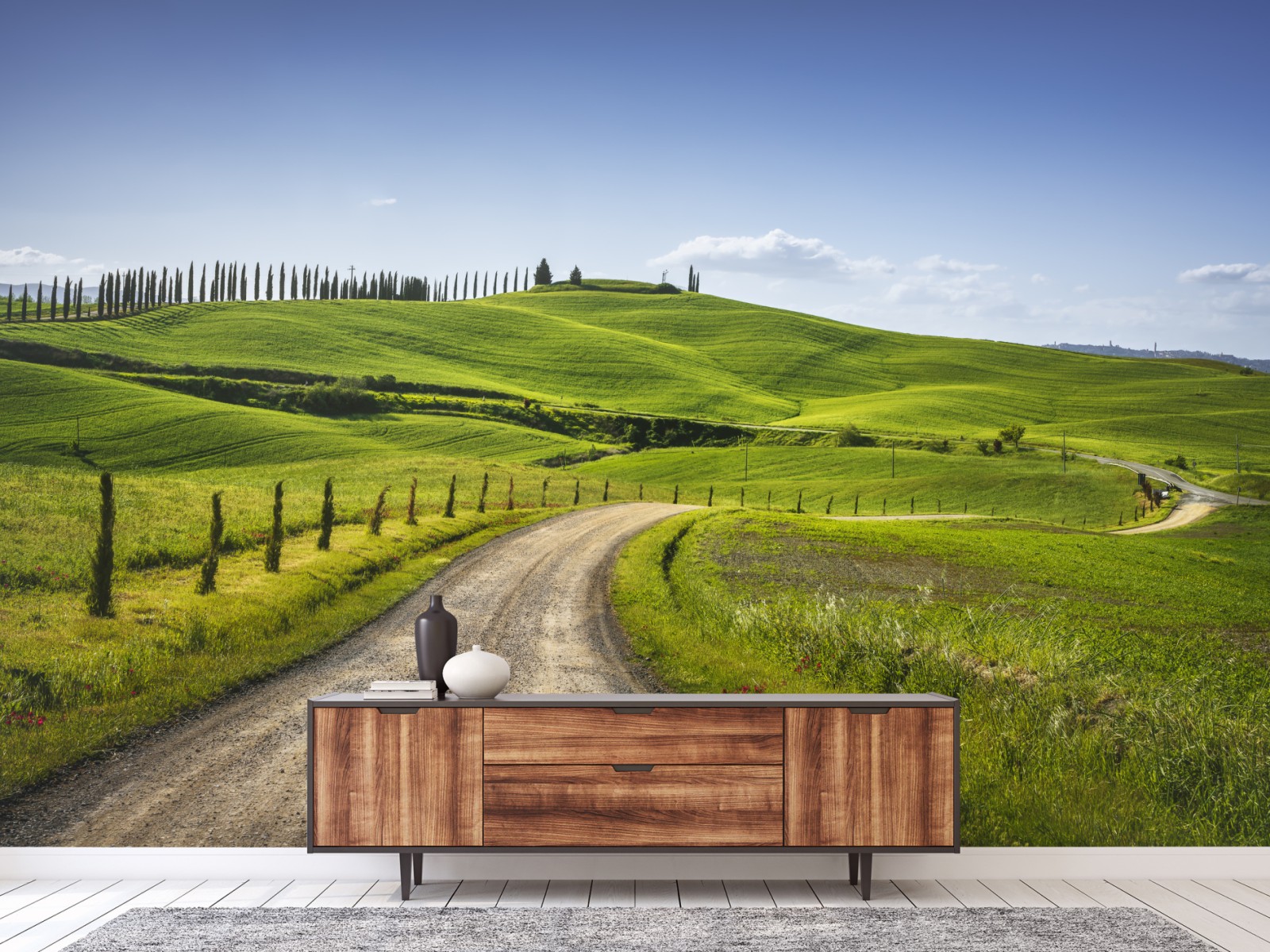 Wprowadź spokojną urodę Toskanii do wnętrza dzięki panoramicznemu widokowi krętej drogi przez zielone wzgórza.