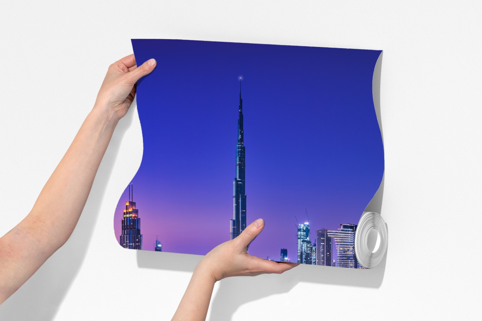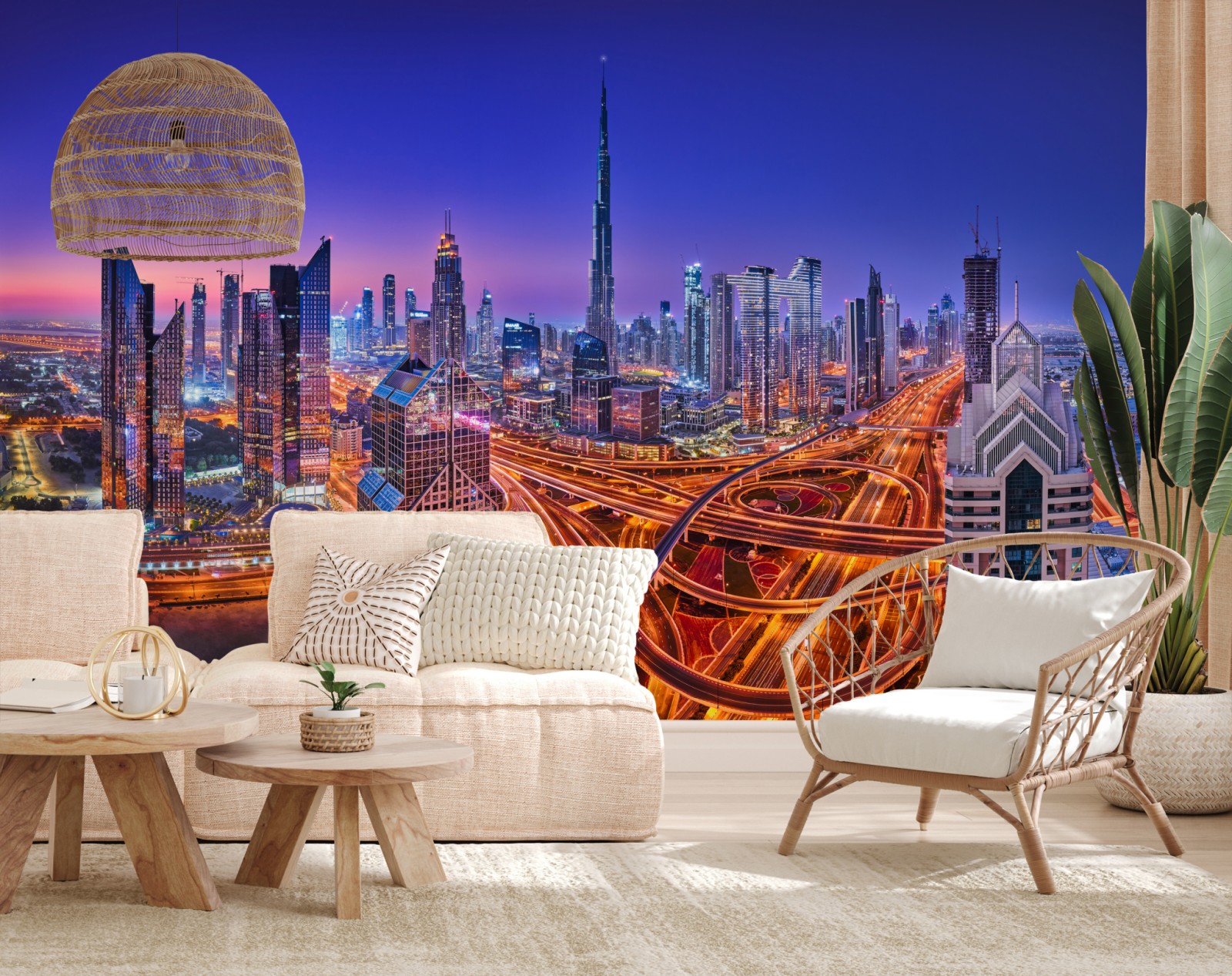 Poczuj tętno Dubaju dzięki tej zachwycającej panoramie miasta o zmierzchu z Burj Khalifa i rozświetlonymi autostradami.