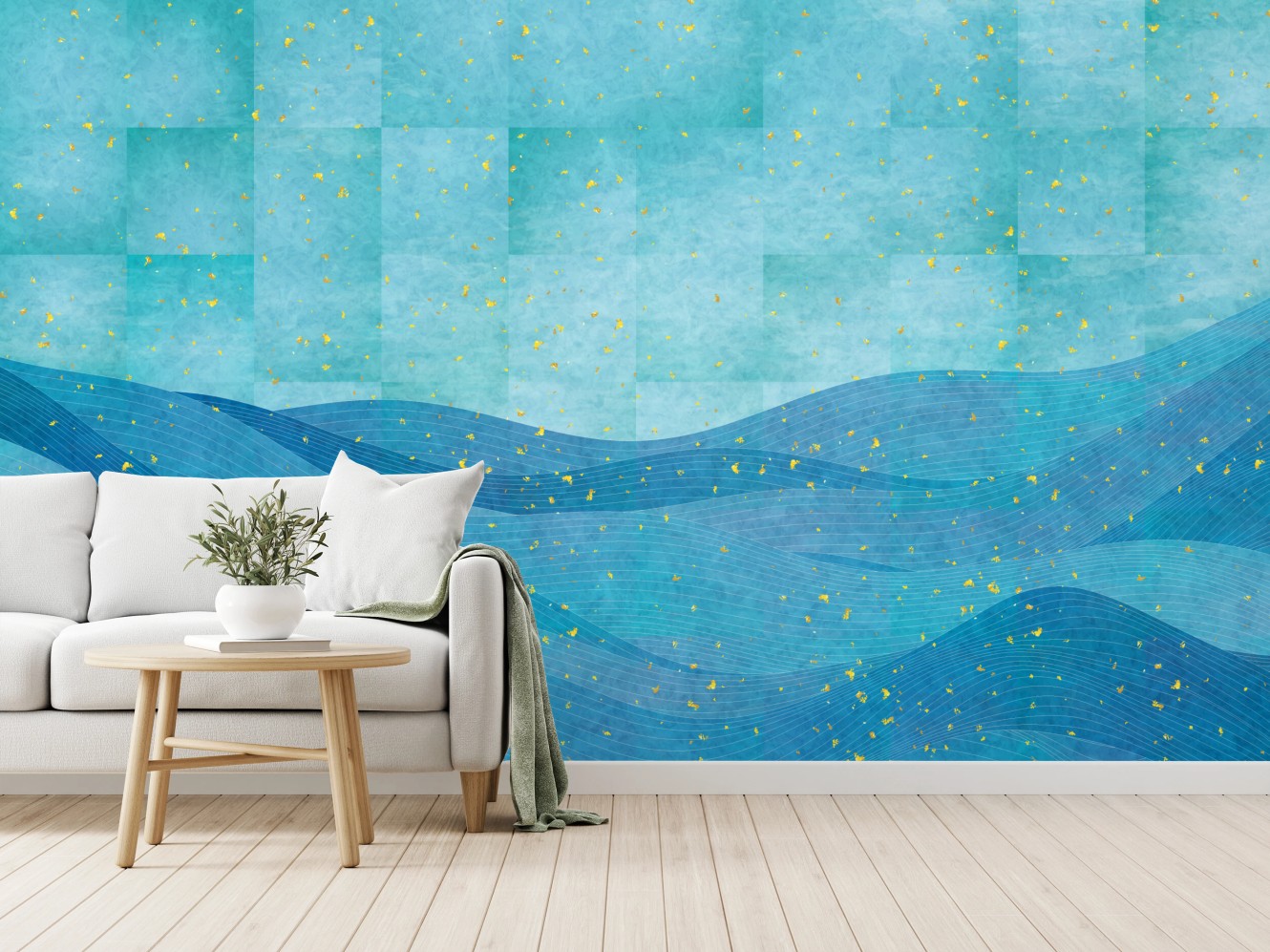 - ocean, abstrakcja, turkusowy, wzór, minimalistyczny, tekstura, akwarela, niebieski, fale, złote drobinki