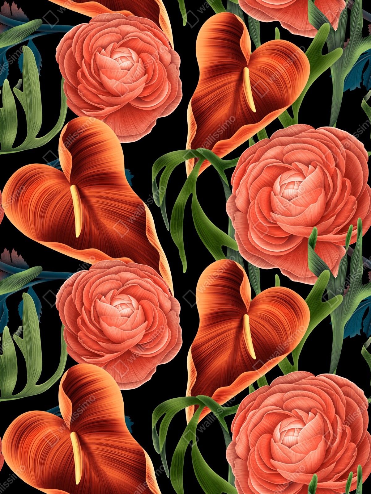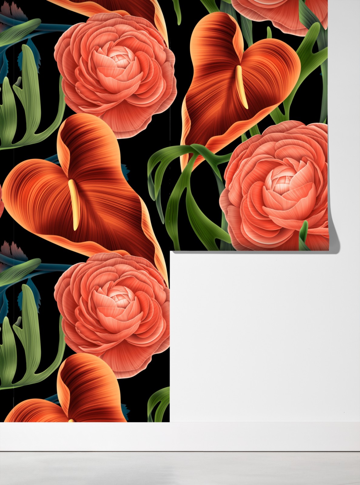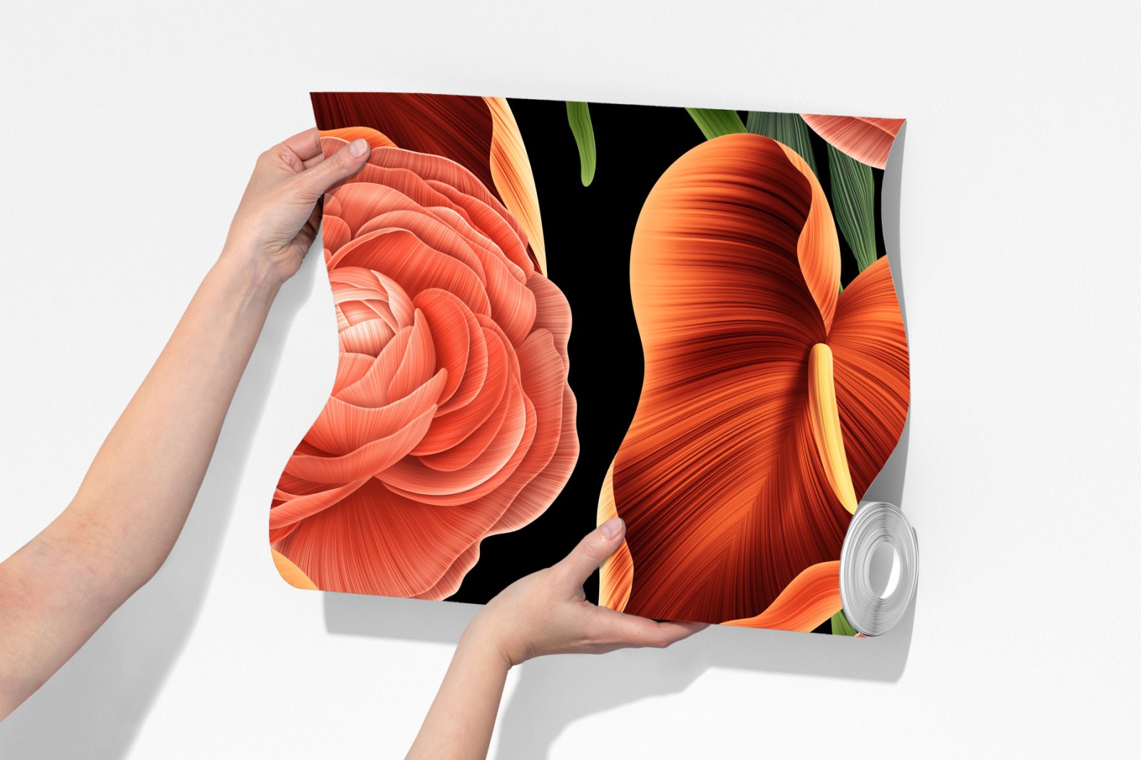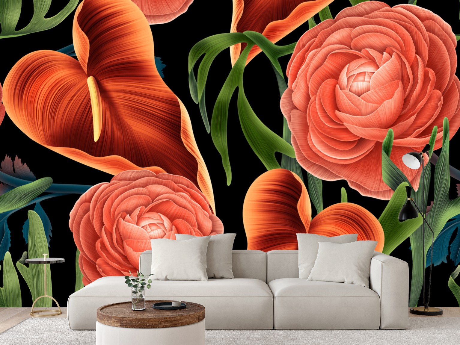 Wprowadź odważną botanikę do wnętrza dzięki intensywnemu koralowemu wzorowi kwiatowemu na głębokim czarnym tle, idealnemu do nowoczesnych pomieszczeń.