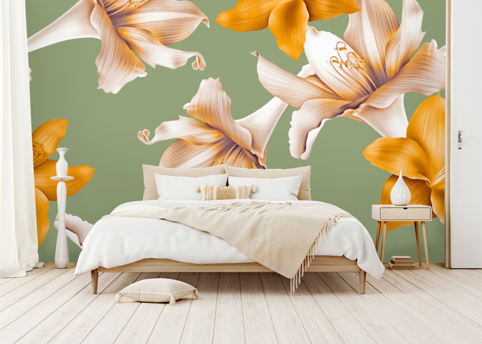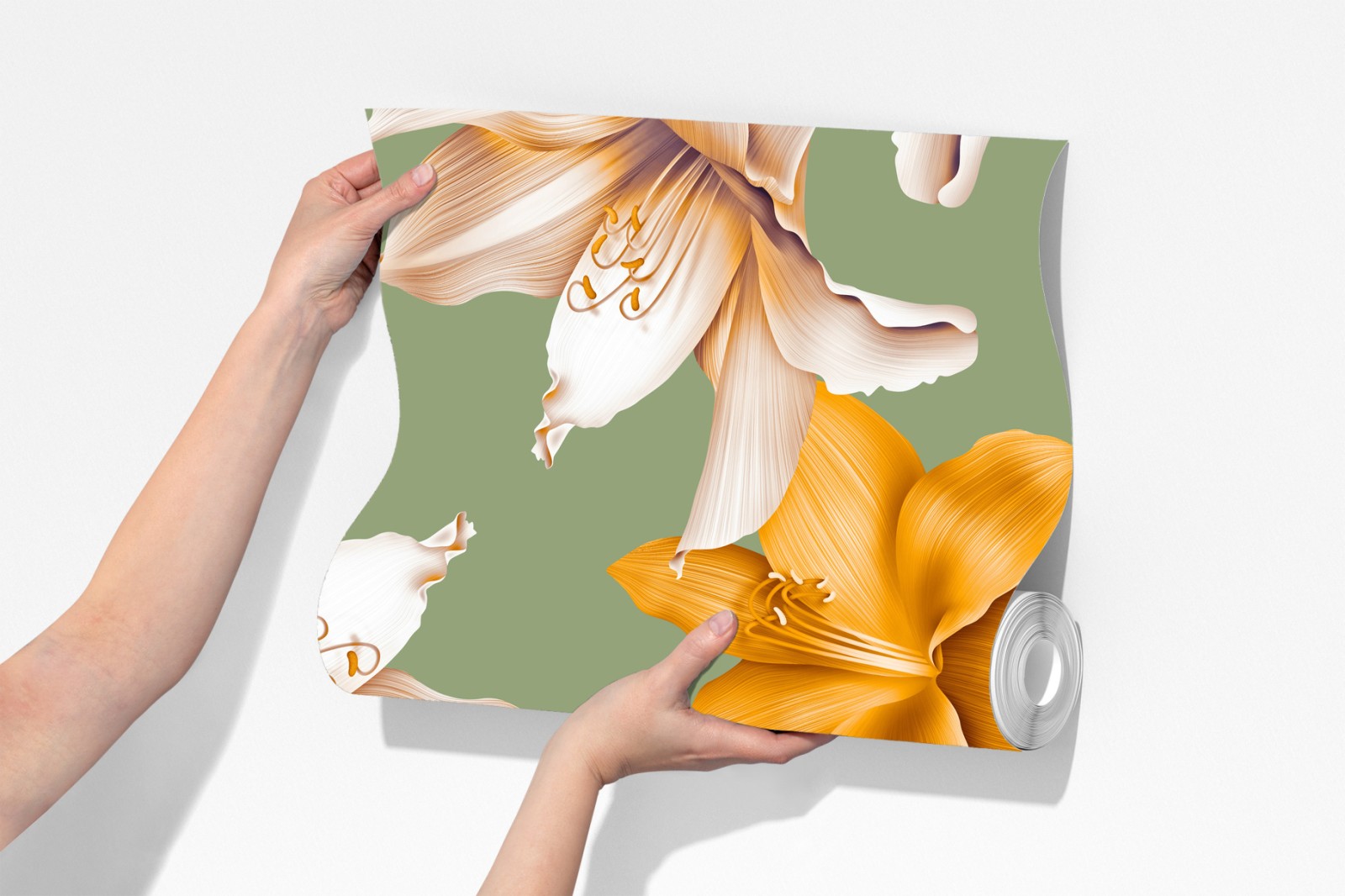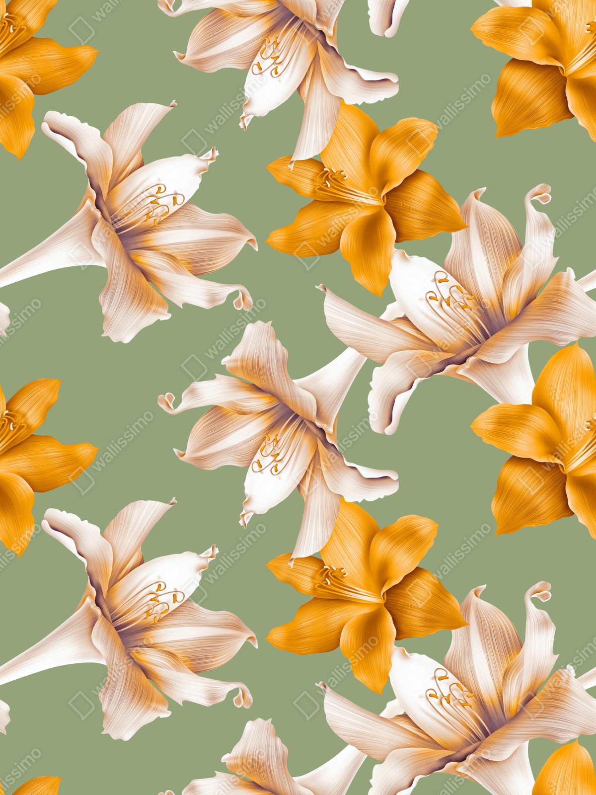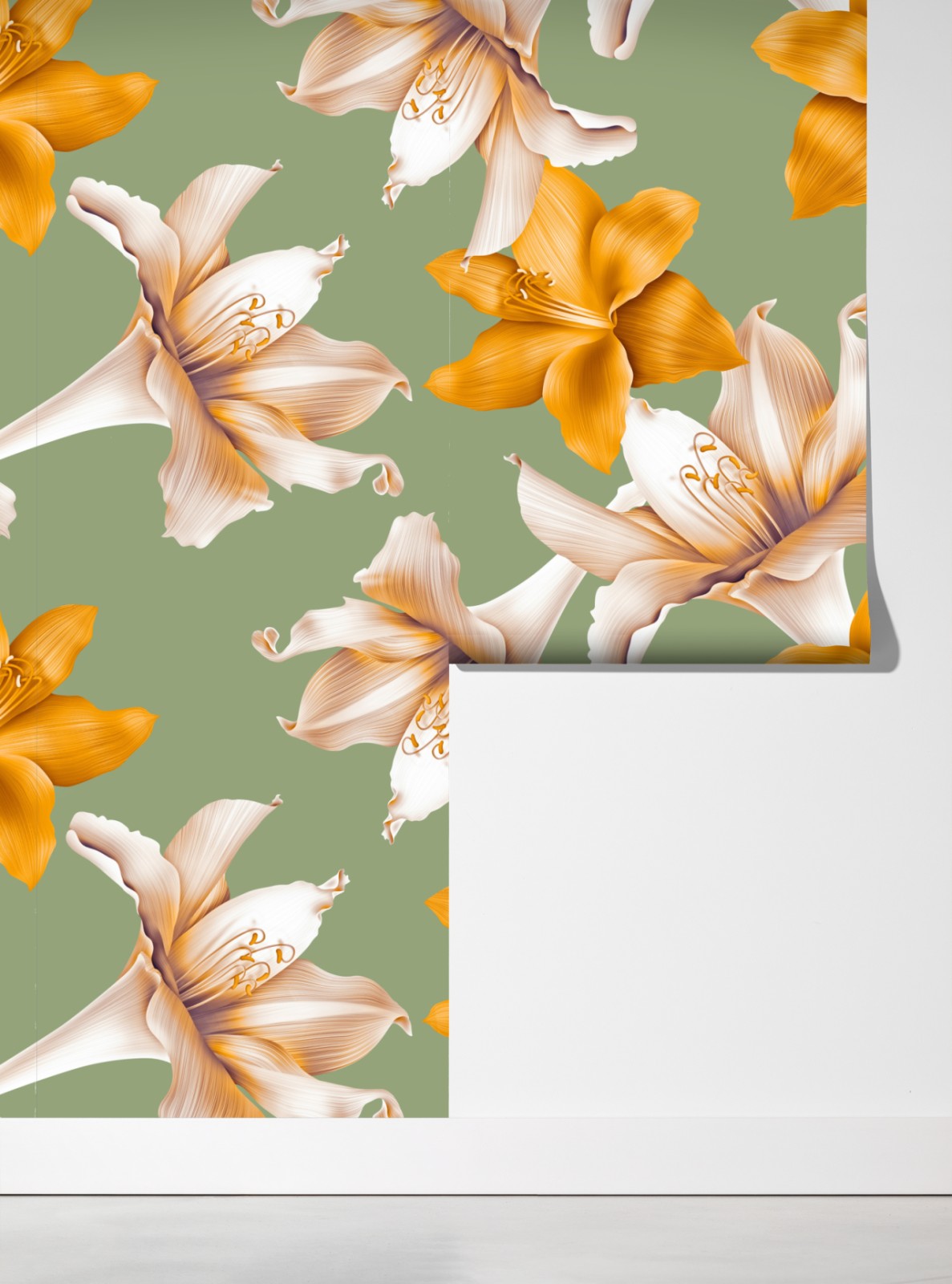 Wprowadź naturę do wnętrza dzięki eleganckiemu wzorowi złotych lilii na miękkim zielonym tle, idealnemu do dodania świeżego, nowoczesnego akcentu.