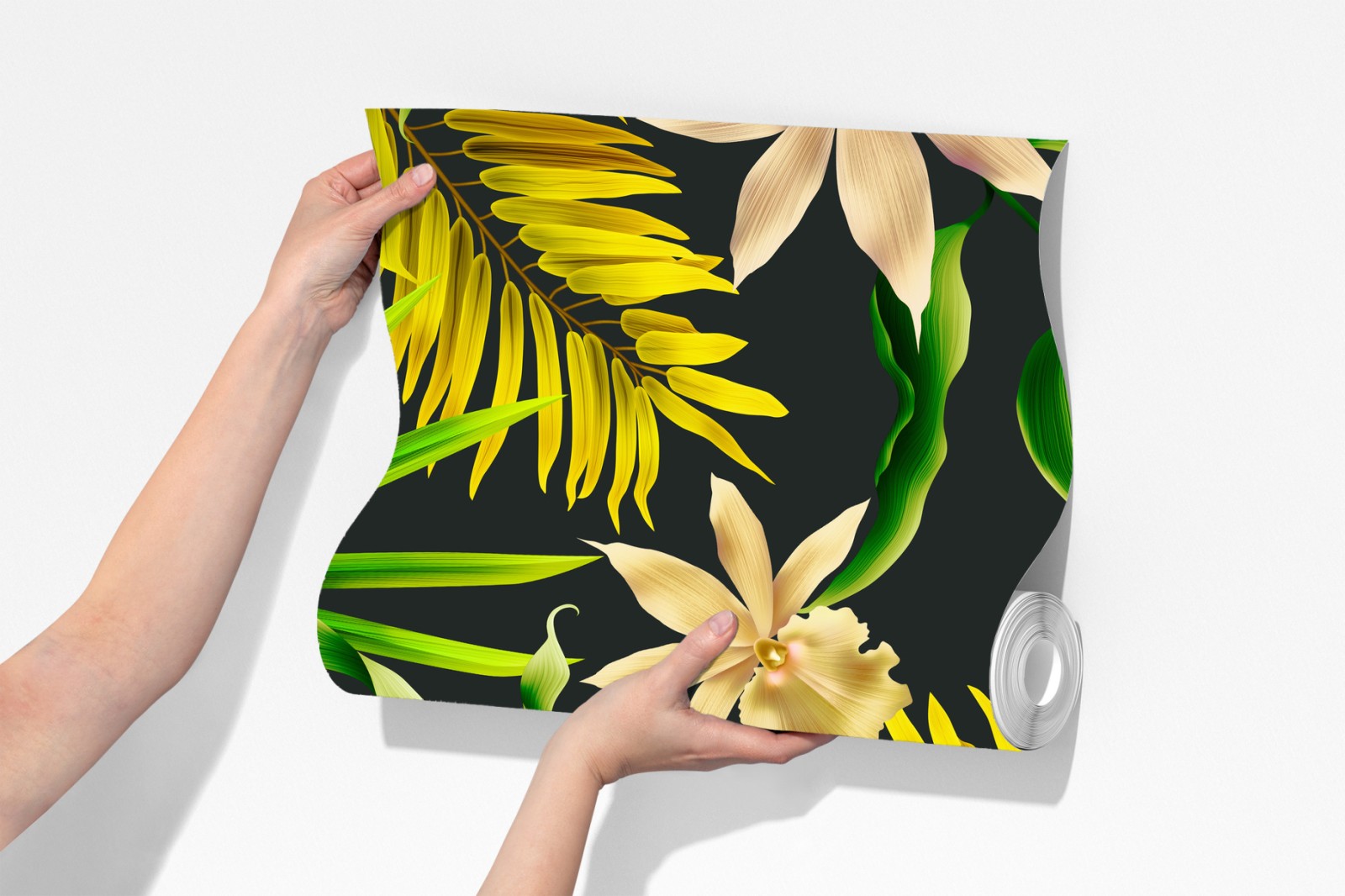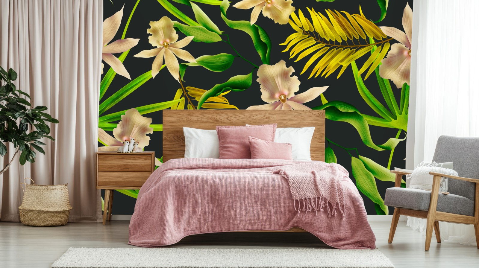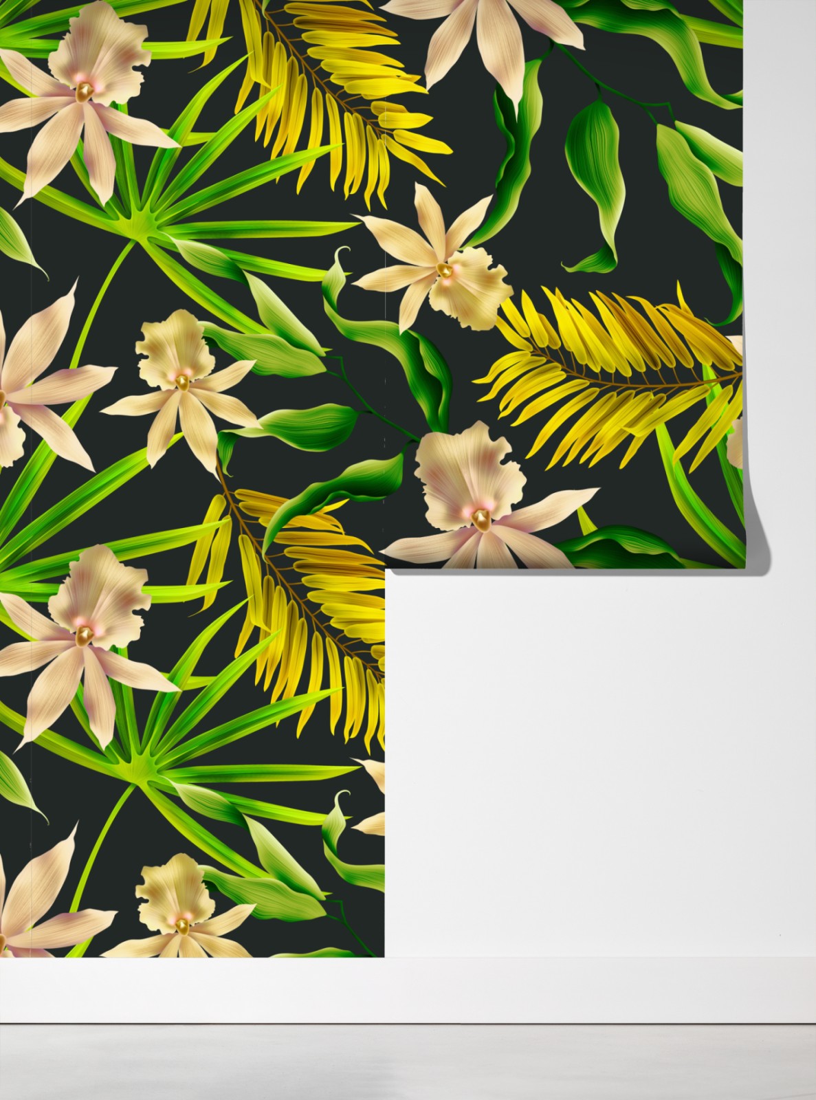 Doda wnętrzu tropikalnego charakteru dzięki eleganckiemu wzorowi storczyków i liści, idealny do ożywienia pomieszczeń.