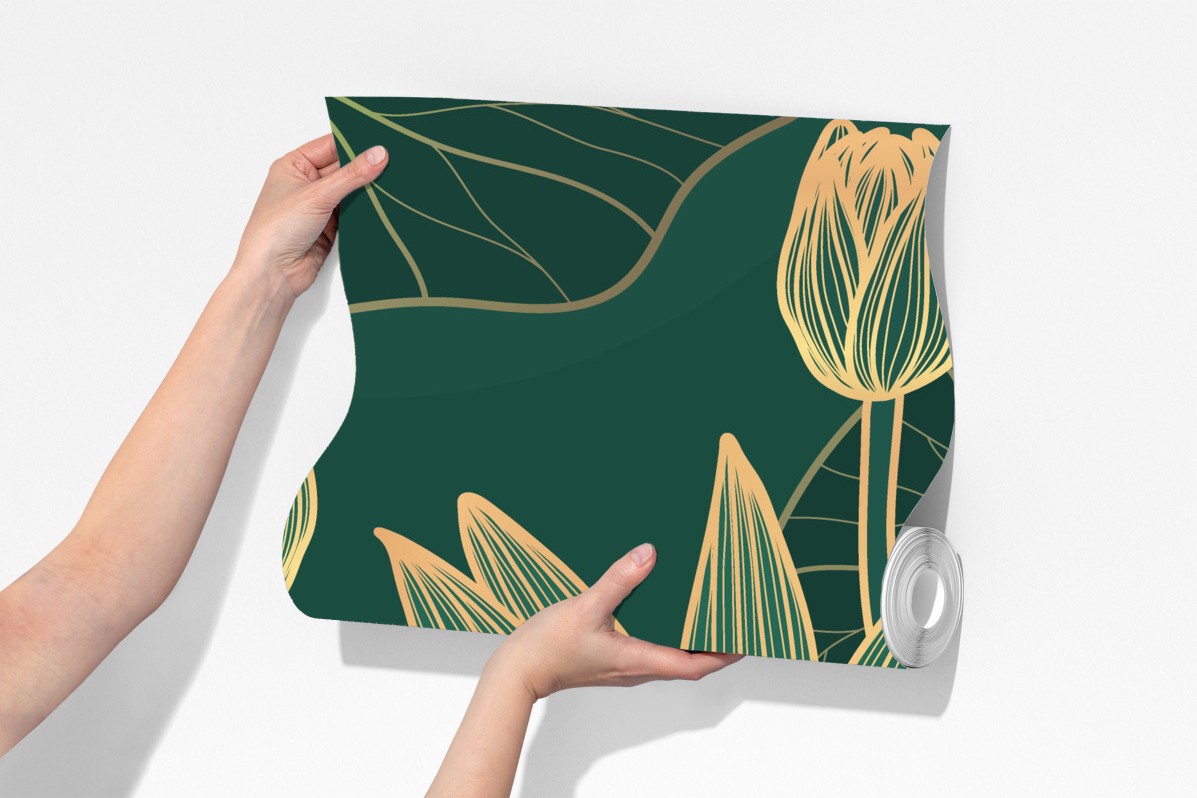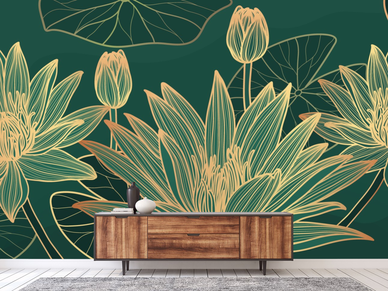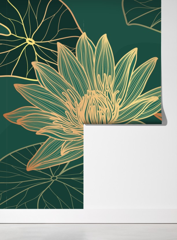 Eleganckie złote kontury kwiatów lotosu na głębokim zielonym tle wprowadzają do wnętrza spokój i szyk.