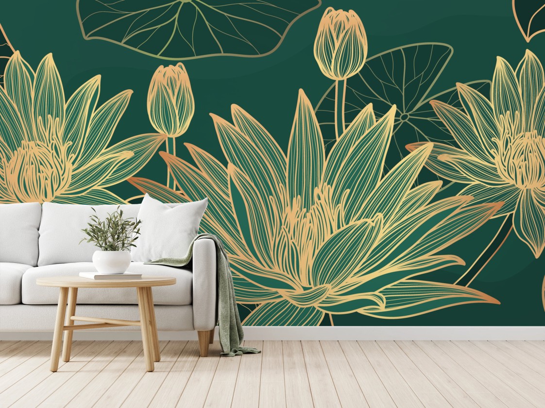Fototapeta Złote kwiaty lotosu na zielonym tle