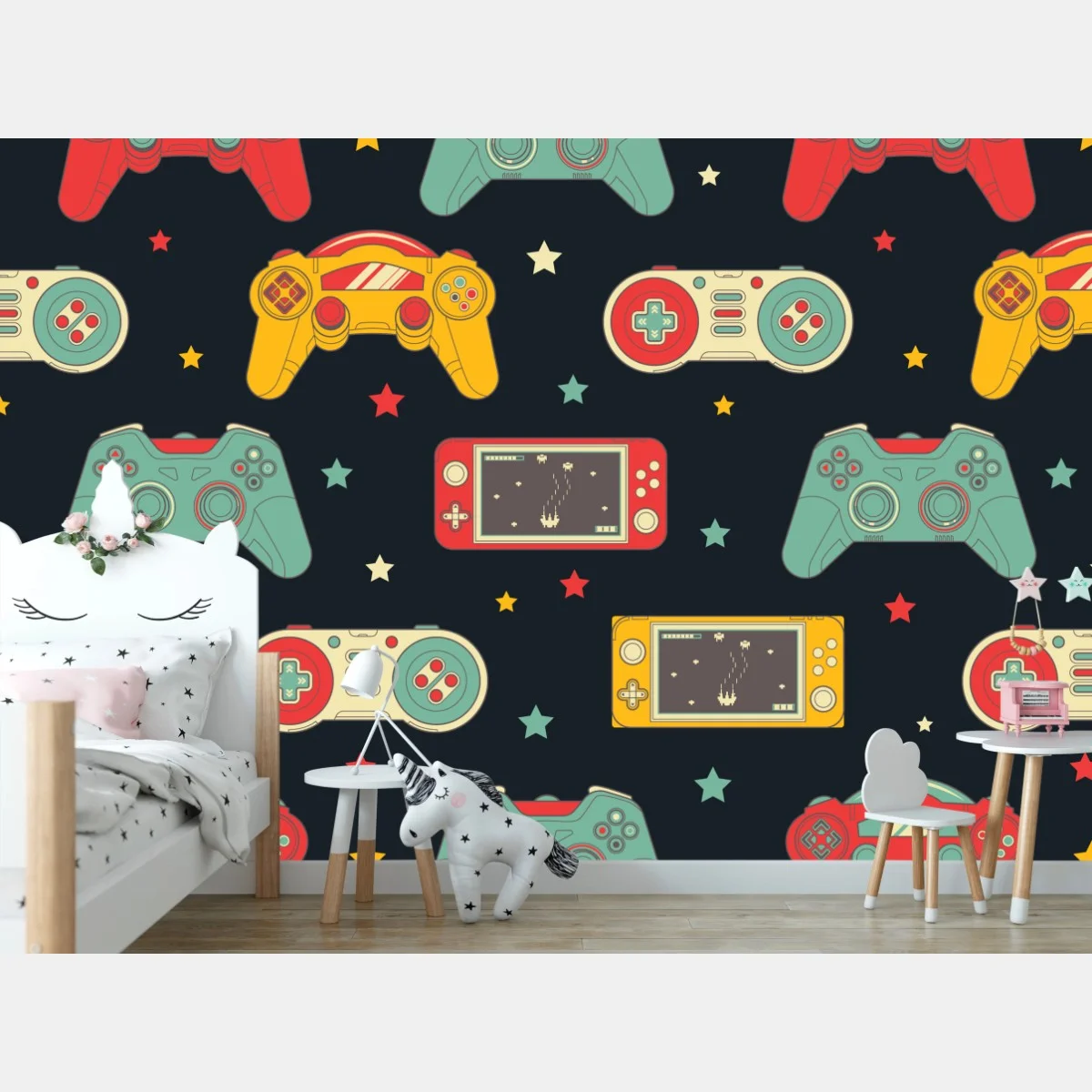 - retro, wzór, bezszwowy, gwiazdki, gry wideo, joystick, kontrolery, pady, konsola przenośna, nostaligia