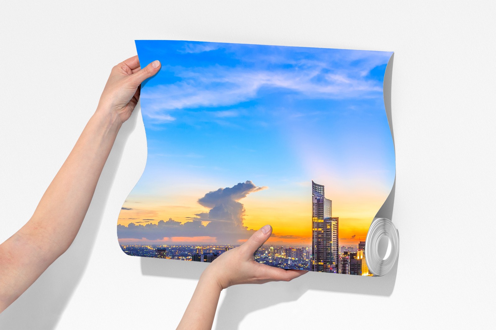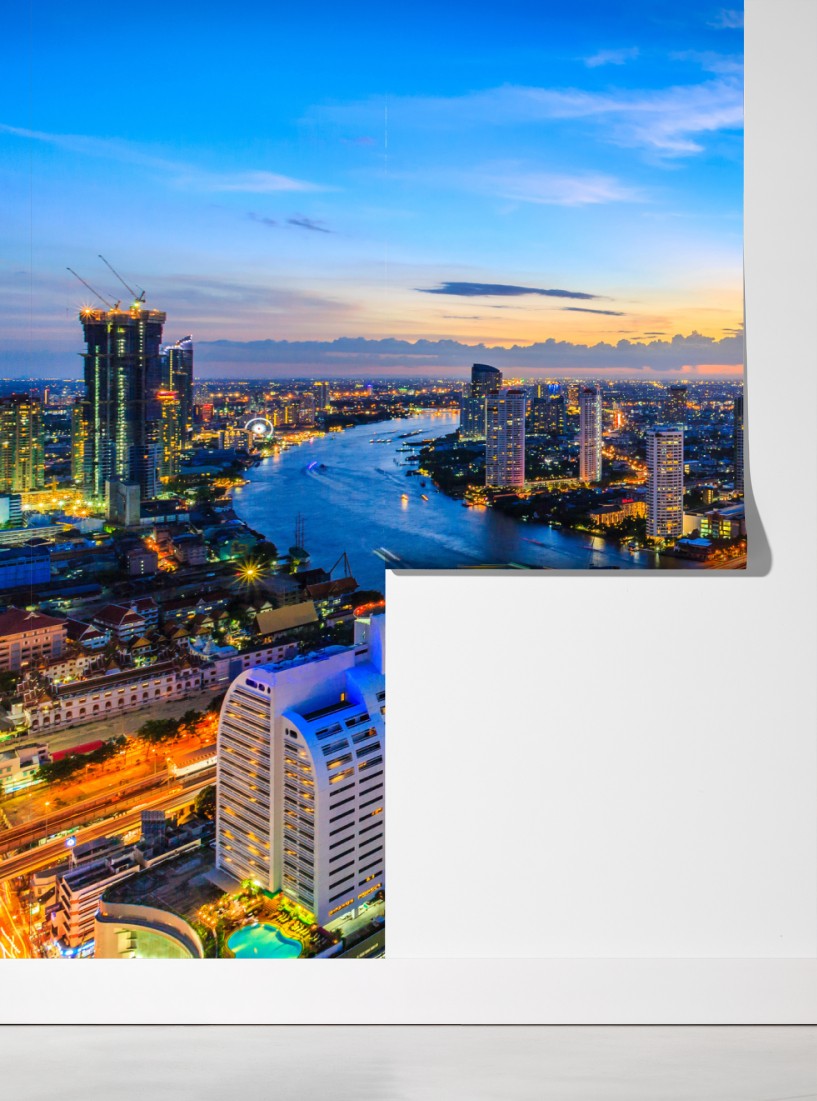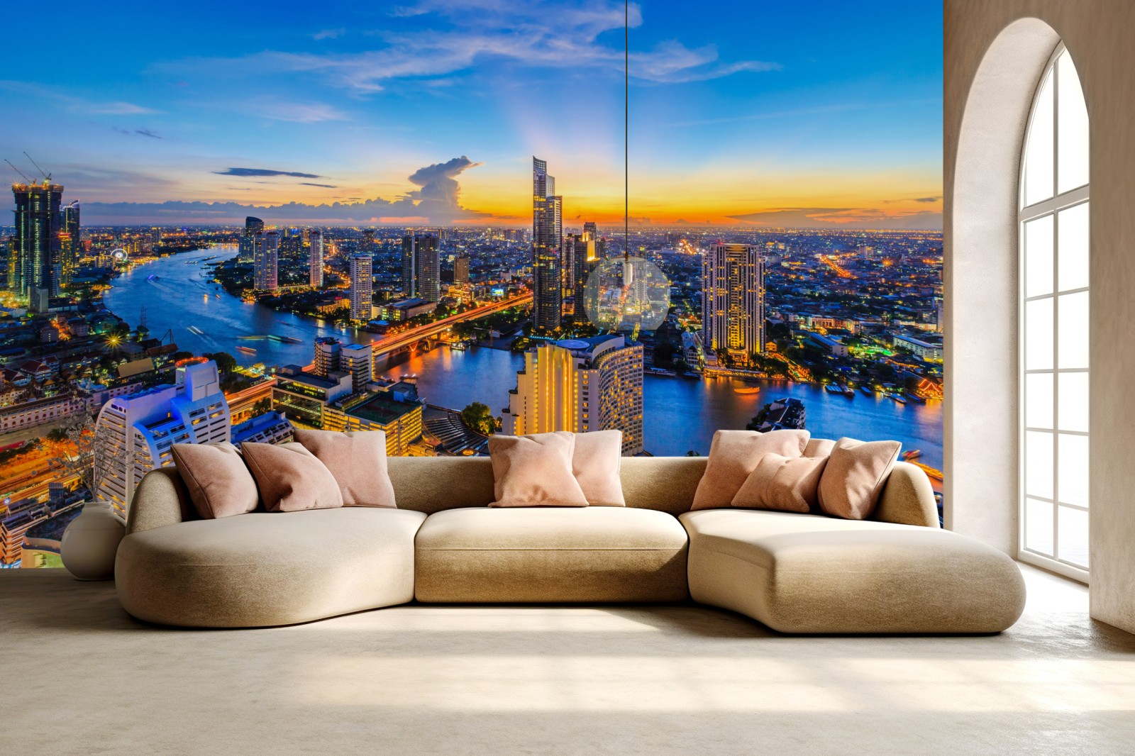 Wprowadź energię nowoczesnej metropolii do wnętrza dzięki tej żywej panoramie miasta o zachodzie słońca, z oświetlonymi wieżowcami i wijącą się rzeką.