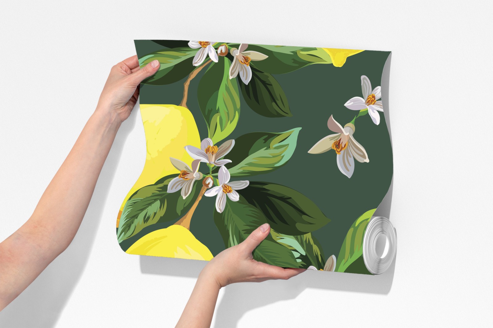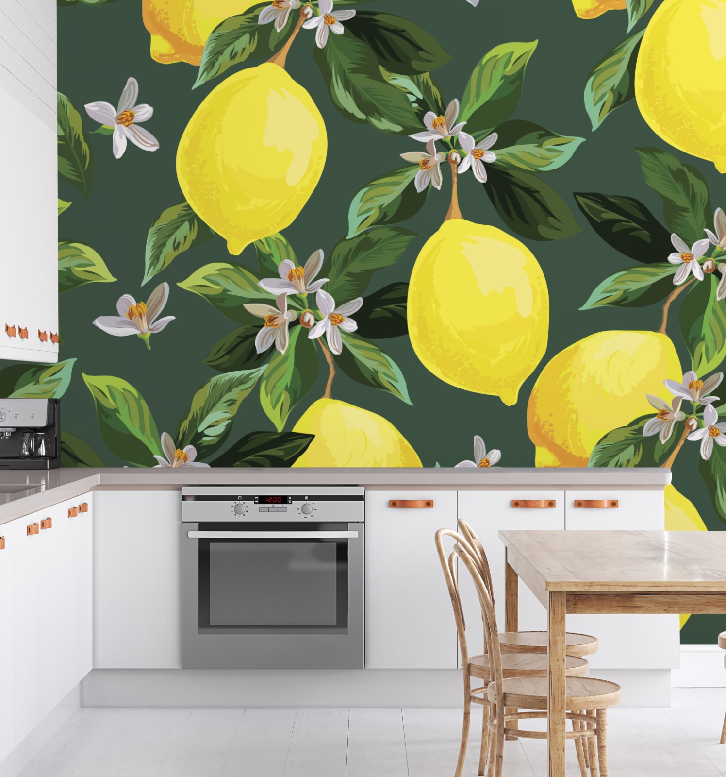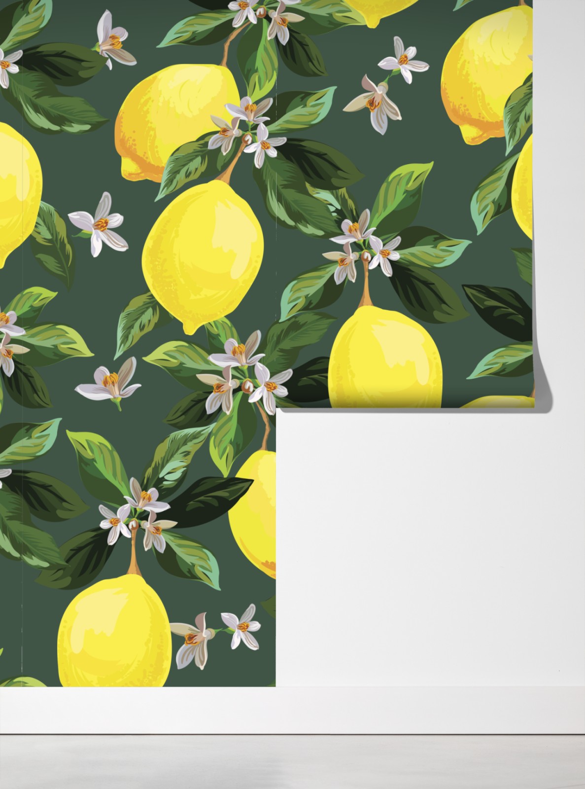 Dodaj świeży, słoneczny akcent do wnętrza dzięki tej żywej ilustracji cytryn i kwiatów na ciemnozielonym tle, idealnej do kuchni.