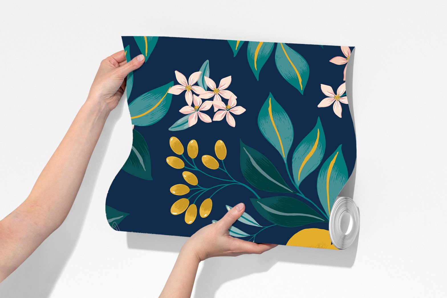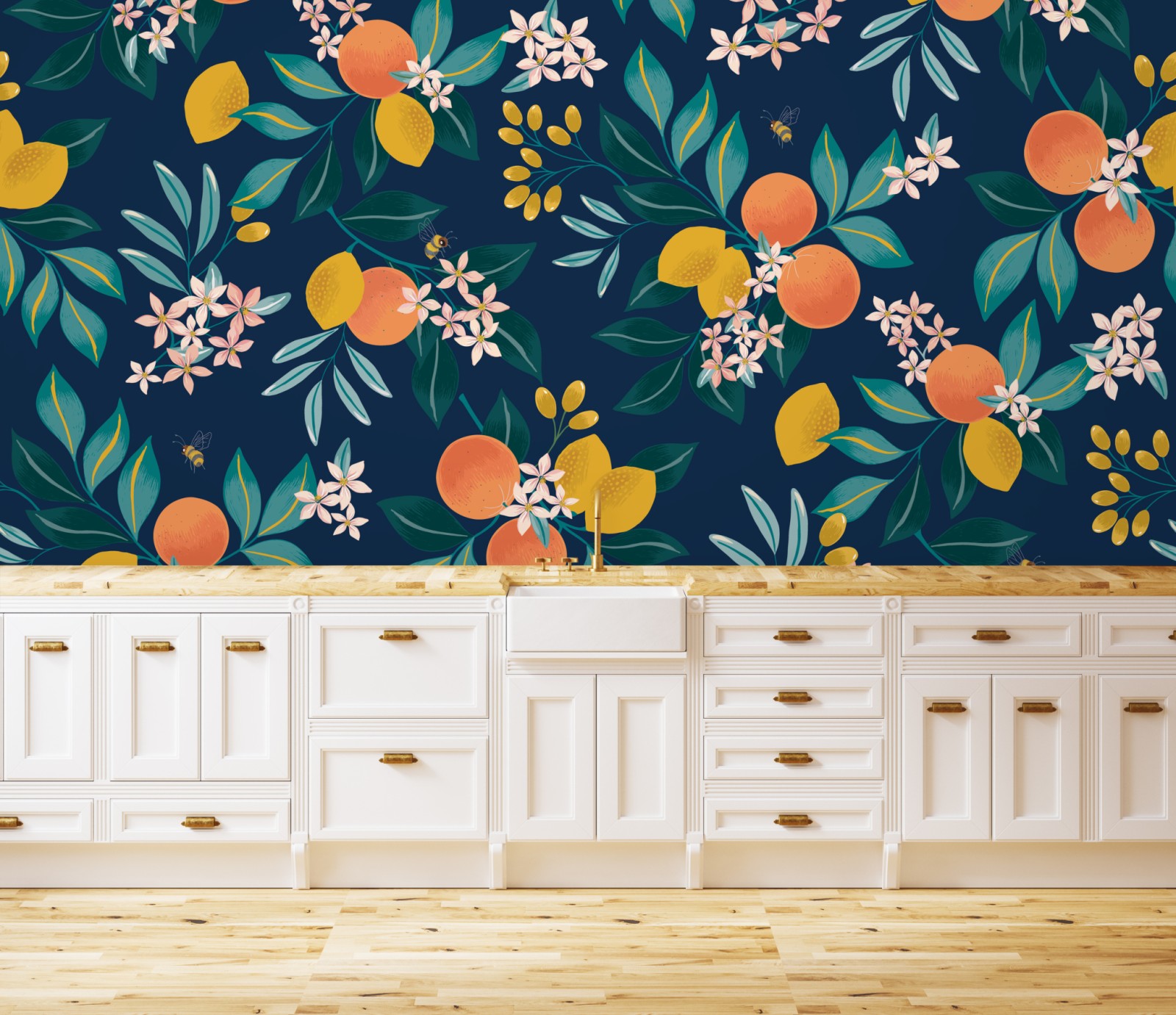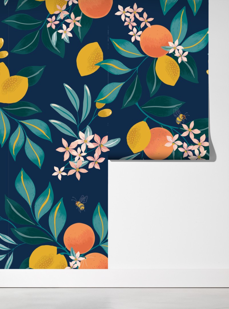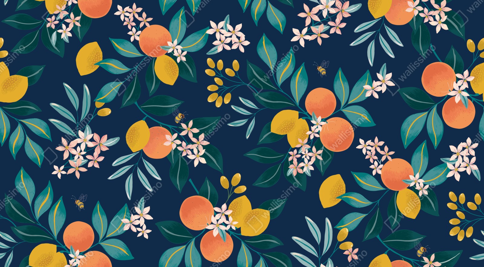 Dodaj świeżości i kolorów dzięki ilustracji z kwitnącymi cytrusami na głębokim granatowym tle.
