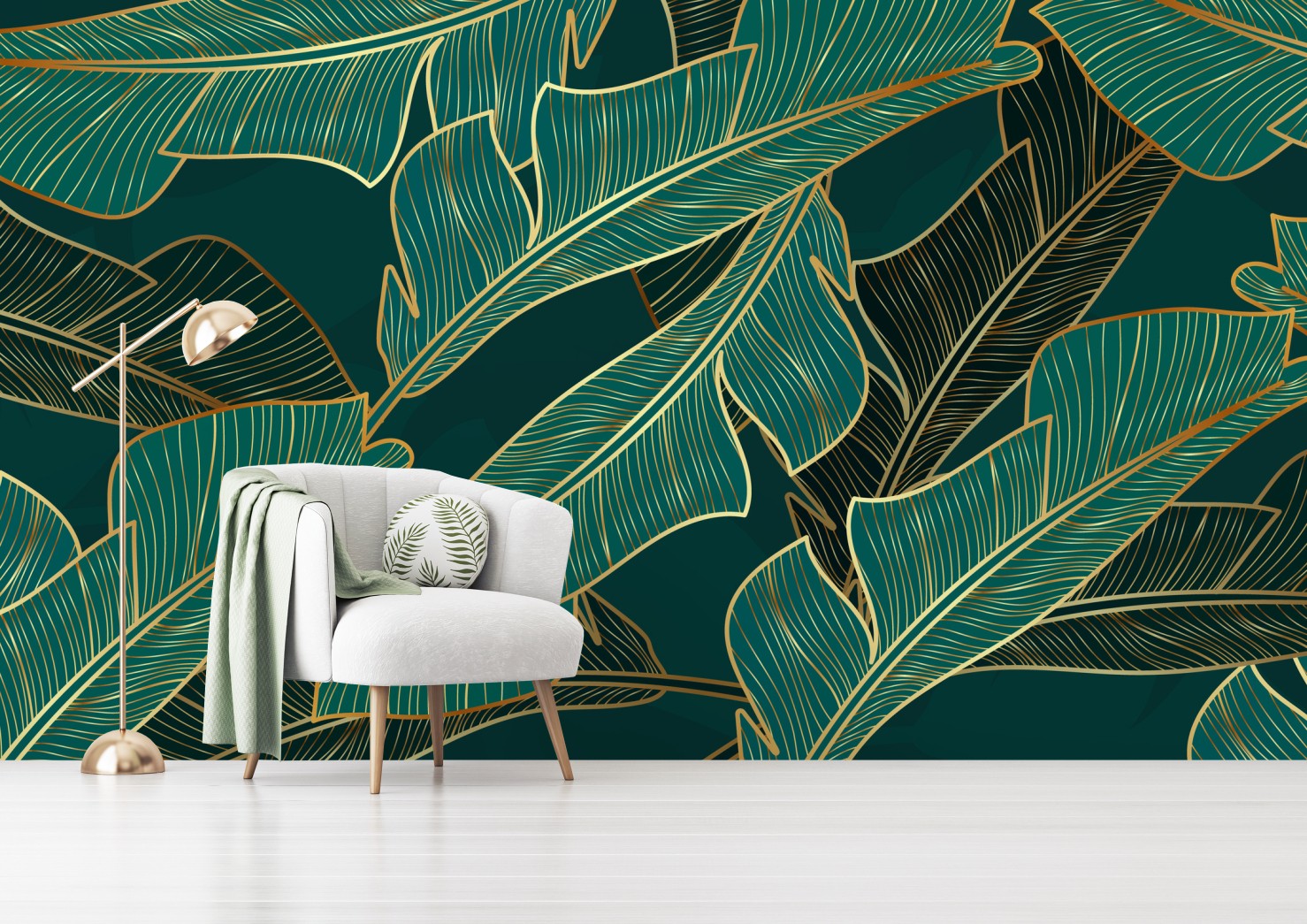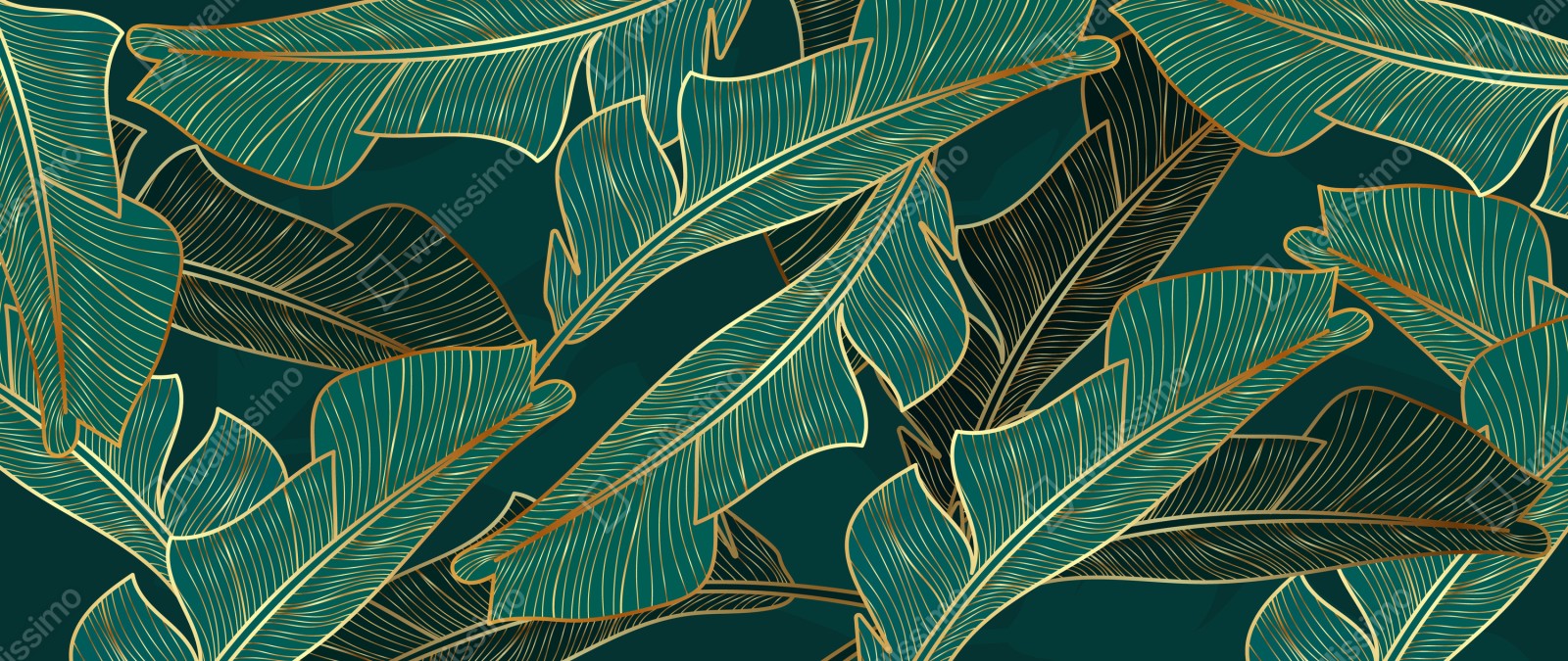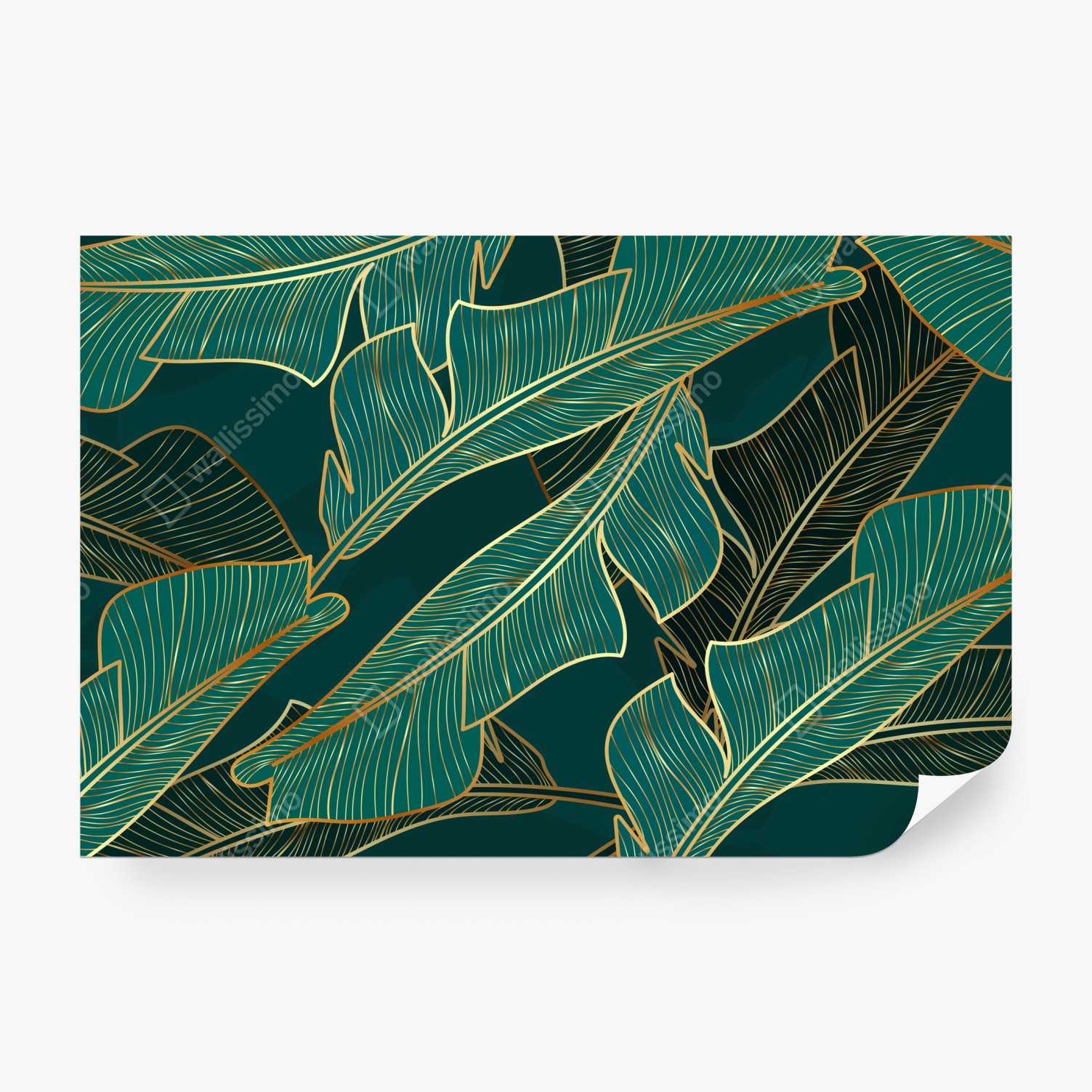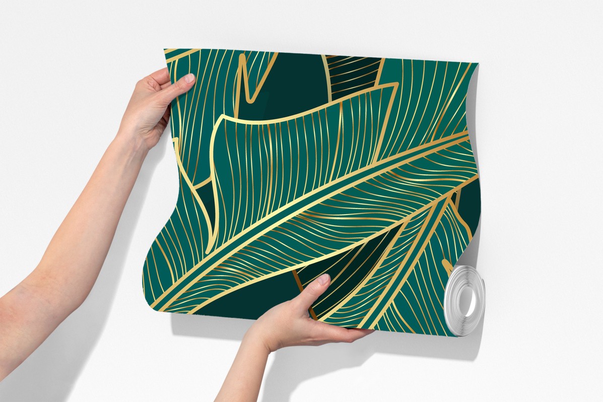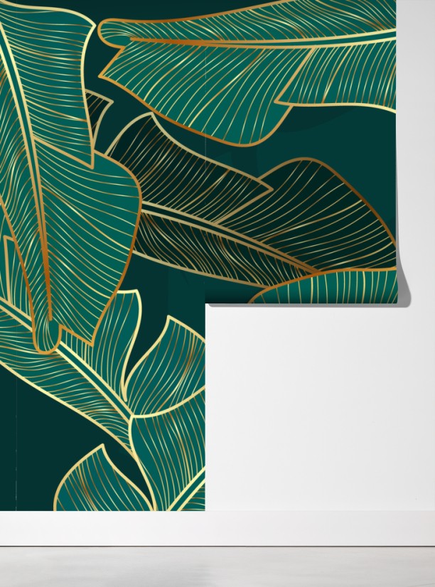 Ożyw swoje wnętrze luksusowym motywem tropikalnych liści w głębokim turkusie i złotych akcentach.