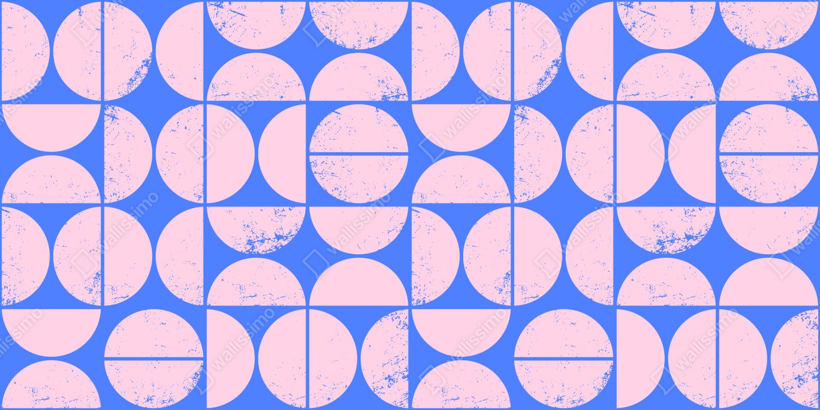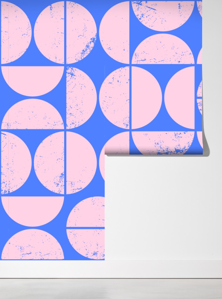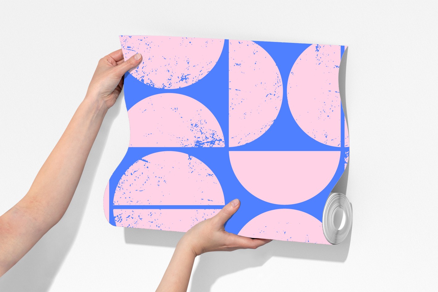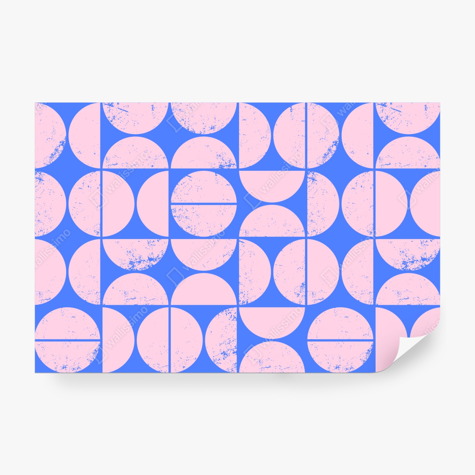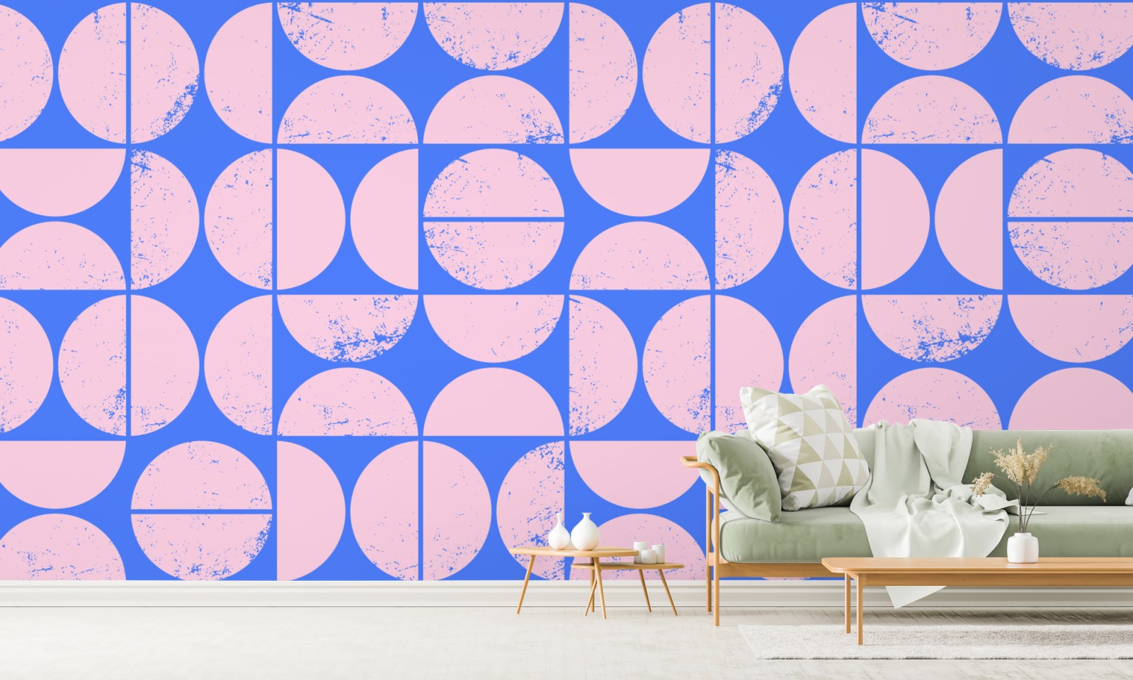 Dodaj nowoczesny retro charakter wnętrzu dzięki pastelowemu geometrycznemu wzorowi z różowymi kształtami na niebieskim tle.